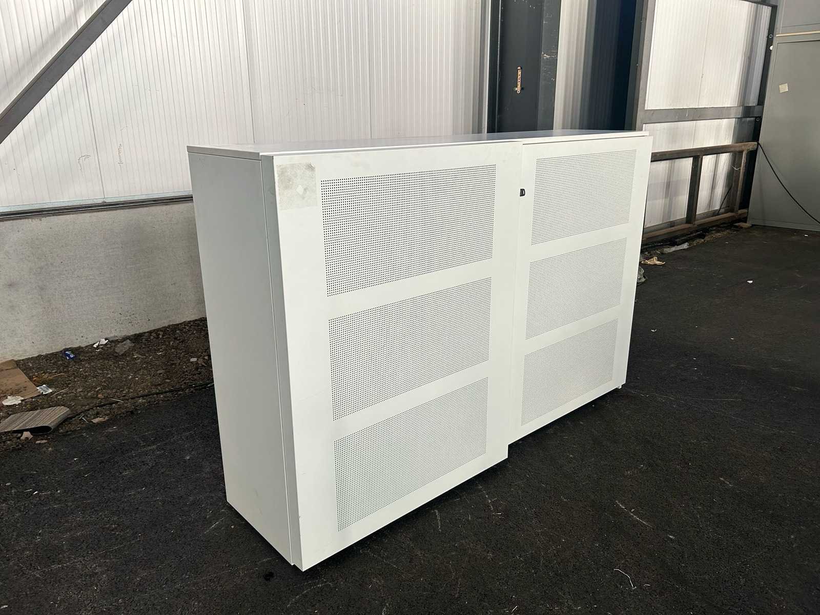 Lage metalen schuifdeurkast in witte uitvoering, voorzien van geperforeerde schuifdeuren en meerdere verstelbare legborden. Geschikt voor kantoor-, archief- of magazijnopslag. Gebruikte staat met lichte gebruikssporen. Nee Merk: AHREND Type: schuifdeurkast Kleur: wit Gewicht: 80kg Breedte: 180cm Hoogte: 124cm Diepte: 50cm Materiaal: metaal