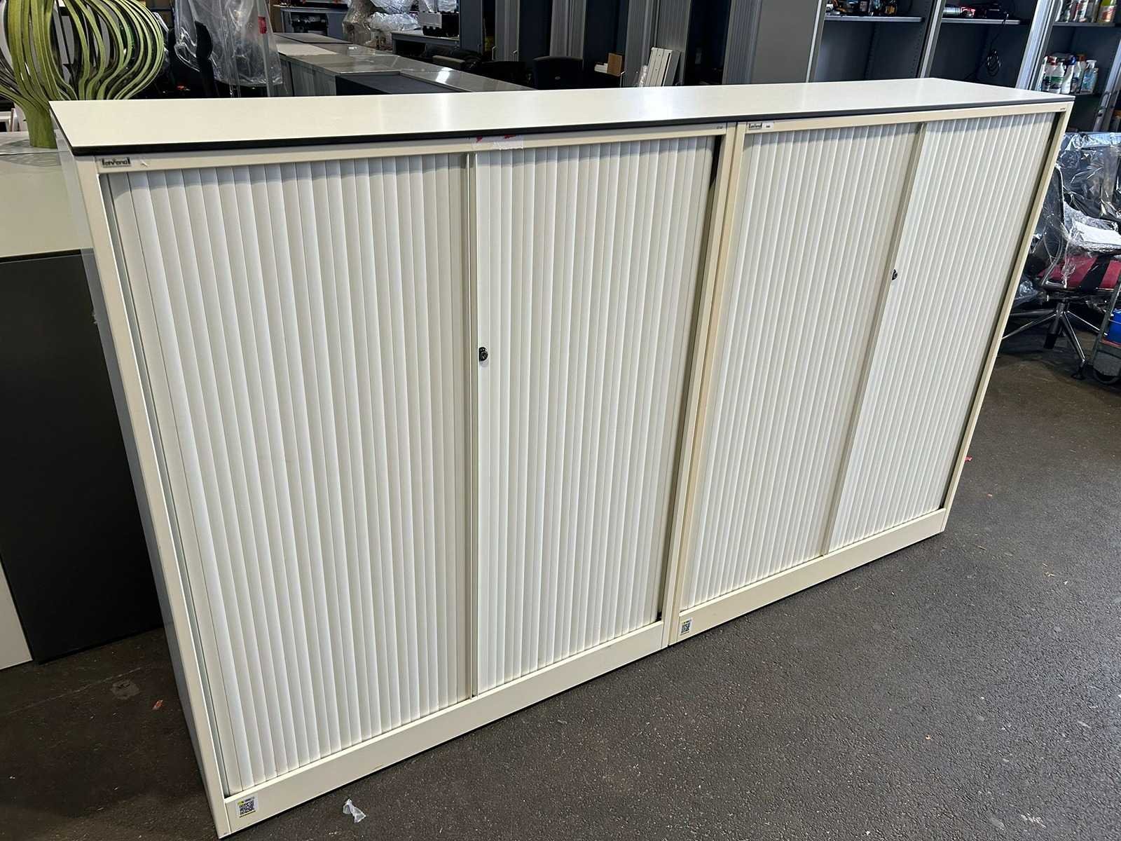 Dubbele roldeurkast AHREND met 1 topblad Afmetingen per dubbele kast: B240 H142X D45 kleur beige, lichte verkleuring mogelijk, 3 leggers per kast sleutel niet gegarandeerd gebruiksporen aanwezig Nee Merk: AHREND Type: Dubbele roldeurkast Kleur: beige Gewicht: 80kg Breedte: 240cm Hoogte: 142cm Diepte: 45cm