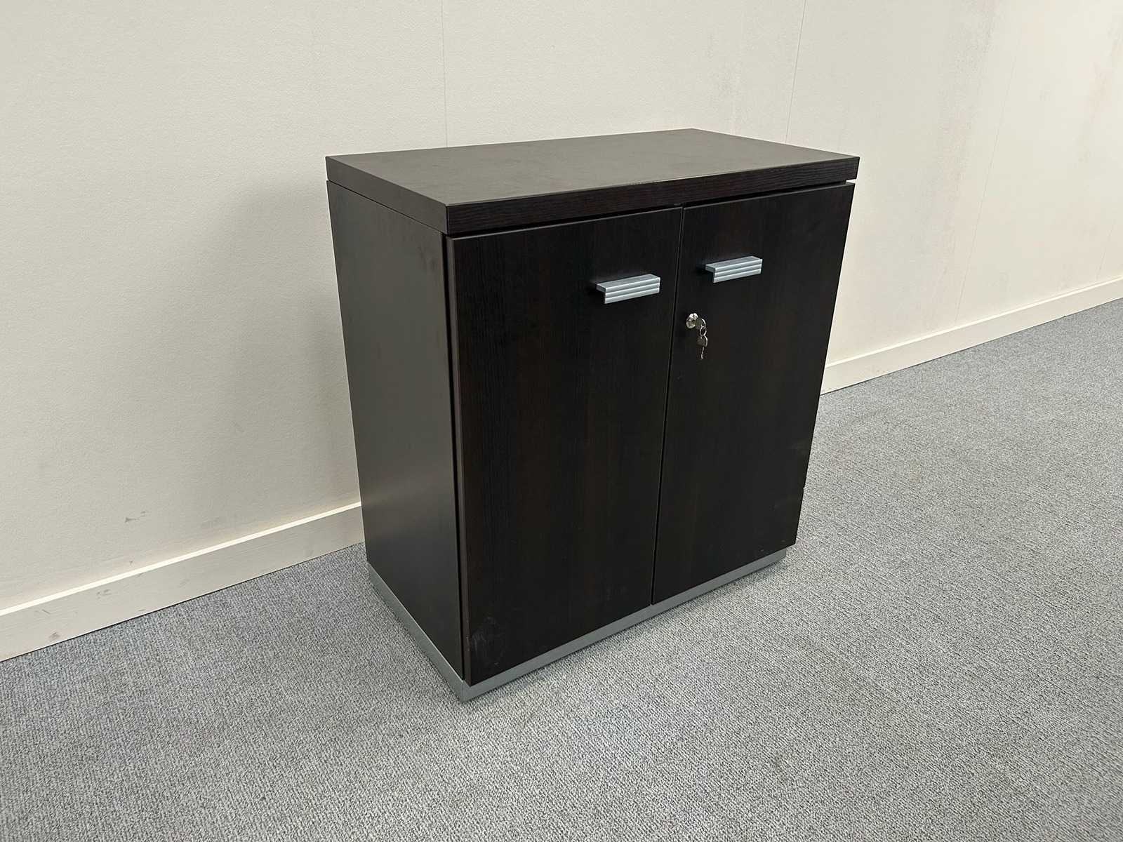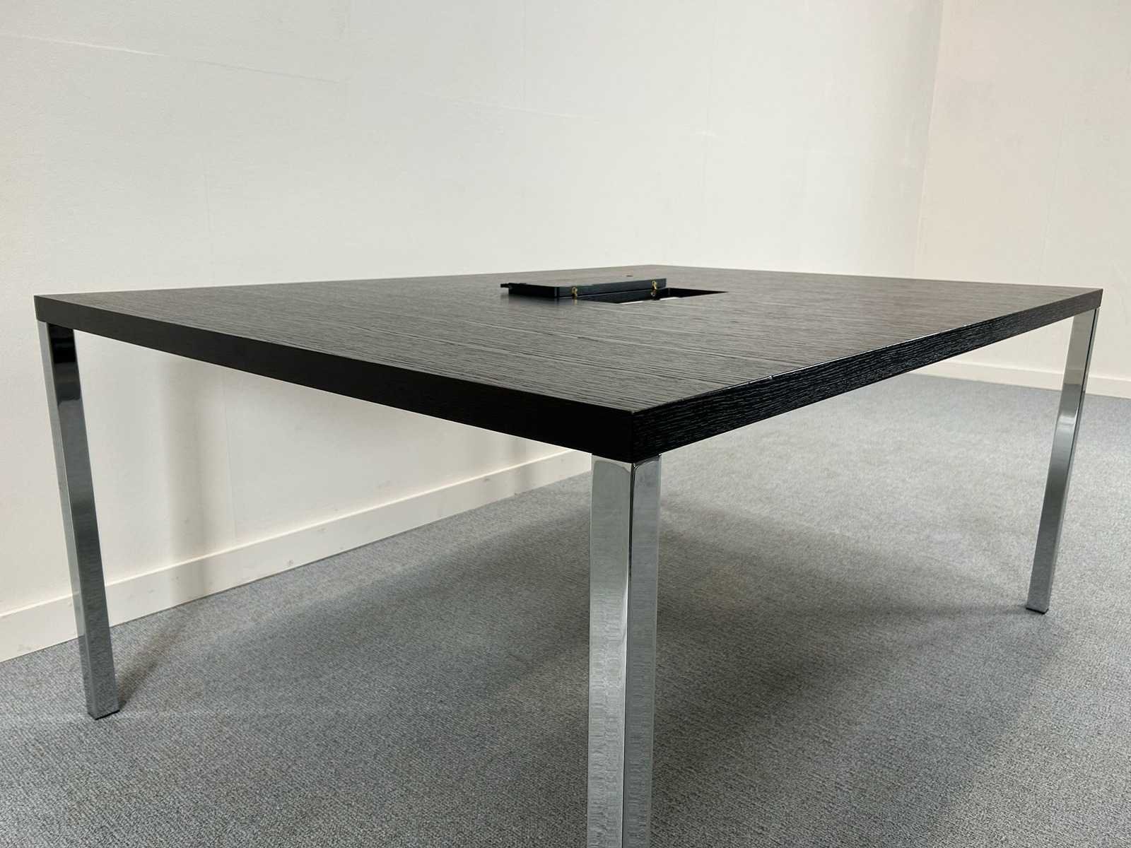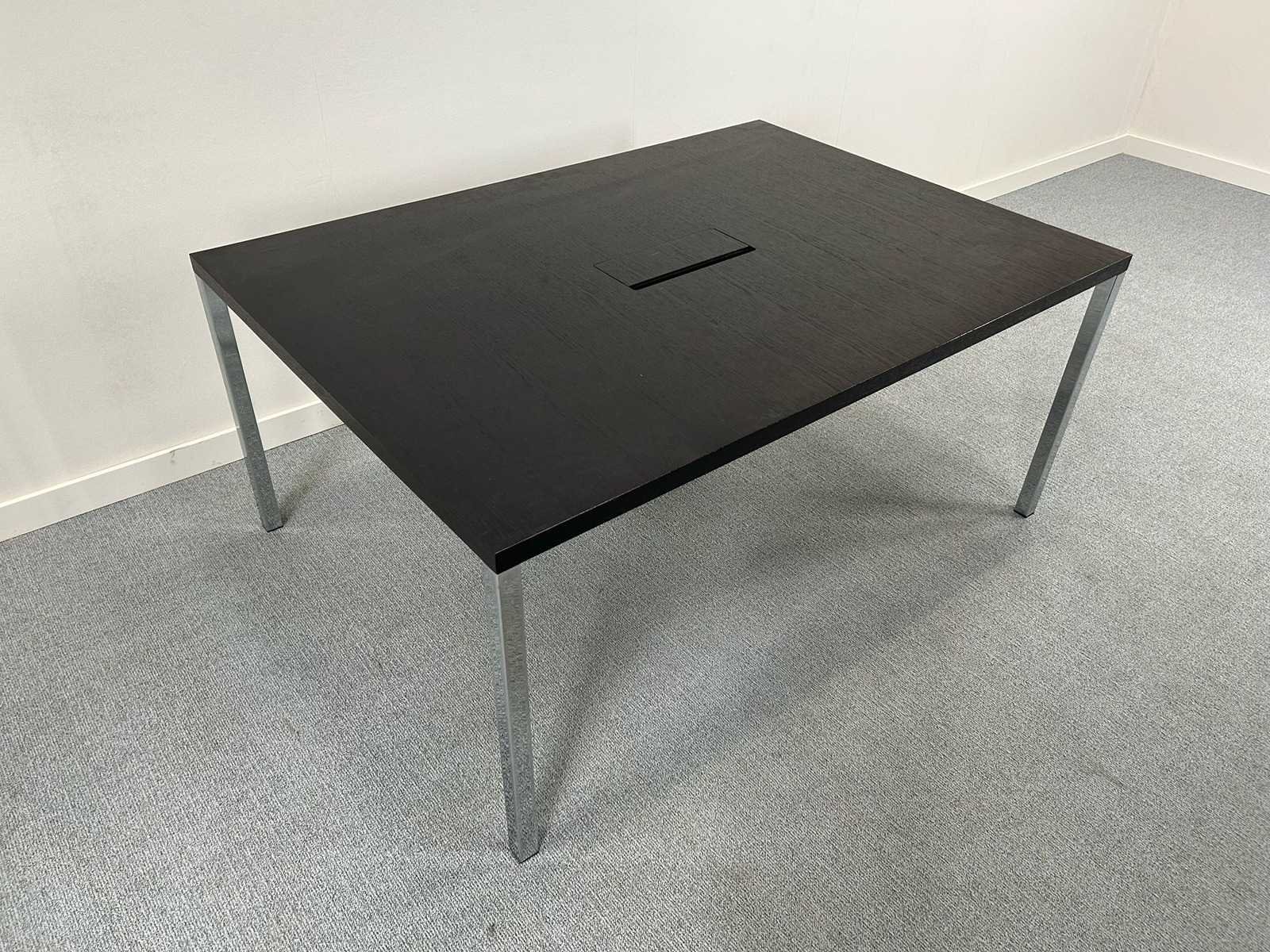 Vergadertafel / bureautafel, rechthoekig model met zwart (houtlook) blad en metalen poten. Voorzien van kabeldoorvoer in het tafelblad. Strak en tijdloos ontwerp, geschikt voor vergaderruimte of kantooromgeving. Gebruikte staat met lichte gebruikssporen. Inclusief lage draaideurkast in bijpassende kleur. afmetingen kastje H86 x B80 x D46 Nee Model: Vergadertafel + kastje Kleur: donker hout Gewicht: 90kg Lengte: 170cm Breedte: 120cm Hoogte: 74cm