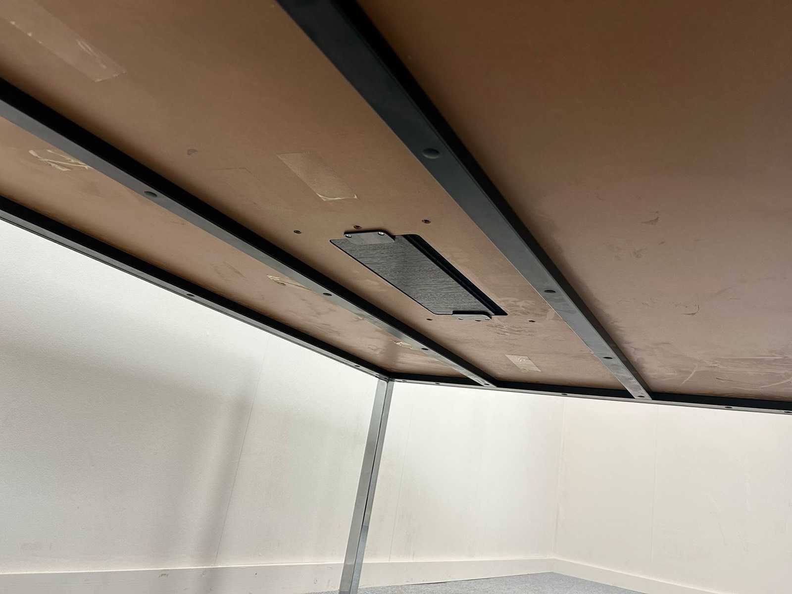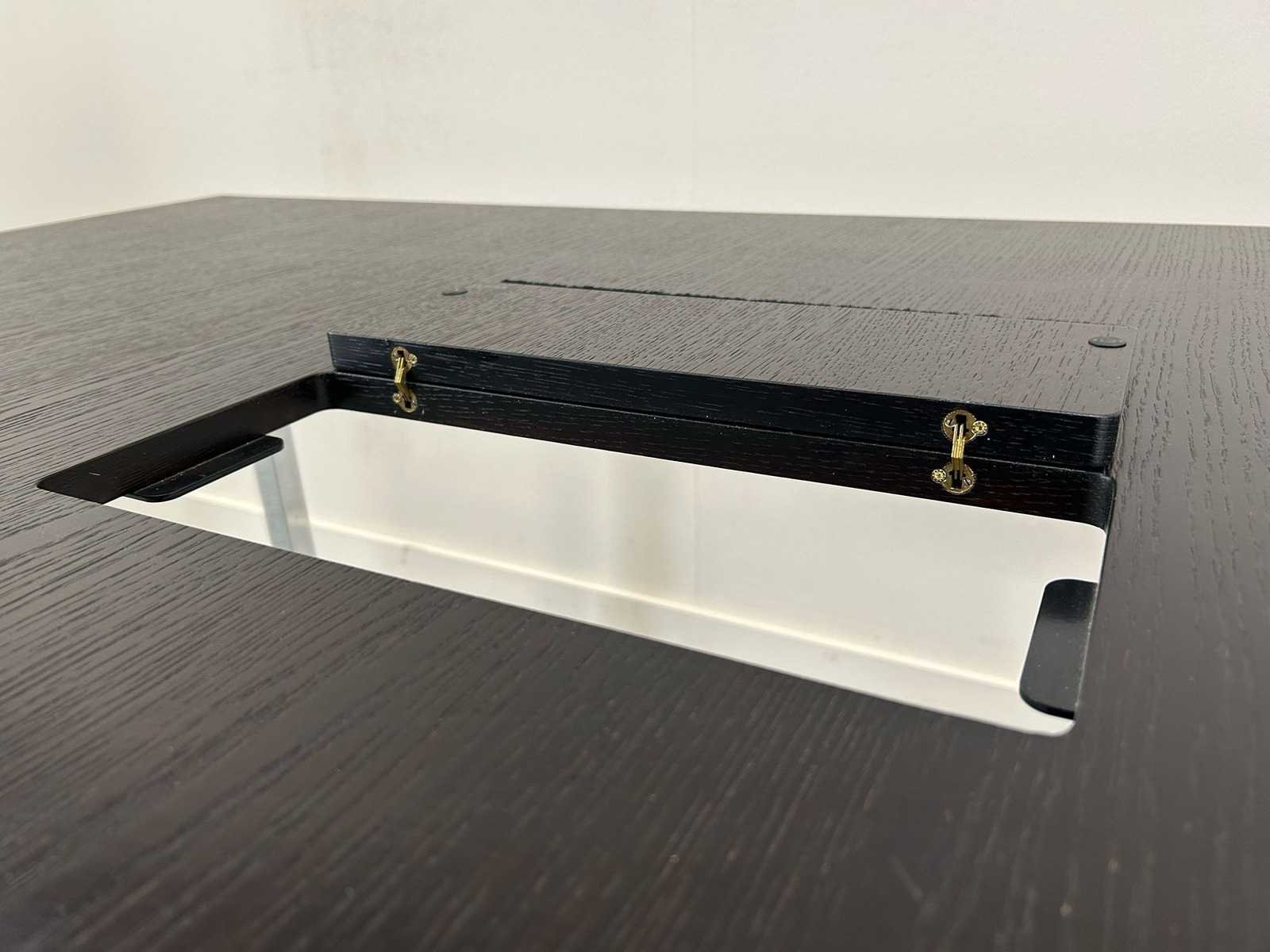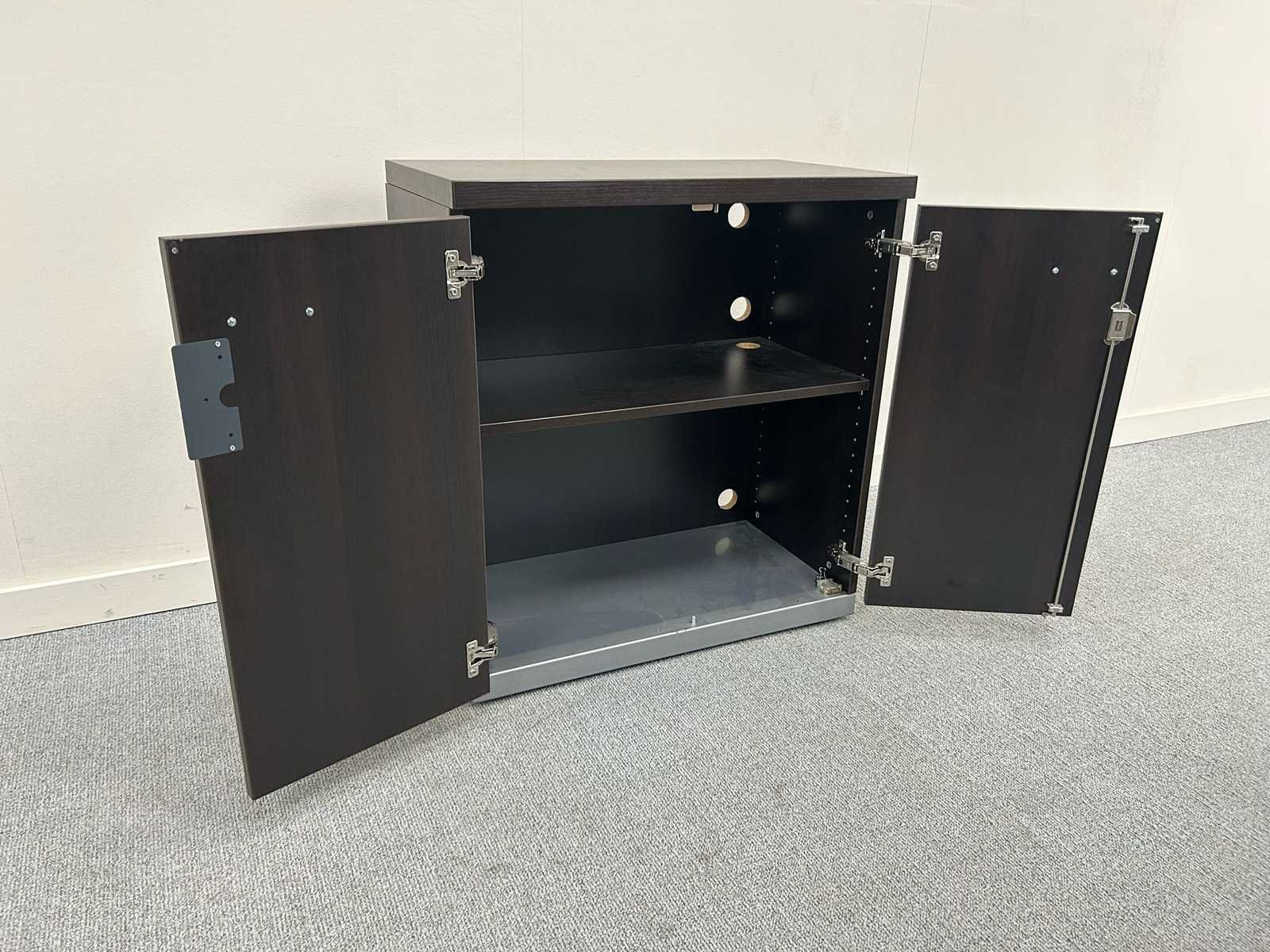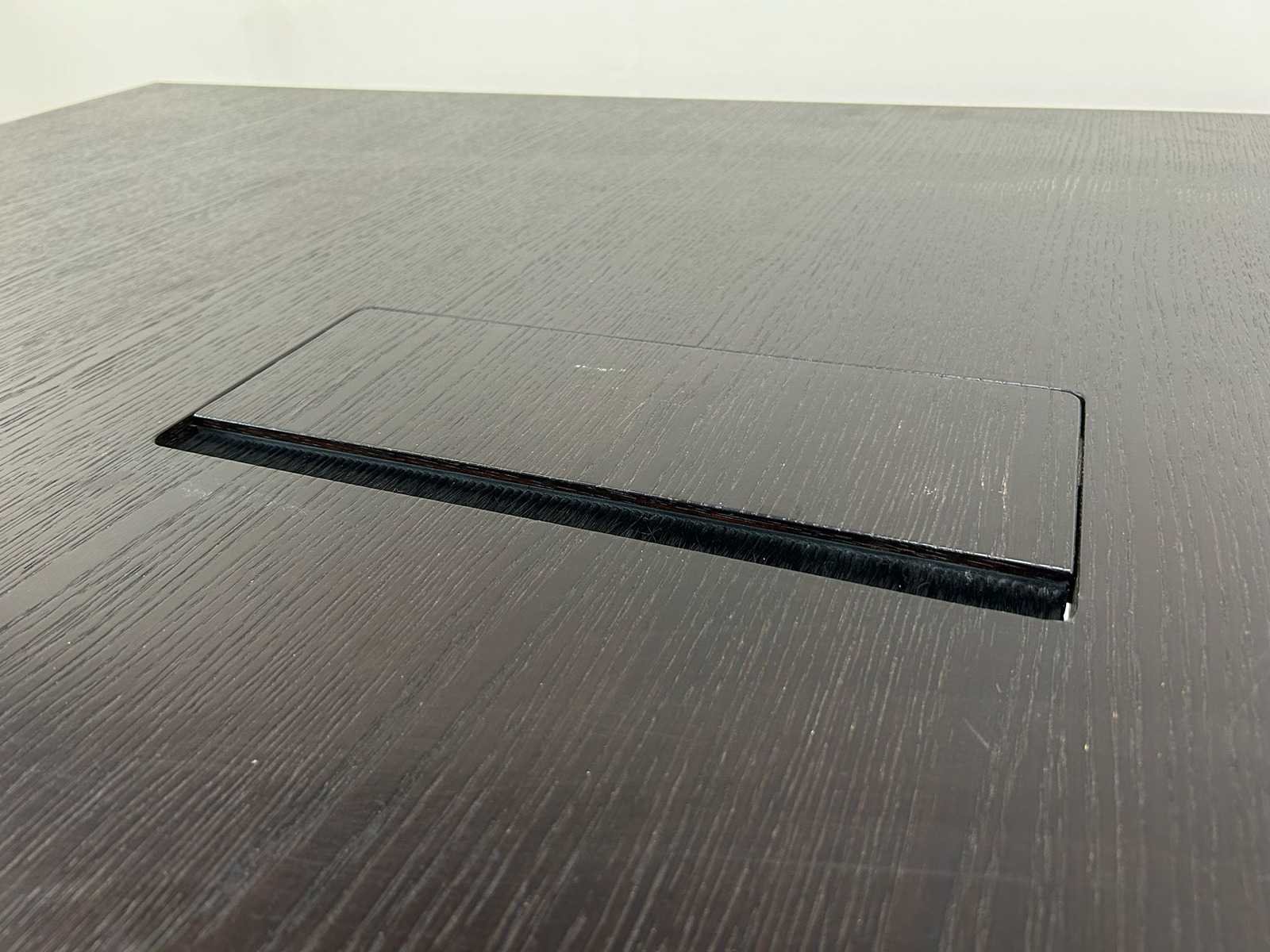 Vergadertafel / bureautafel, rechthoekig model met zwart (houtlook) blad en metalen poten. Voorzien van kabeldoorvoer in het tafelblad. Strak en tijdloos ontwerp, geschikt voor vergaderruimte of kantooromgeving. Gebruikte staat met lichte gebruikssporen. Inclusief lage draaideurkast in bijpassende kleur. afmetingen kastje H86 x B80 x D46 Nee Model: Vergadertafel + kastje Kleur: donker hout Gewicht: 90kg Lengte: 170cm Breedte: 120cm Hoogte: 74cm