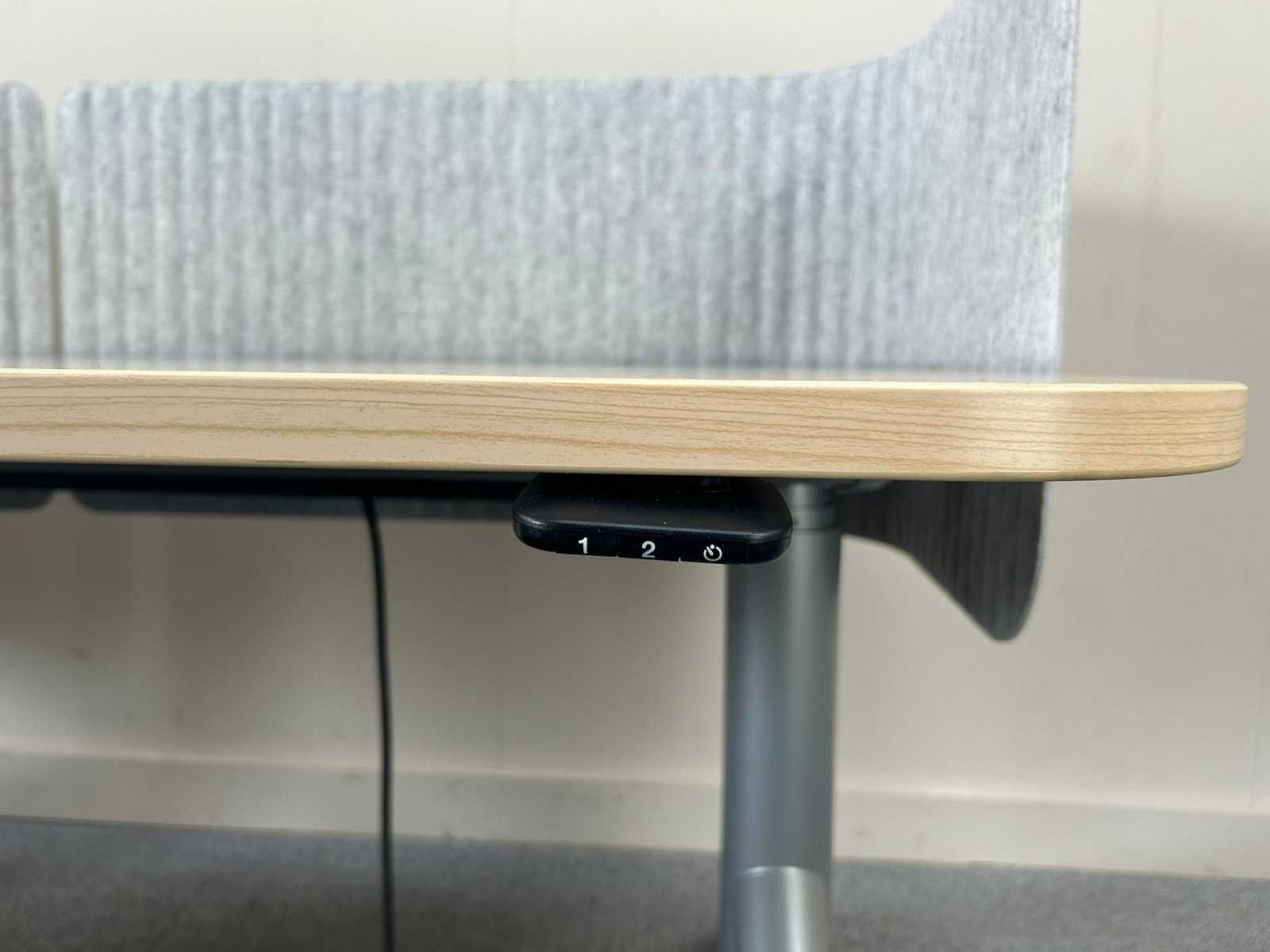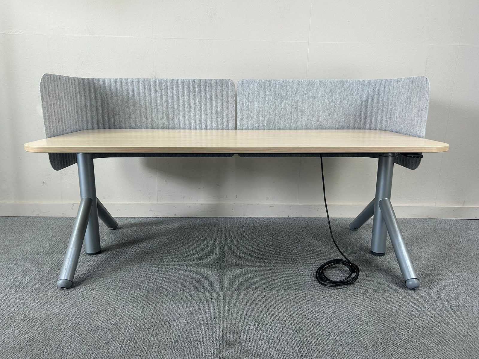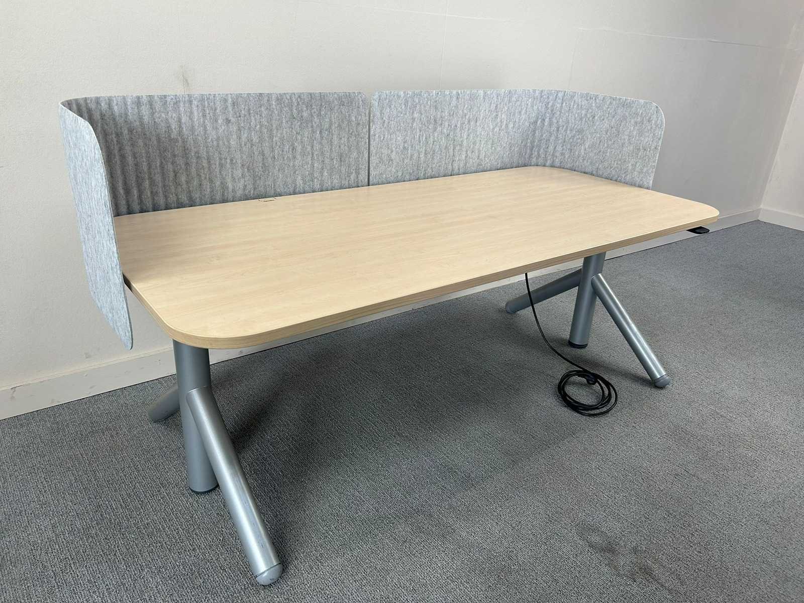 Rechthoekige werk- of vergadertafel met licht houtkleurig blad en afgeronde hoeken. Voorzien van twee geïntegreerde akoestische zij-/achterpanelen in grijze stof, die zorgen voor extra geluidsdemping en visuele afscherming. Stevig metalen onderstel in grijs. Aanwezig elektrisch aansluitpunt/kabel, geschikt voor kantoor- of overlegomgeving. Nee Merk: STEELCASE Type: Elektrisch zit/sta Model: Flex collection Zit-sta: true Lengte: 180cm Breedte: 80cm Hoogte: 64-125cm Materiaal: melamine/metaal