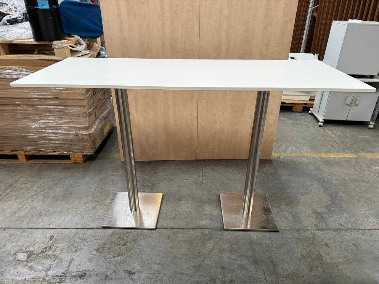 Stevige hoge tafel / bartafel met wit werkblad en een robuust RVS (inox) onderstel met twee kolompoten op brede voetplaten. Geschikt voor horeca, refter, kantine, events of als hoge overlegtafel. Neutrale uitstraling en makkelijk combineerbaar. Nee Merk: PEDRALI Model: Sta tafel Kleur: wit Gewicht: 40kg Lengte: 180cm Breedte: 70cm Hoogte: 112cm