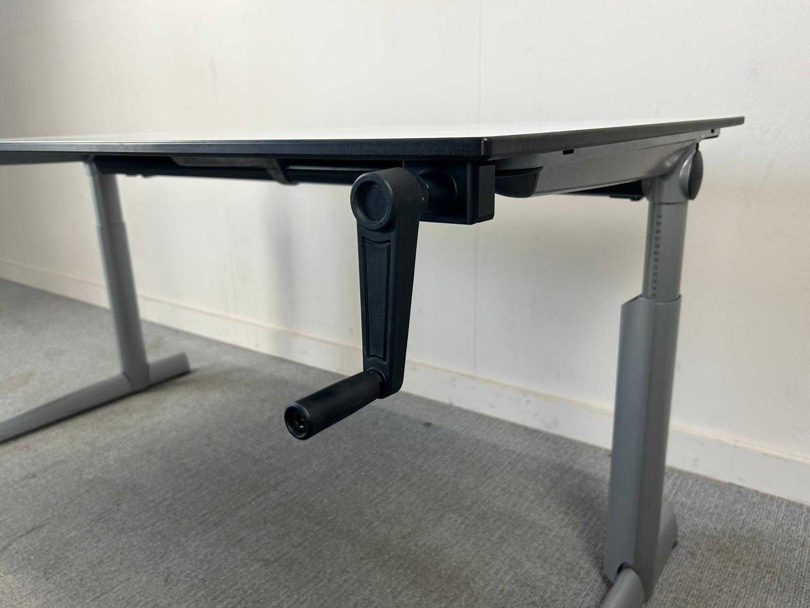 Stevig bureau / werktafel met wit werkblad en een stabiel T-poot onderstel in grijze uitvoering. De tafel is hoogte-instelbaar (manueel), ideaal voor kantoor, atelier, vergader- of projectruimte. Strakke uitstraling en makkelijk combineerbaar met elk interieur. Nee Merk: AHREND Type: Slingerbureau Slingerbureau: true Kleur: licht grijs Gewicht: 40kg Lengte: 160cm Breedte: 80cm Hoogte: 64-90cm Materiaal: trespa