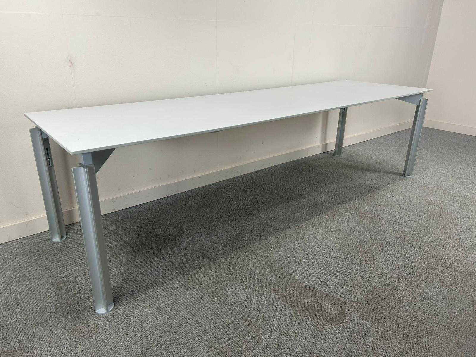 BULO H2O tafel met wit blad en aluminium onderstel. Afmetingen 270 × 80 cm. Strak en tijdloos ontwerp, geschikt als vergader- of projecttafel in kantooromgeving. Stevige constructie met minimalistische uitstraling. Nee Merk: BULO Type: H2O Model: 270 X 80 Kleur: licht grijs Gewicht: 80kg Lengte: 230cm Breedte: 80cm Hoogte: 62-82cm