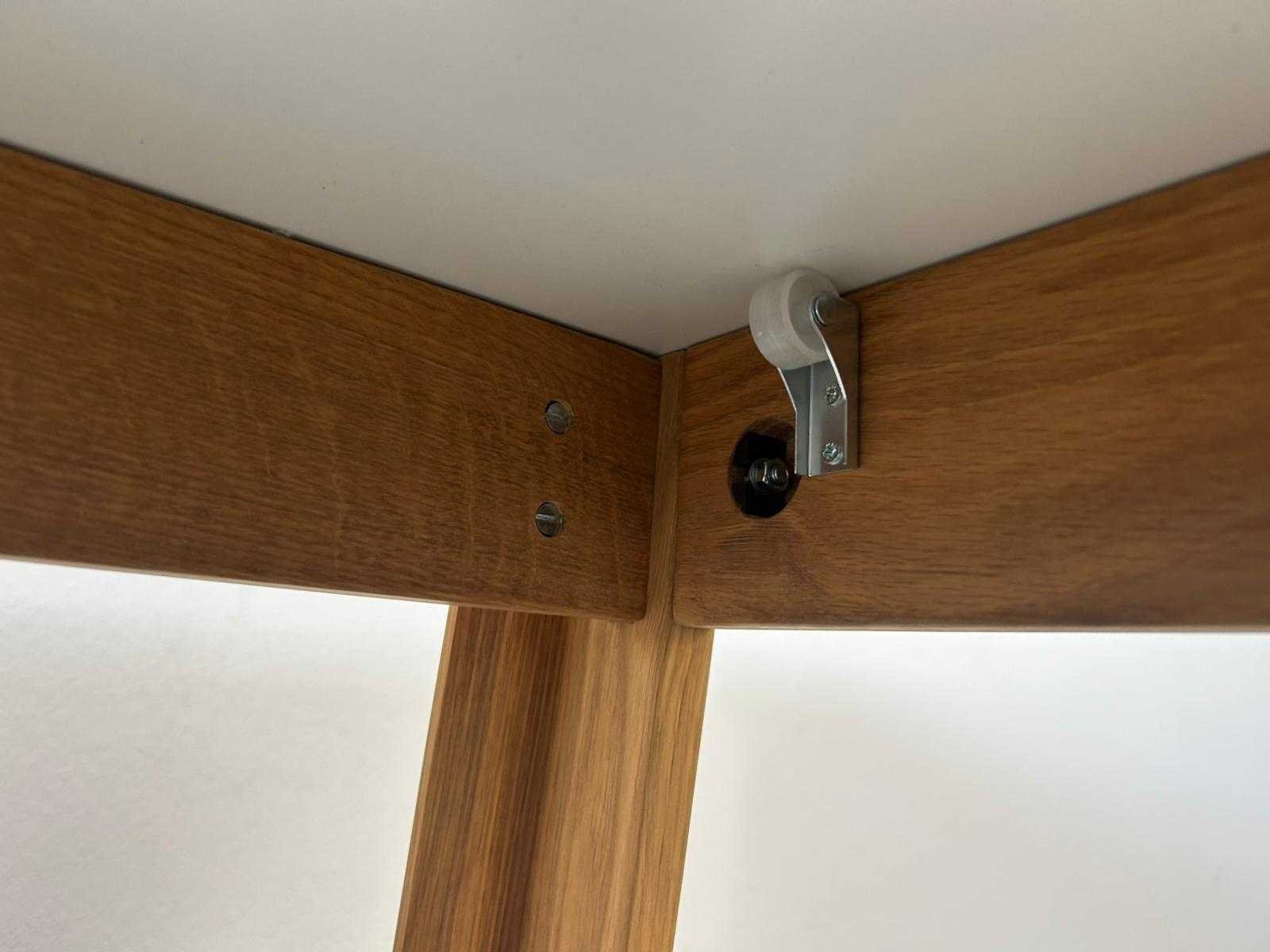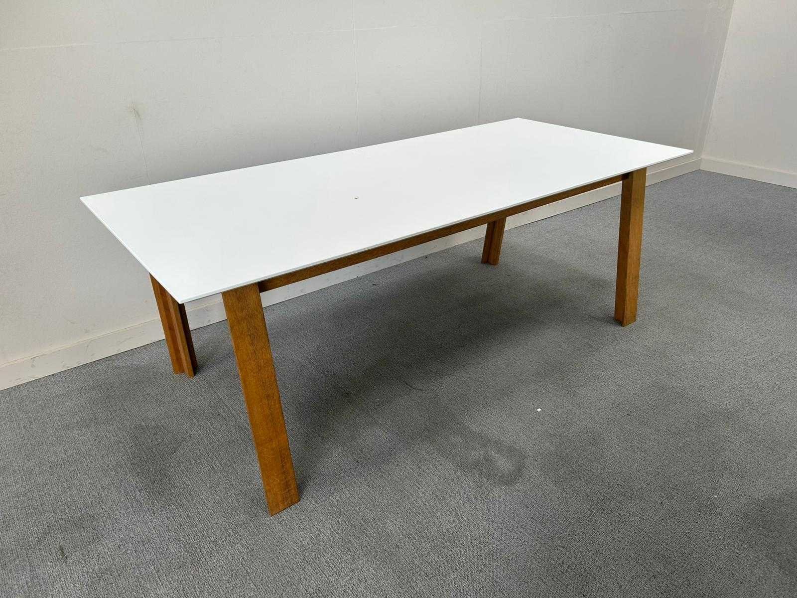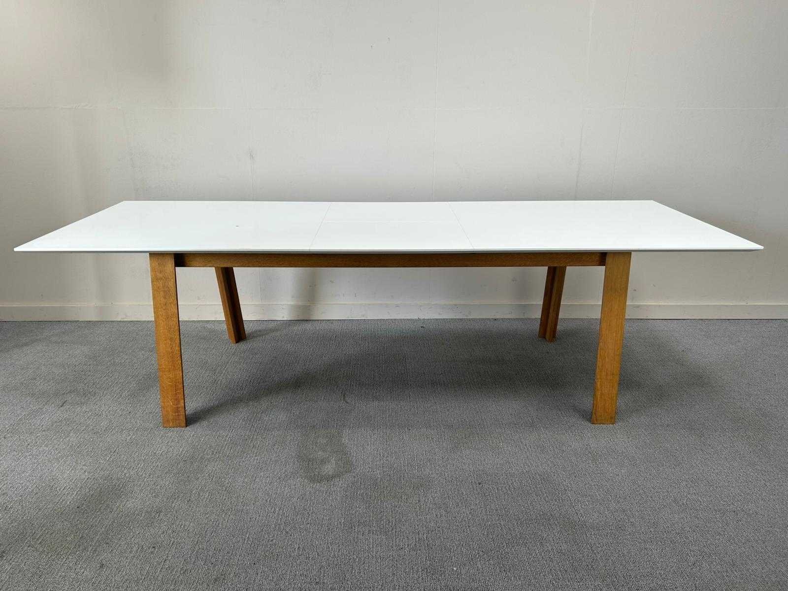 Uitschuifbare vergadertafel met wit blad en massief houten onderstel. Voorzien van een centraal verlengmechanisme met extra inzetblad, waardoor de tafel eenvoudig vergroot kan worden. Strak en tijdloos ontwerp, geschikt als vergader- of eettafel. Stabiele constructie, gebruikt maar in nette staat. Nee Kleur: Wit/hout Gewicht: 50kg Lengte: 220cm Breedte: 95cm Hoogte: 75cm