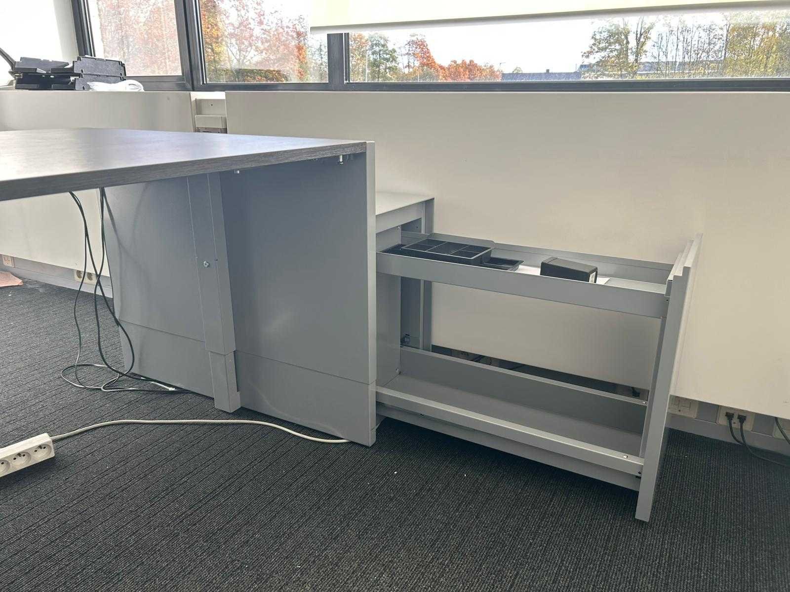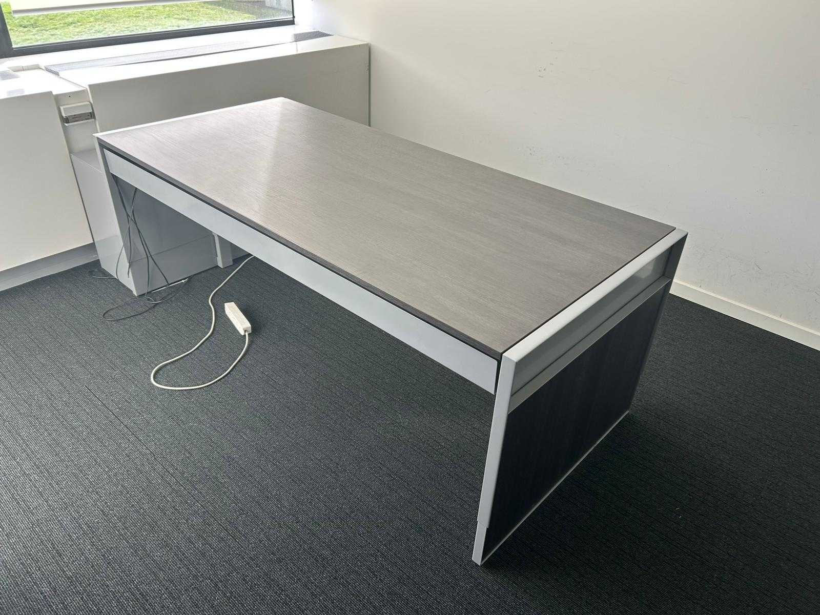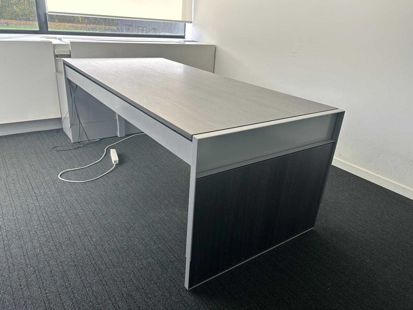 Recht bureau met zijpanelen, voorzien van een donker houten werkblad en een metalen frame. Aan één zijde uitgerust met een geïntegreerd lade-/kabelmanagementsysteem. Niet elektrisch in hoogte verstelbaar. Geschikt als werk- of vergadertafel in kantooromgeving. Nee Merk: PAMI Type: Directiebureau Kleur: donkerbruin Gewicht: 50kg Lengte: 200cm Breedte: 90cm Hoogte: 62-82cm