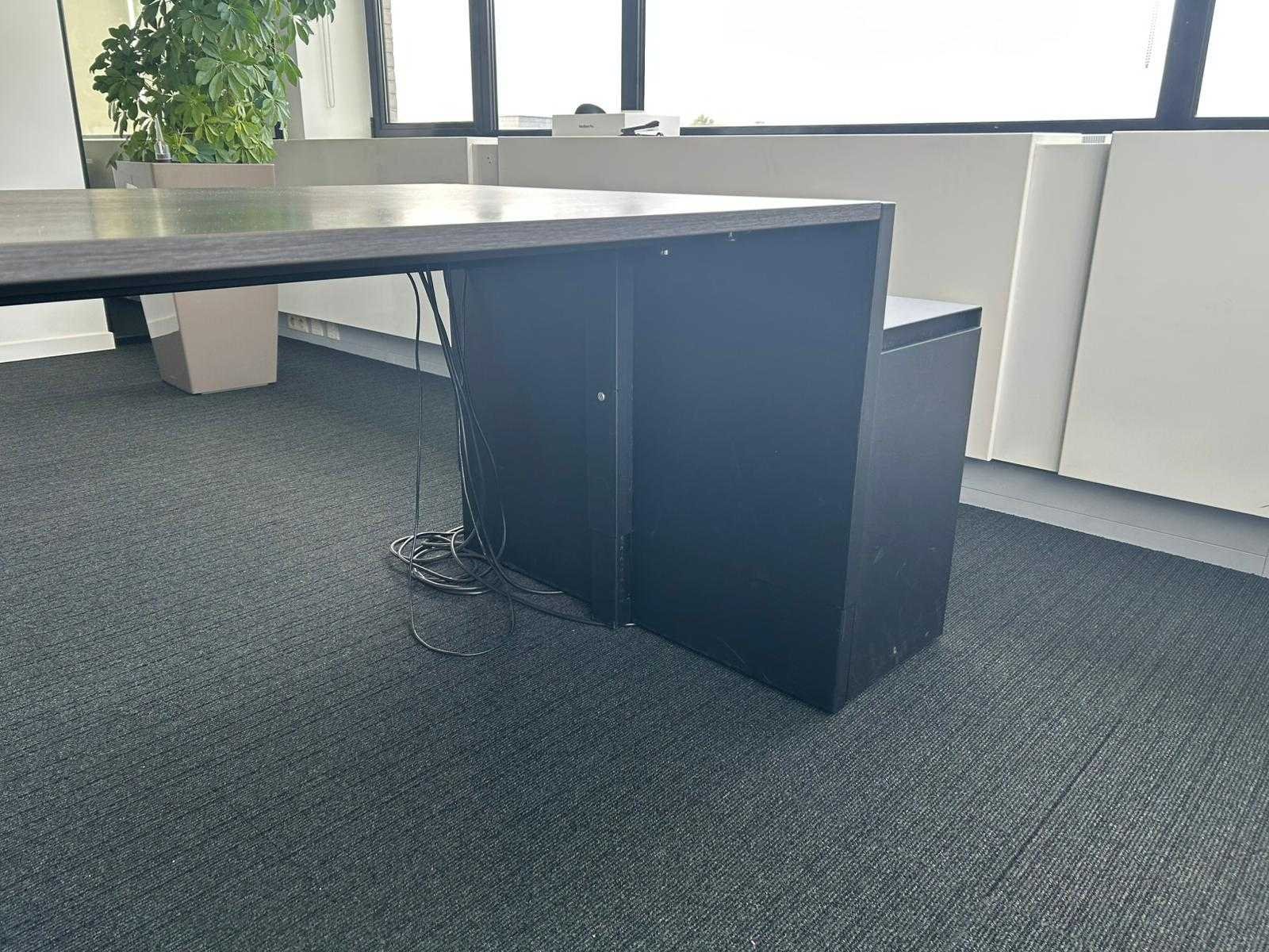 Recht bureau met zijpanelen, voorzien van een donker houten werkblad en een metalen frame. Aan één zijde uitgerust met een geïntegreerd lade-/kabelmanagementsysteem. Niet elektrisch in hoogte verstelbaar. Geschikt als werk- of vergadertafel in kantooromgeving. Nee Merk: PAMI Type: Directiebureau Kleur: donkerbruin Gewicht: 50kg Lengte: 200cm Breedte: 90cm Hoogte: 62-82cm