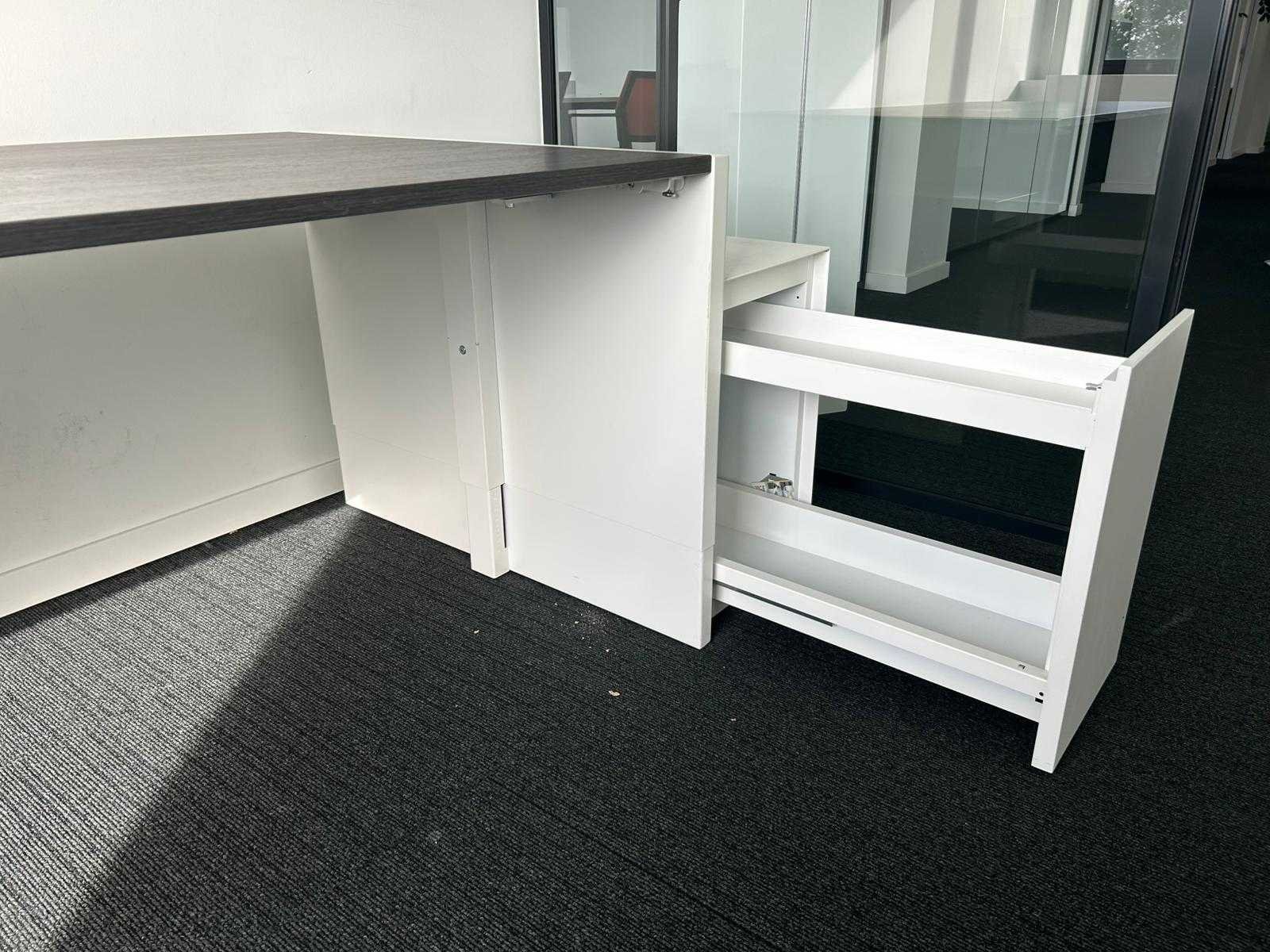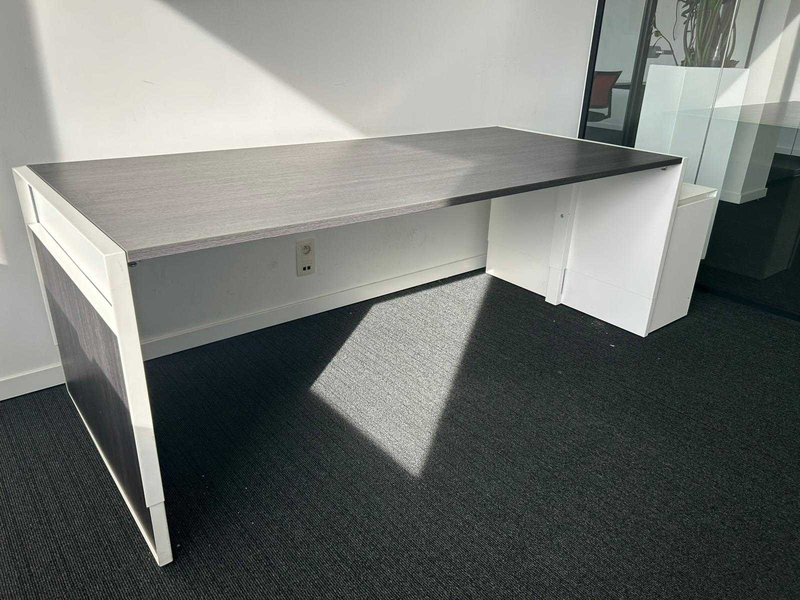 Recht bureau met zijpanelen, voorzien van een donker houten werkblad en een wit metalen frame. Aan één zijde uitgerust met een geïntegreerd lade-/kabelmanagementsysteem. Niet elektrisch in hoogte verstelbaar. Geschikt als werk- of vergadertafel in kantooromgeving. Nee Merk: PAMI Type: Directiebureau Kleur: donkerbruin Gewicht: 50kg Lengte: 200cm Breedte: 90cm Hoogte: 62-84cm