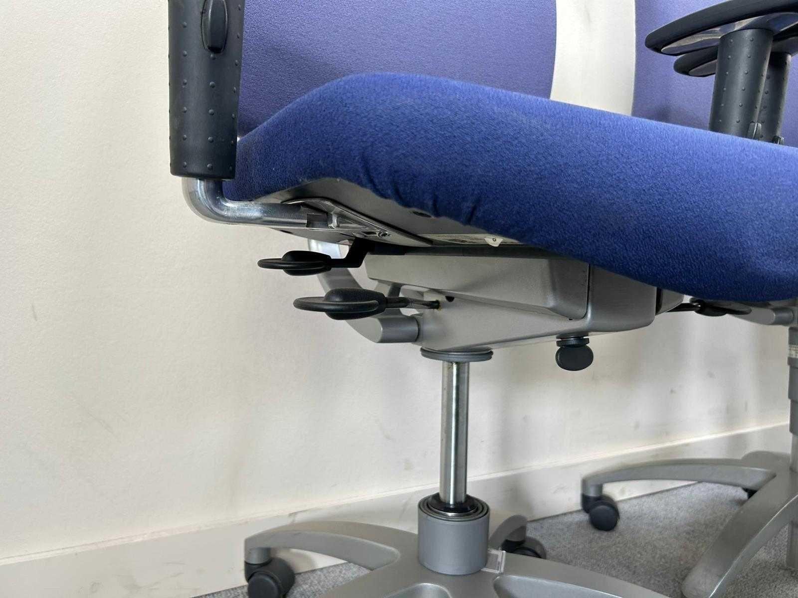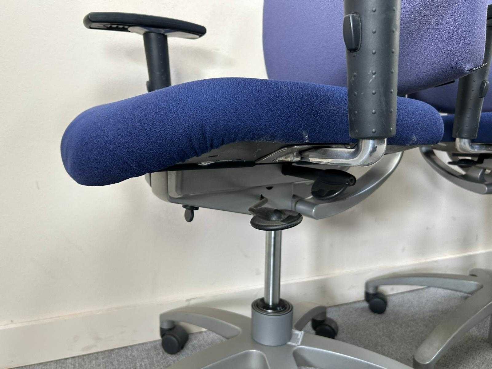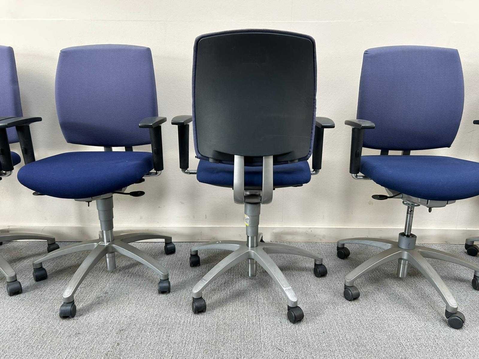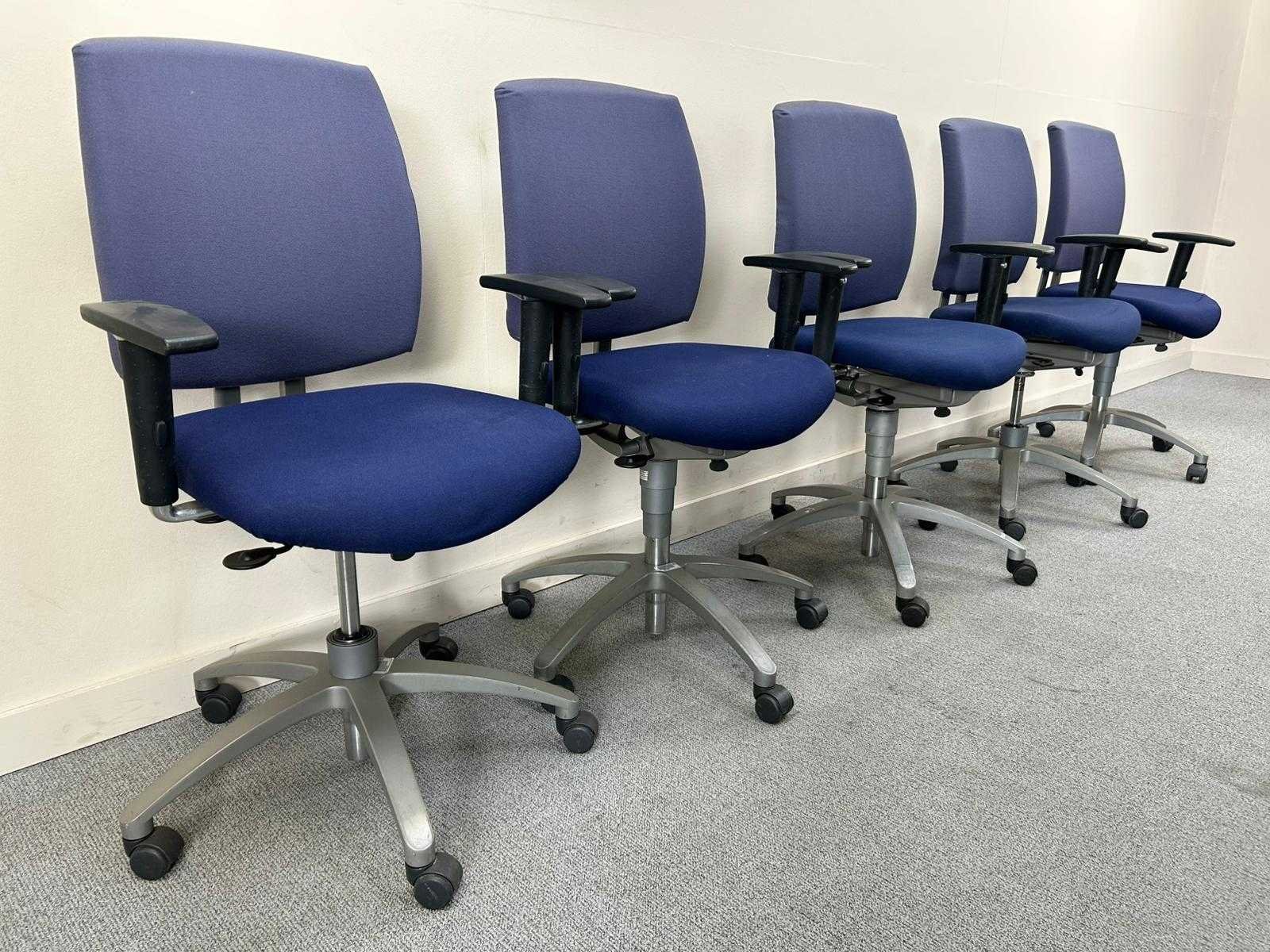 Partij ergonomische bureaustoelen, uitgevoerd met blauwe stoffen zitting en rugleuning. Voorzien van verstelbare armleuningen, gaslift en 5-teens onderstel met wielen. Geschikt voor kantoor- en projectgebruik. Gebruikte staat met normale gebruikssporen. Nee Merk: DRABERT Type: Entrada Kleur: blauw/paars Gewicht: 25kg