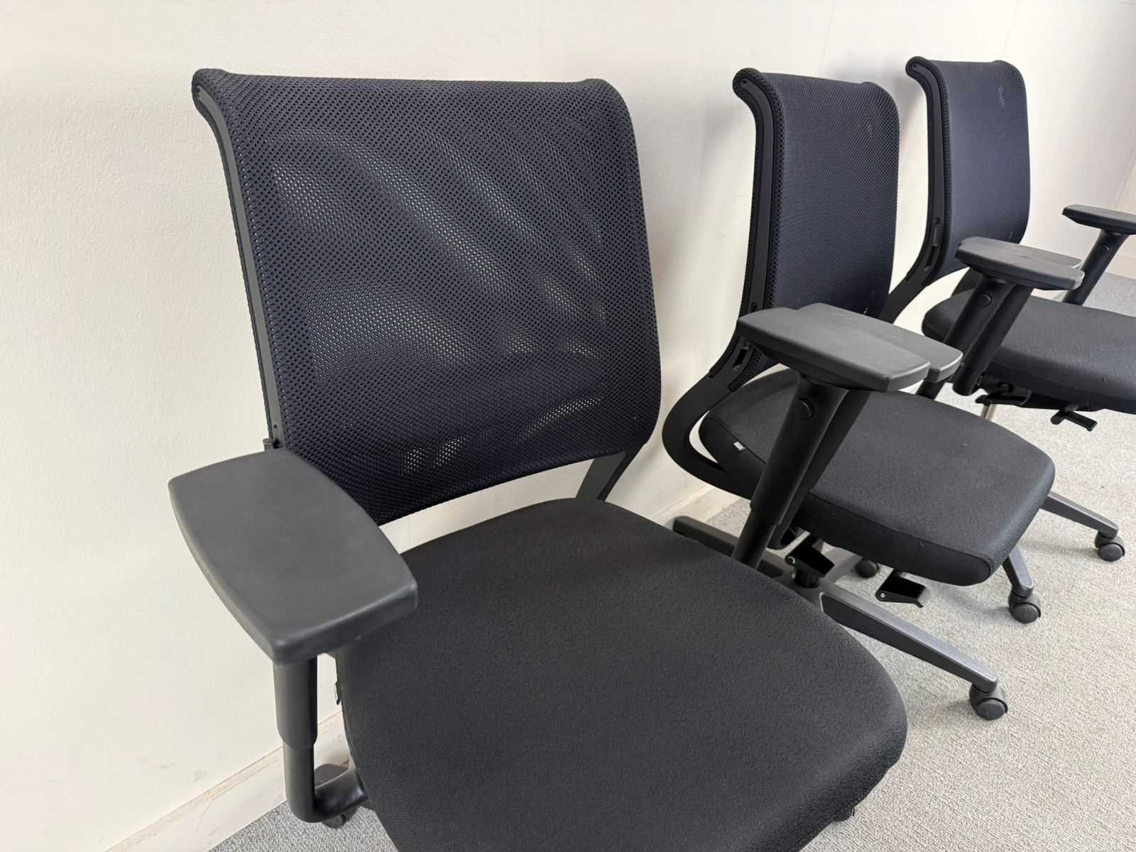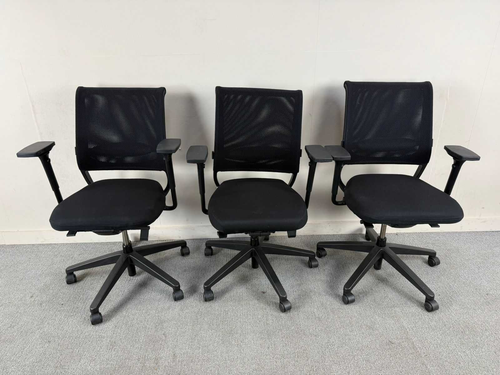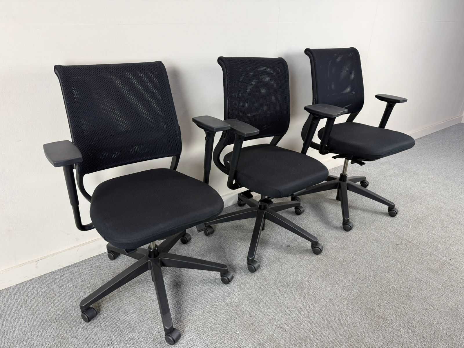 Et van 3 ergonomische bureaustoelen met zwart gestoffeerde zitting en ademende mesh rugleuning. Voorzien van verstelbare armleuningen, gaslift voor zithoogteverstelling en een stabiel vijfsteronderstel op wielen. Geschikt voor intensief gebruik in kantoor- of vergaderruimtes. Nee Merk: SEDUS Type: NETWIN Kleur: zwart Gewicht: 15kg