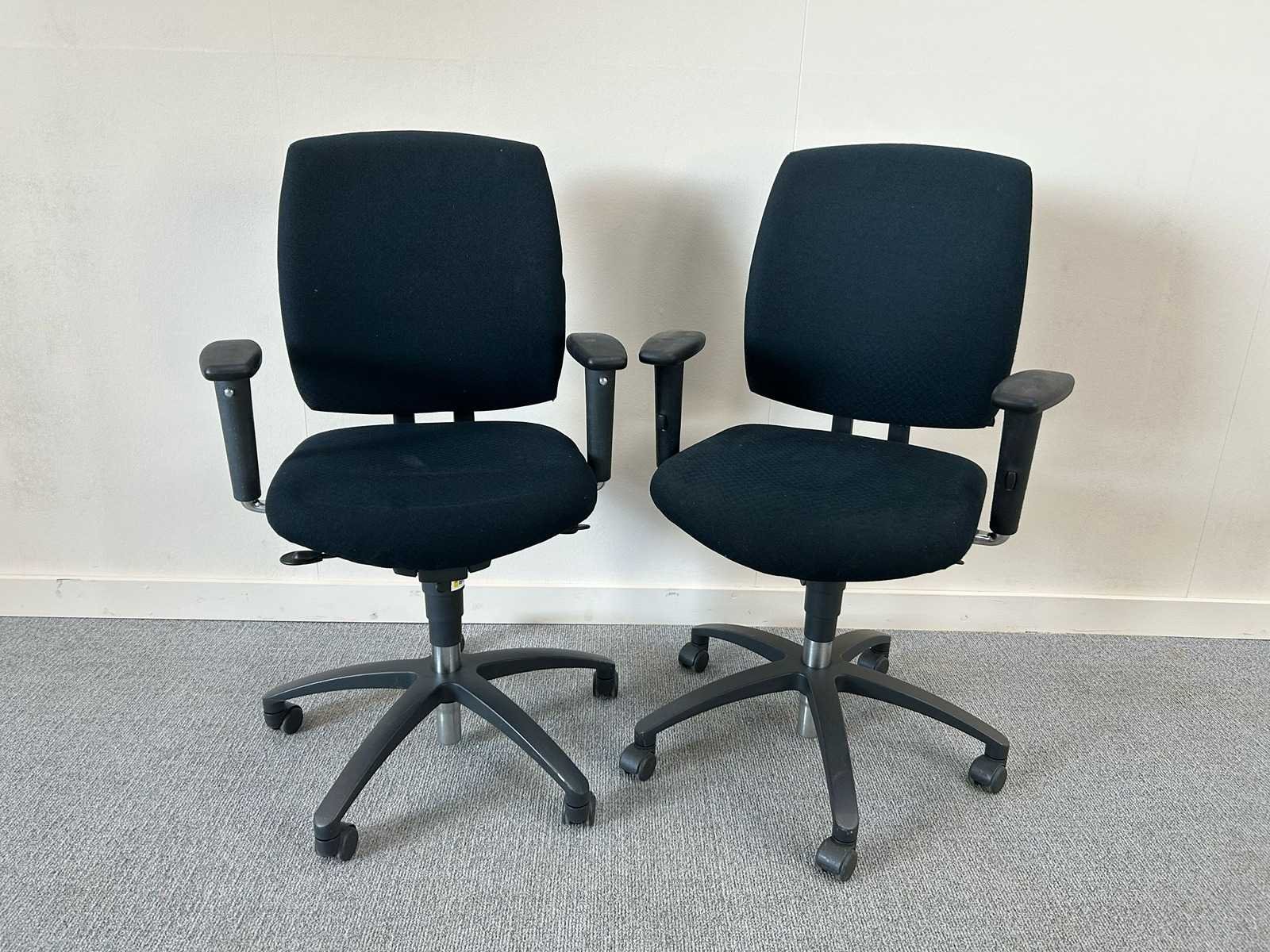 Partij ergonomische bureaustoelen, uitgevoerd met donker groene stoffen zitting en rugleuning. Voorzien van verstelbare armleuningen, gaslift en 5-teens onderstel met wielen. Geschikt voor kantoor- en projectgebruik. Gebruikte staat met normale gebruikssporen. Nee Merk: DRABERT Type: Entrada Kleur: donkergroen