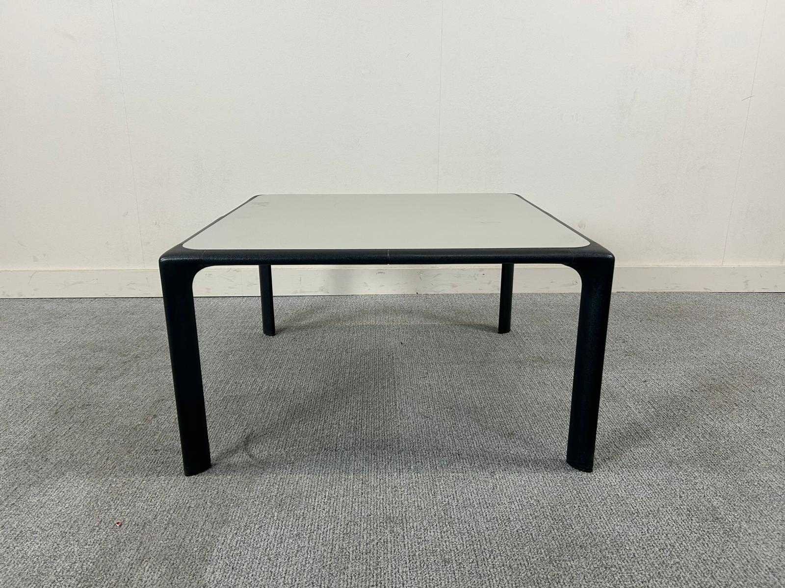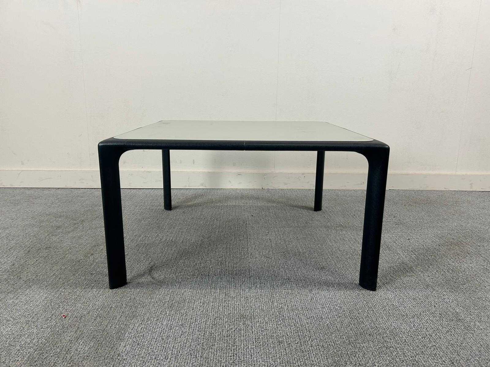 Strakke lage tafel met zwart onderstel en licht tafelblad. Minimalistisch design met afgeronde hoeken, geschikt als vergader-, lounge- of bijzettafel in een kantoor- of ontvangstruimte. Tijdloos projectmeubilair met degelijke constructie. Nee Vorm: vierkant Kleur: grijs/zwart Gewicht: 20kg Lengte: 72cm Breedte: 72cm Hoogte: 40cm Materiaal: trespa/leer