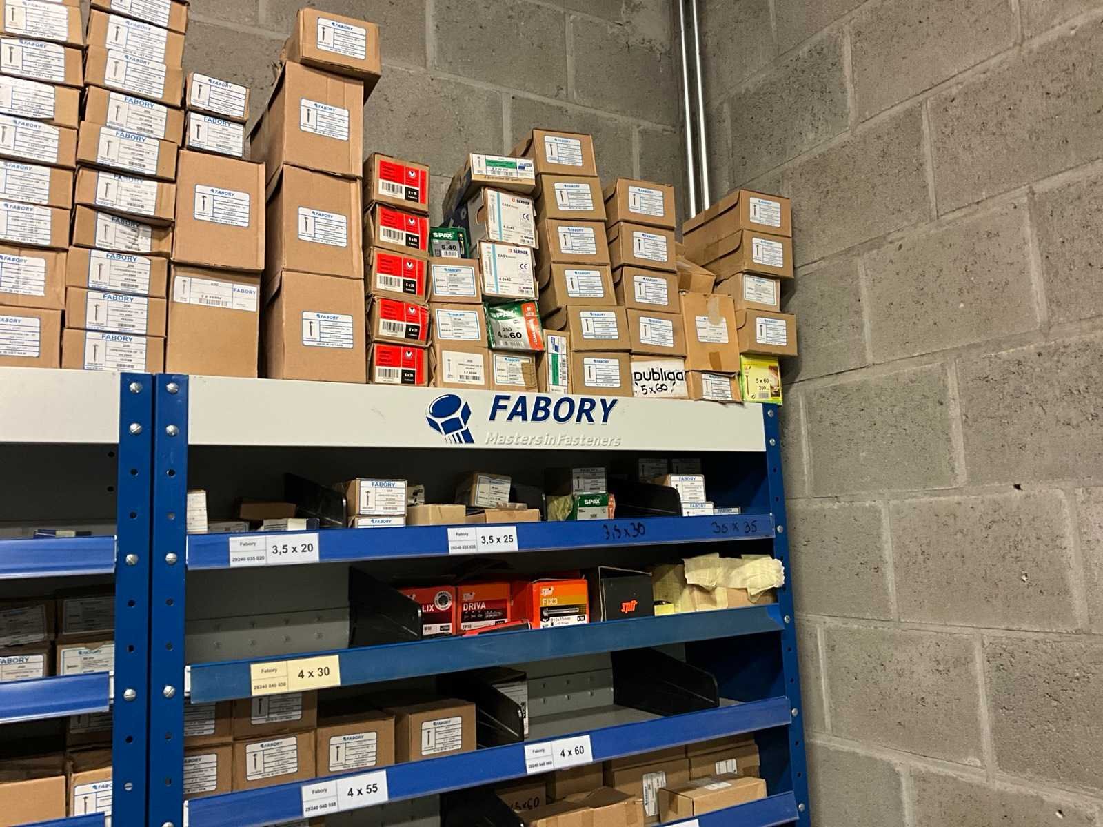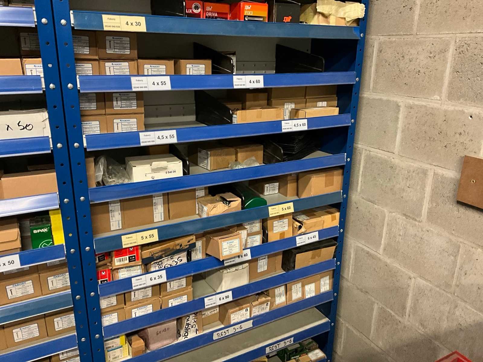 Bestaand uit magazijnrek afmetingen 300x3000x2000 mm met inhoud bestaande uit diverse houtvijzen, gyprocvijzen, tyrfon, enz.. Nee Merk: Fabory spax pgb-fasteners…