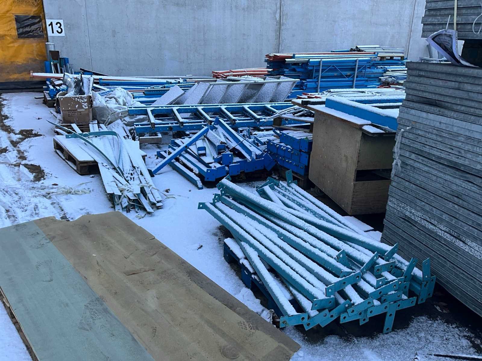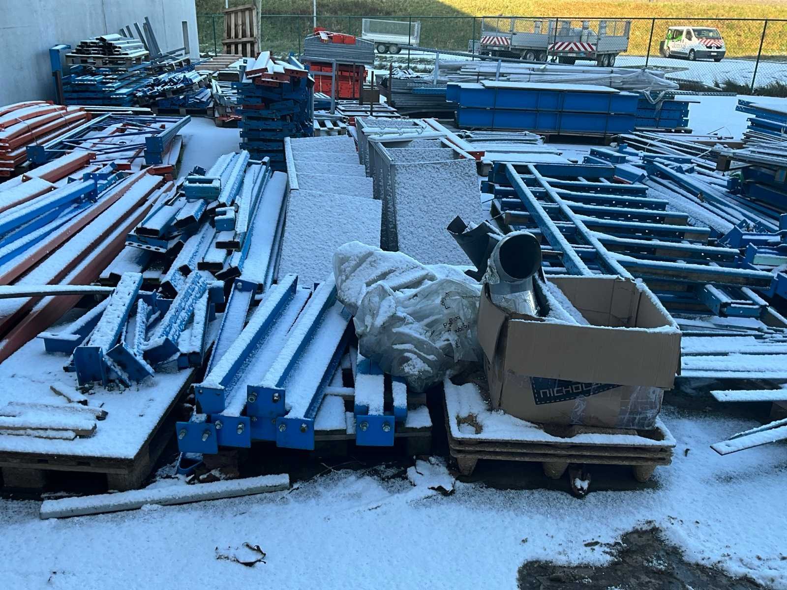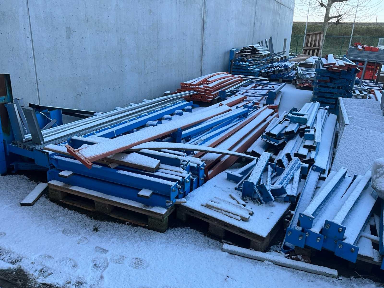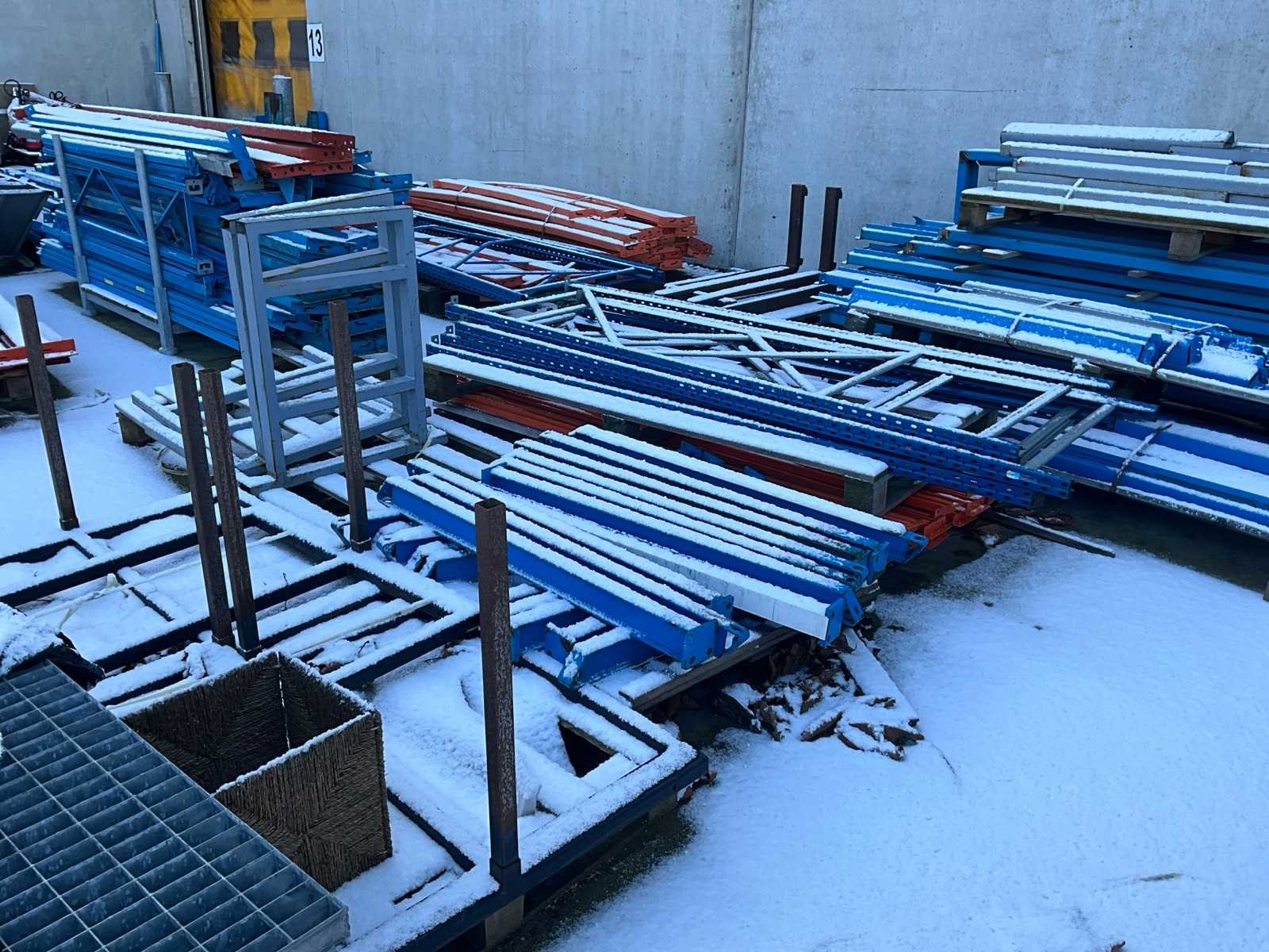 Bestaand uit diverse staanders, diverse palletstelling liggers en draagarmstelling onderdelen, alles gesitueerd buiten achteraan uitgezonderd de Galva rooster vloeren!!! Nee