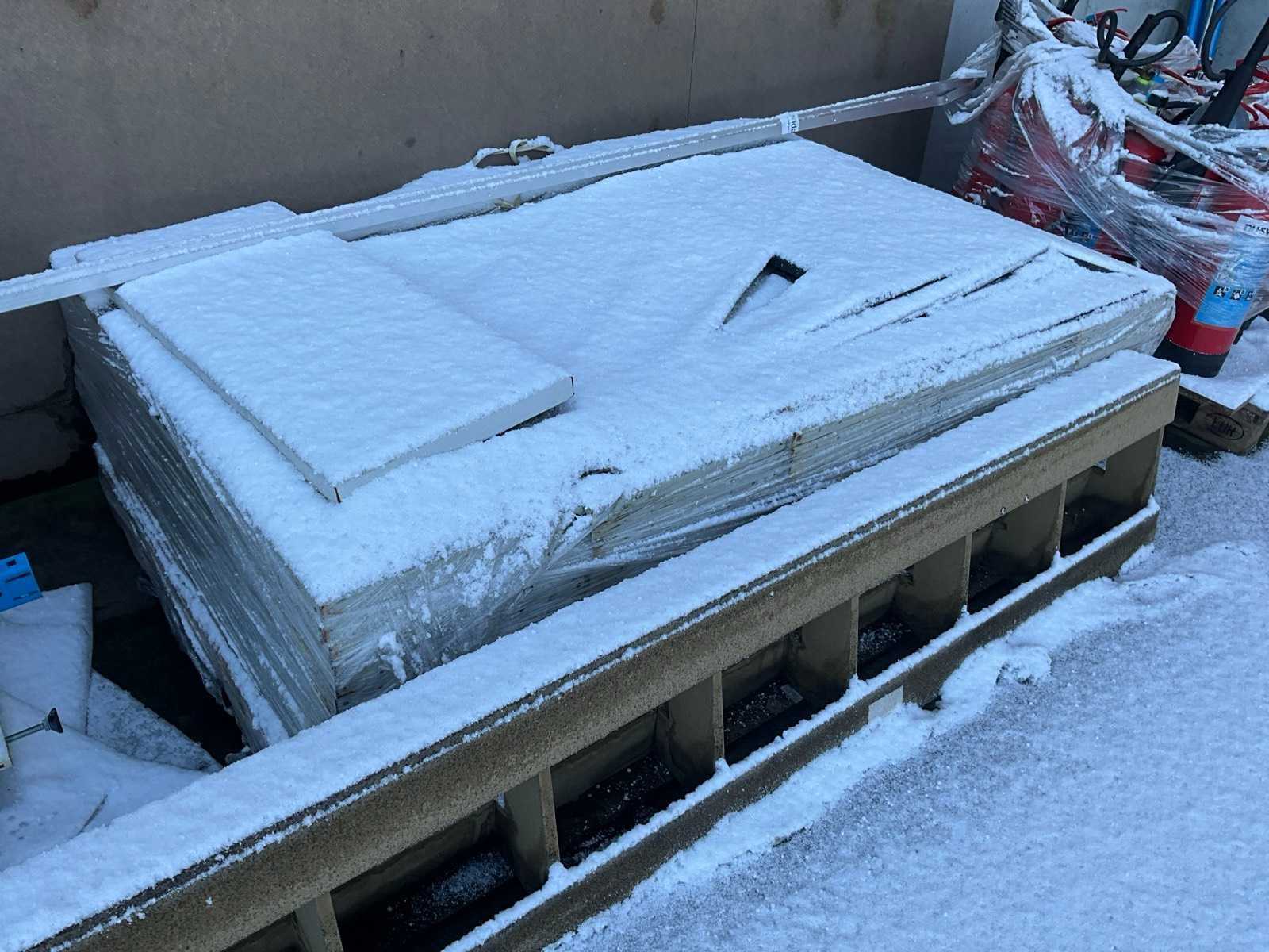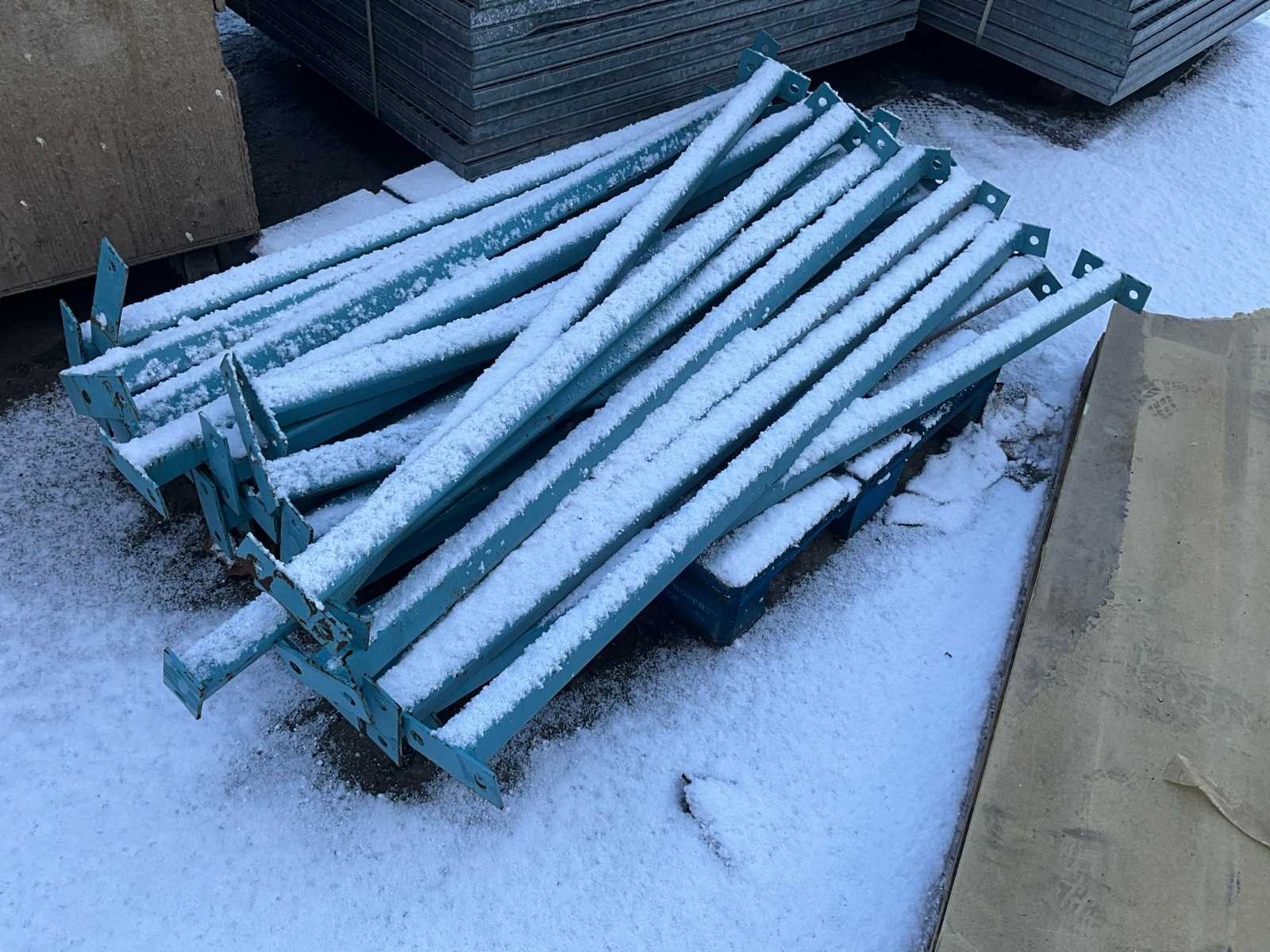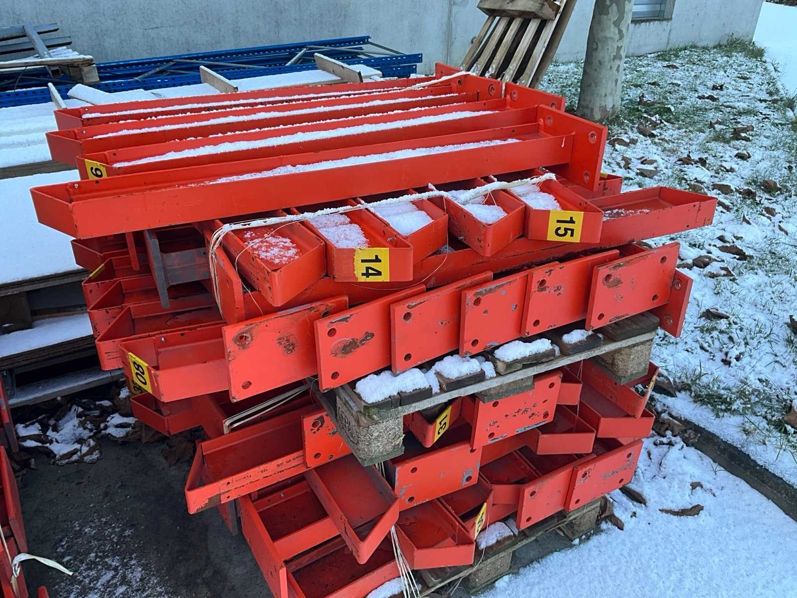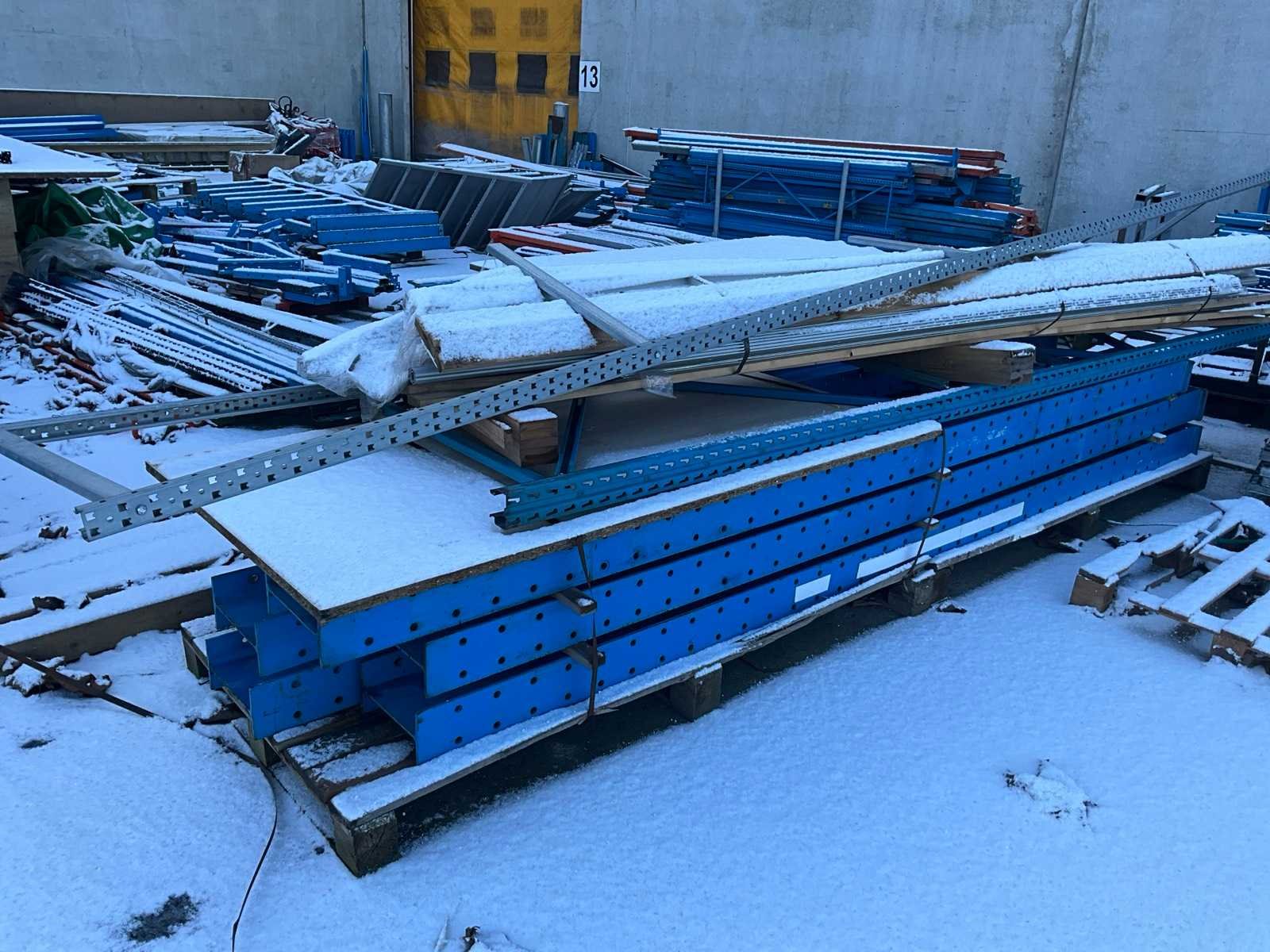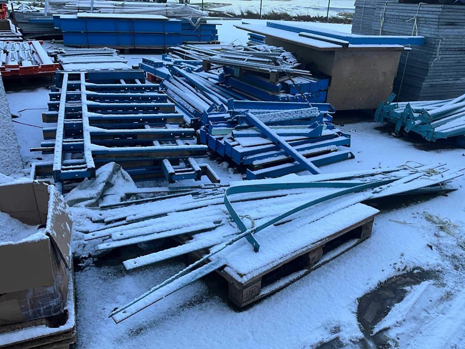 Bestaand uit diverse staanders, diverse palletstelling liggers en draagarmstelling onderdelen, alles gesitueerd buiten achteraan uitgezonderd de Galva rooster vloeren!!! Nee