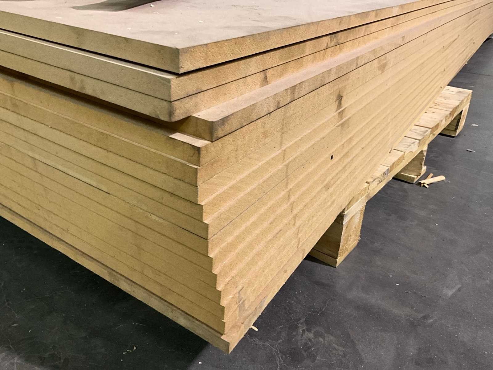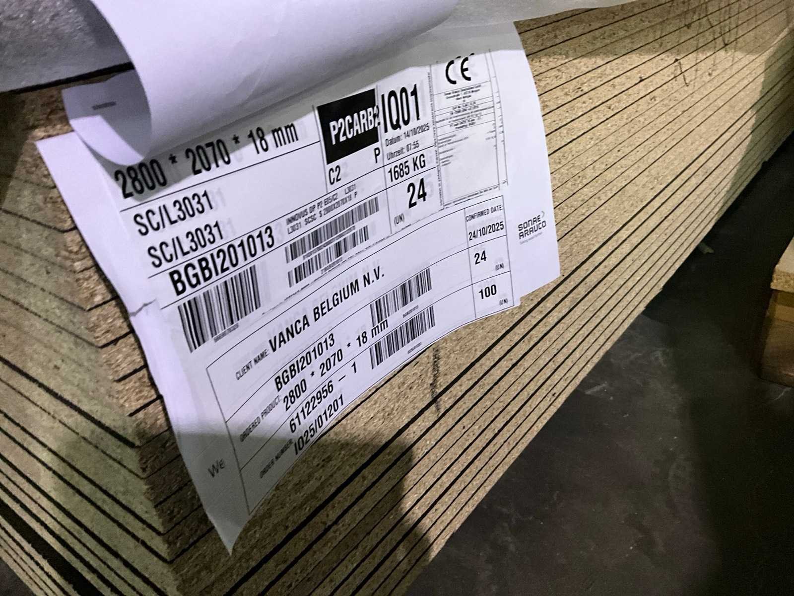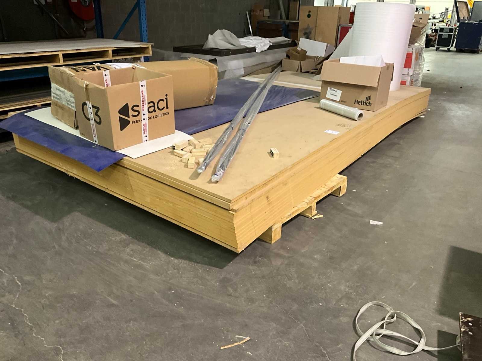 Bestaand uit circa 16 MDF platen met afmeting 2243x4605x18 mm, + circa 24 stuks vezelplaat fineer platen met afmeting 2800x2070x18 mm Nee Gewicht: 4000kg Lengte: 4100mm Breedte: 1223mm Hoogte: 15mm