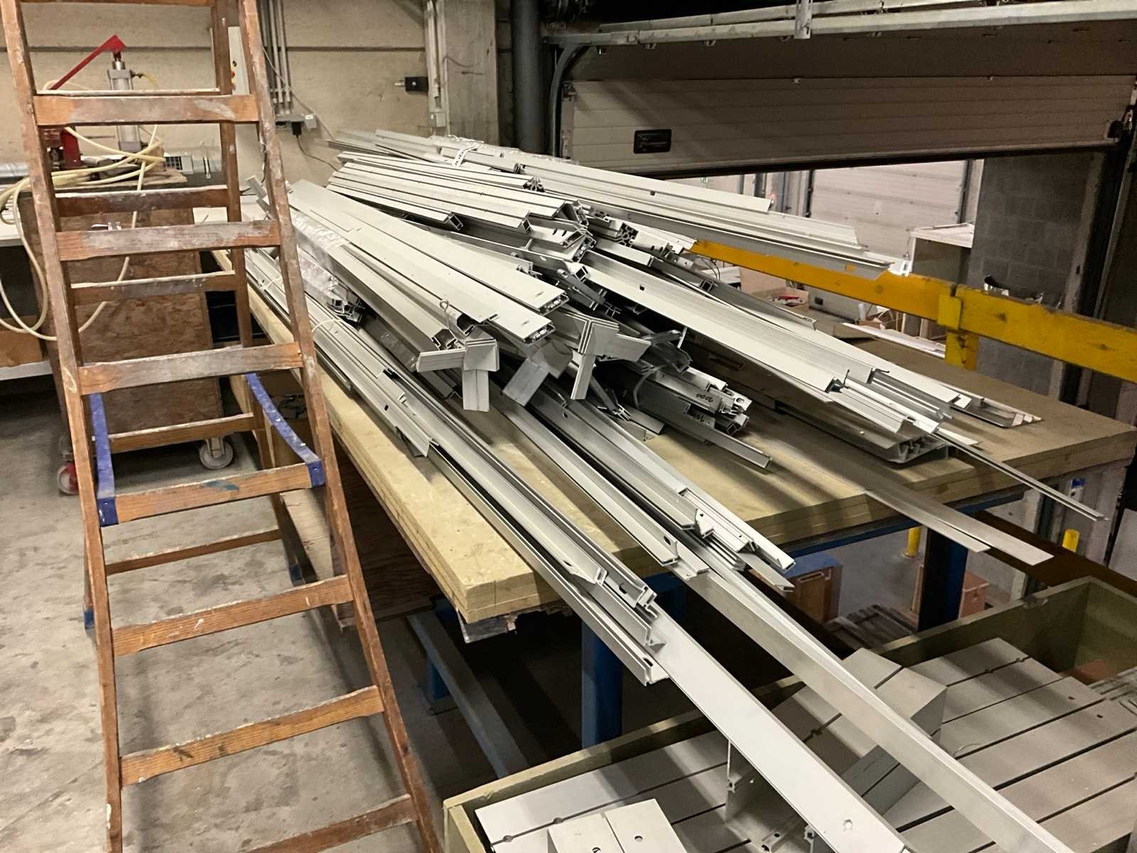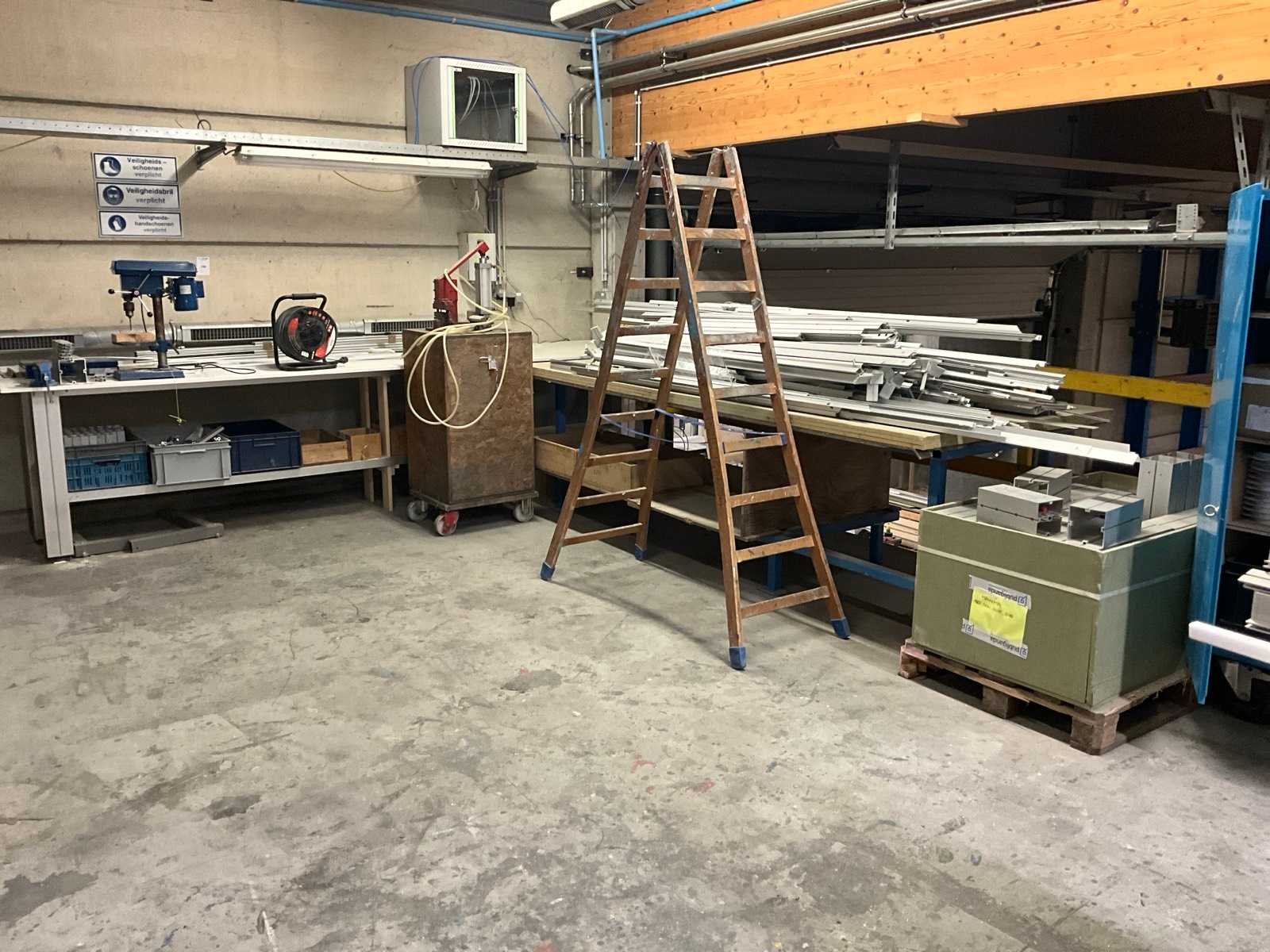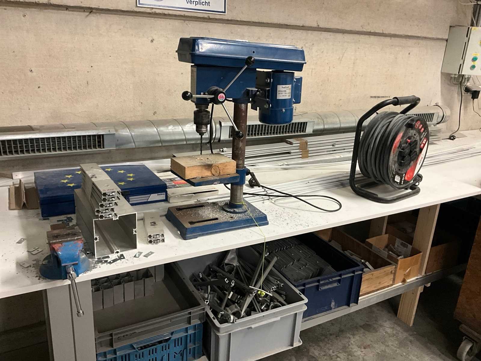 Bestaand uit Kolomboormachine tafelmodel, kabelhaspel Billie 40 meter 3G2,5 mm2, 2x werktafel met inhoud breedtes 3+4 meter, +1x pallet met koppelstukken aluminium, 1x 2-deurs magazijnkast met inhoud diverse montagetools, +1x pneumatische ponsmachine, + houten vouwladder met 2x 9 sporten Nee
