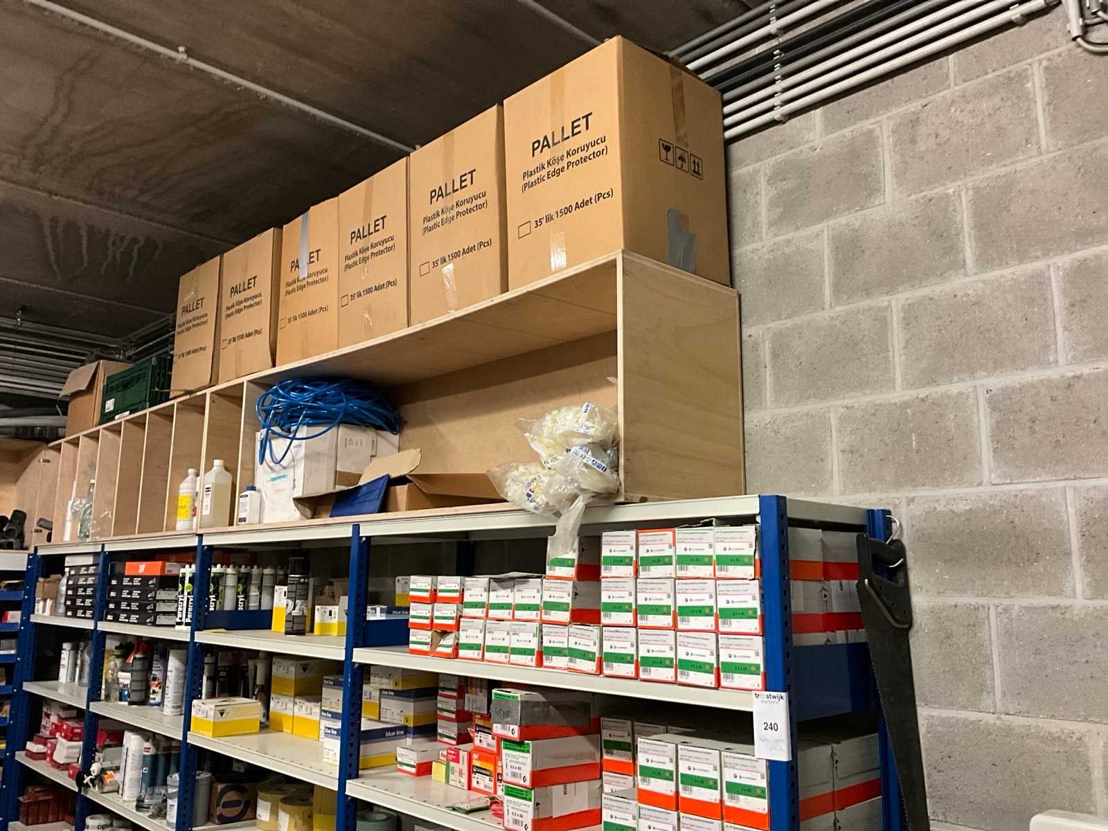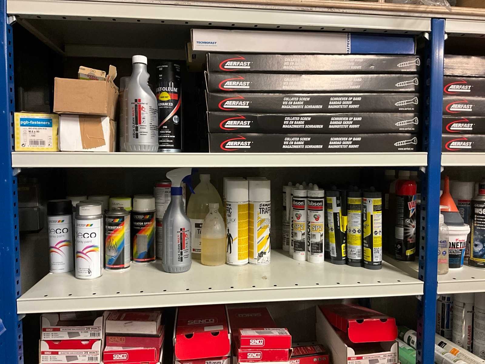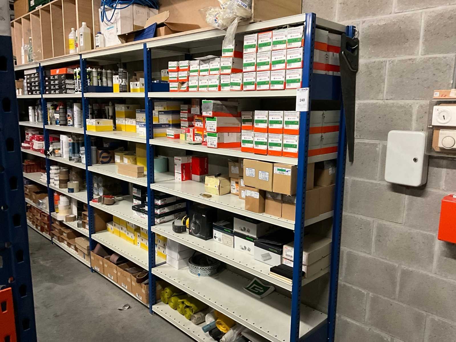 Bestaand uit demonteerbaar magazijnrek met inhoud waaronder vijzen, vuilniszakken, schuurpapier, selicone, Spit schroeven op band, pistoolnagels, kleefband enz… Nee Merk: Senco, aerfast, blue line, Sia, Festool