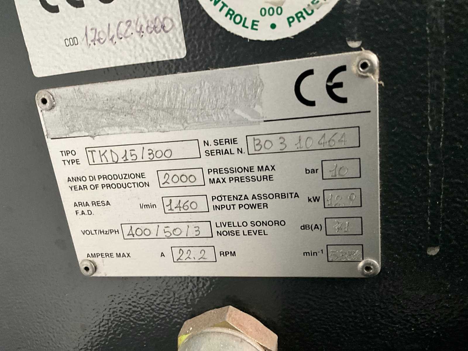 Voorzien van onderliggend drukvat 300 liter, werkuren 16936, op pallet Nee Merk: Force Type: TKD15/300 Bouwjaar: 2000 Serienummer: 30310464 Totale afmeting L: 700mm Totale afmeting Breedte: 1100mm Totale afmeting Hoogte: 1650mm