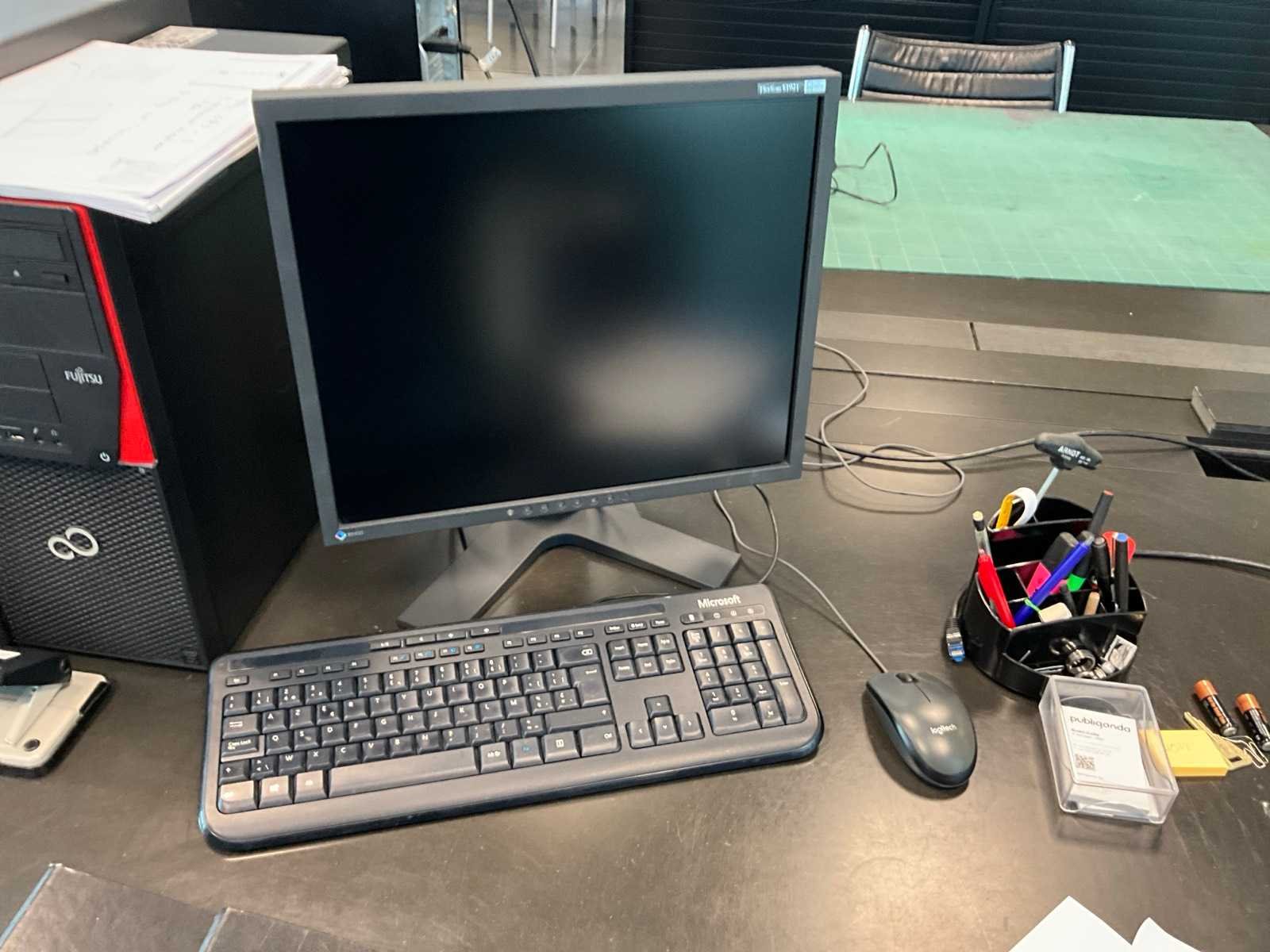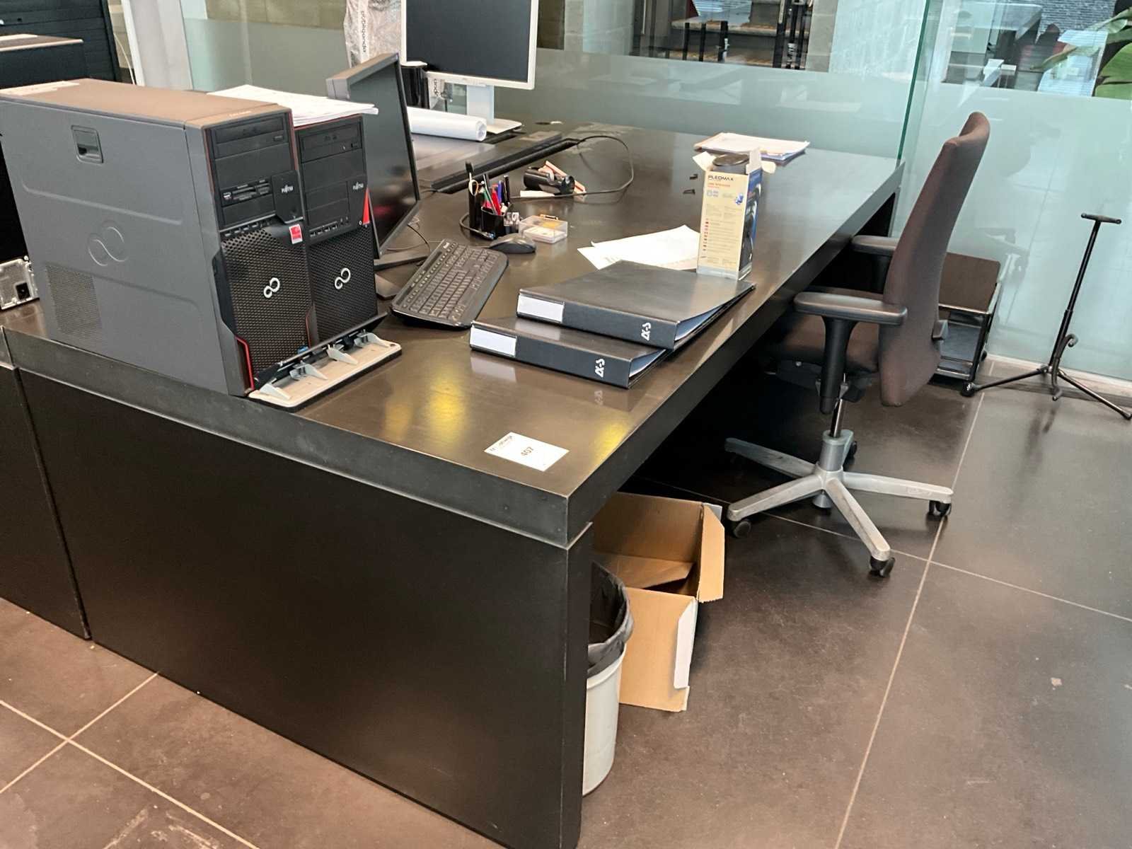 Bestaand uit 1x bureau, 1x bureaustoel, 2x rolgordijn Bureelkast zwart afmetingen 45x120x105 cm met inhoud, +2x scherm Eizo + LG, +2x klavier, 2x muis Nee Lengte: 120cm Breedte: 240cm Hoogte: 78cm Materiaal: Hout fineer zwart