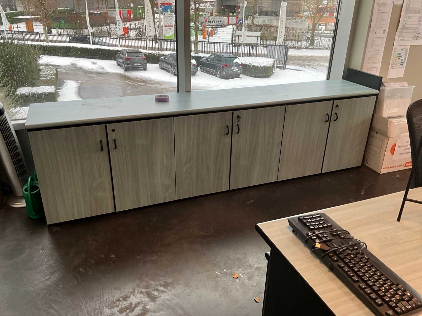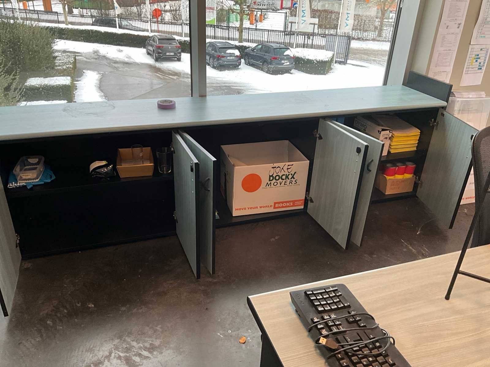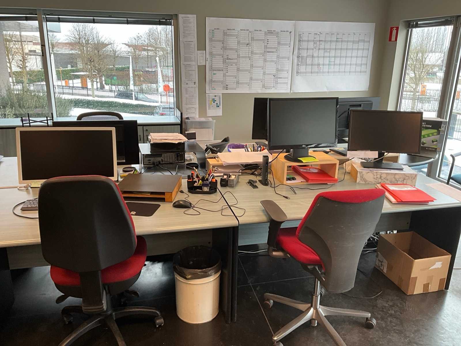 Bestaand uit 1x L-vormig bureau afmetingen 205x247x72 cm, +3x bureautafel breedte 160-180 met 4x bureaustoel + 1x bureautafel 80x120 mm, 1x gewone stoel,+2x ladekast, 2x scherm Fujitsu +1x Benq +3x Samsung met klavier en muis, + 6 deurs voorraadkast afmetingen 48x270x75 cm, +Whiteboard mobiel, kleine bureauaccesoires en kapstok enz.. Nee