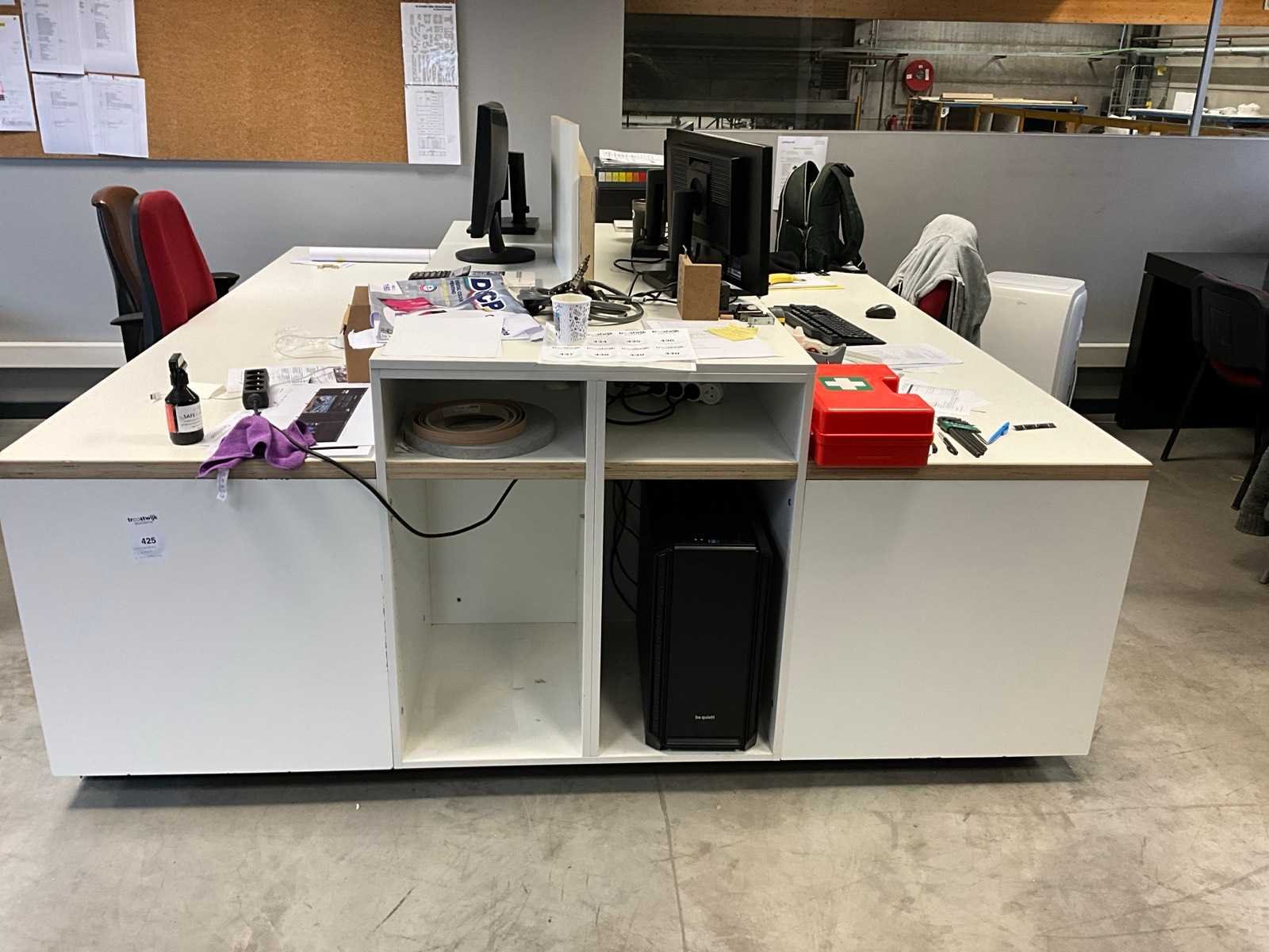 Bestaand uit geconstrueerd dubbel bureau afmetingen 250x230x100 cm met ingebouwde ladekasten, 3x bureaustoel, 4x scherm Samsung, klein bureaumateriaal, inhoud lades Nee