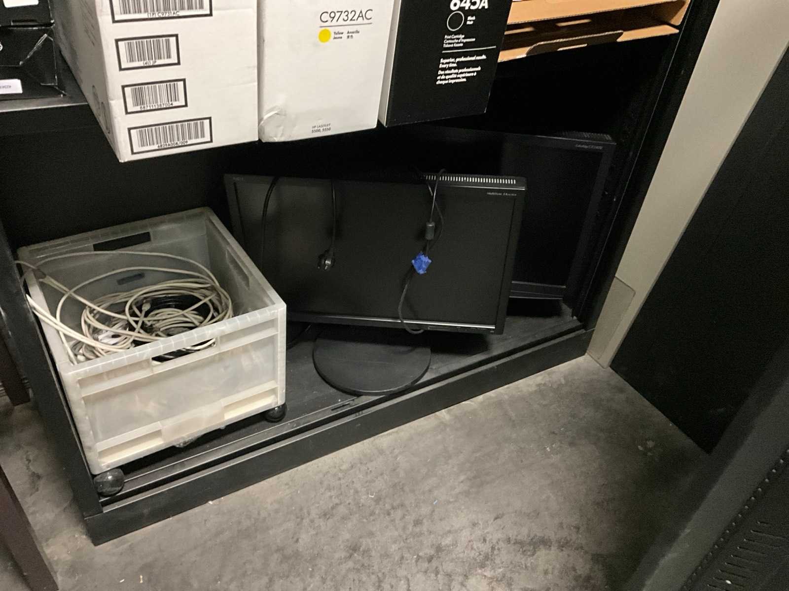 Bestaand uit circa 8 diverse schermen, kabels, HP toners enz.., in rolluikkast afmetingen 43x120x200 cm + 2x tafel Nee