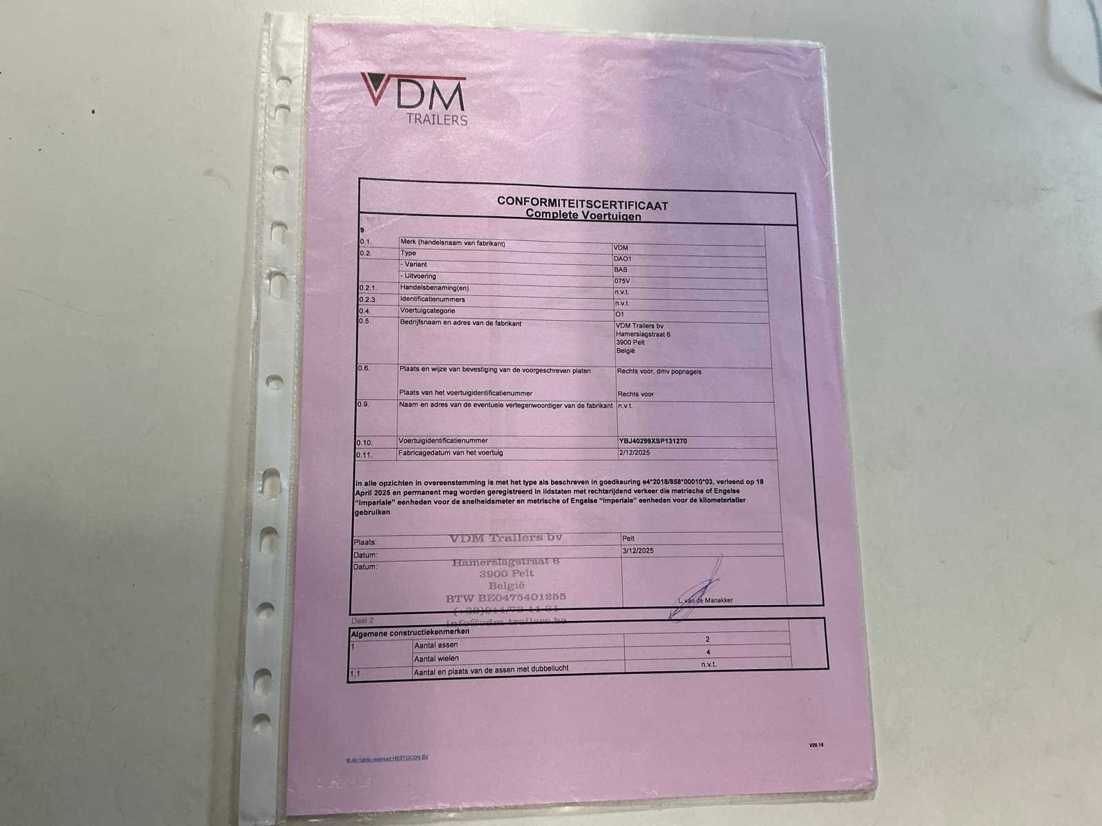 Nee Merk: VDM Trailers Type: DAO1 Bouwjaar: 2025 Chassisnummer: YBJ40299XSP131270 Aantal assen: 2 Laadbak afmeting l: 258cm Laadbak afmeting b: 134cm