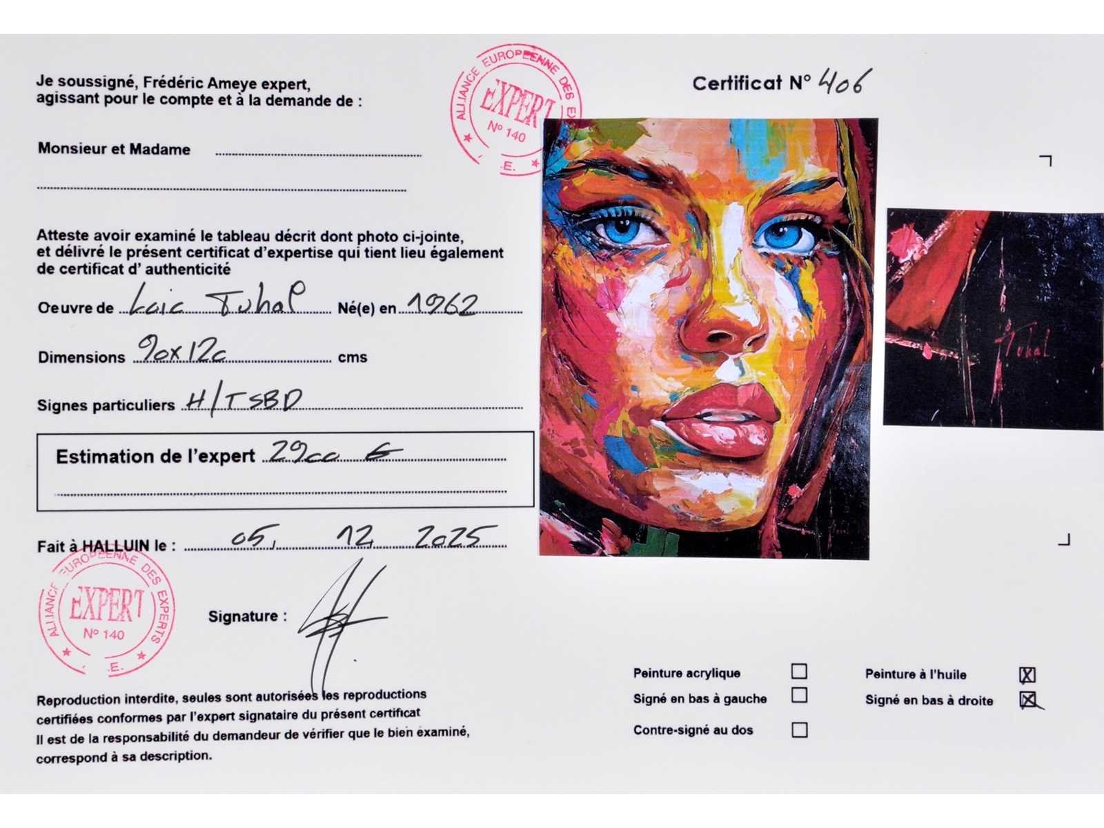 Ingelijst in baklijst - met certificaat - galerieprijs: 2.900 € Nee Kunstenaar: Loîc Tuhal (1962) Titel van werk: Angela Techniek: olie op doek Handtekening/oplage: true Oplage: Origineel Gesigneerd: Gesigneerd Hoogte: 120cm Breedte: 90cm Hoogte incl. lijst: 131cm Breedte incl. lijst: 101cm Frame: true