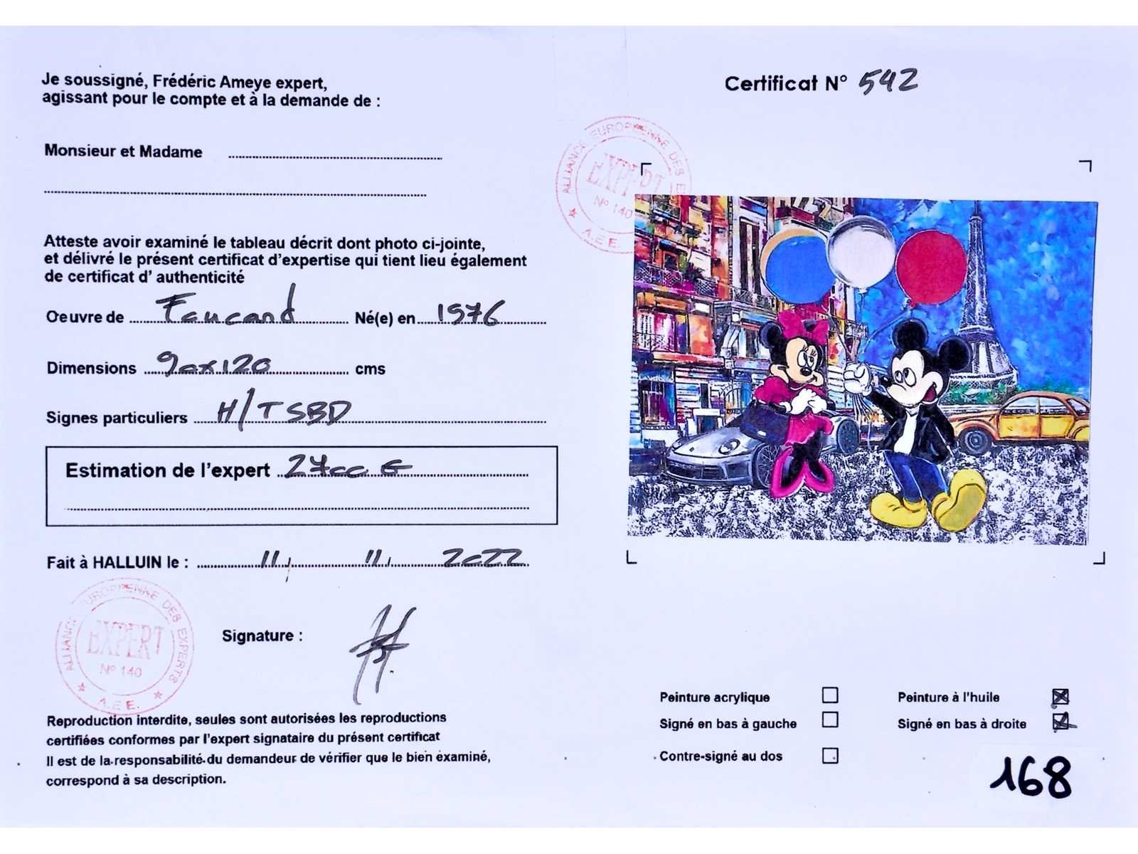 Origineel groot werk - ingelijst in baklijst - galerieprijs: 2.700 € - wordt geleverd met certificaat Nee Kunstenaar: G. Foucard ( 1976 - ) Titel van werk: Minnie en Mickey in Parijs Techniek: olieverf op doek Handtekening/oplage: true Gesigneerd: Gesigneerd Hoogte: 90cm Breedte: 120cm Hoogte incl. lijst: 103cm Breedte incl. lijst: 133,5cm Frame: true