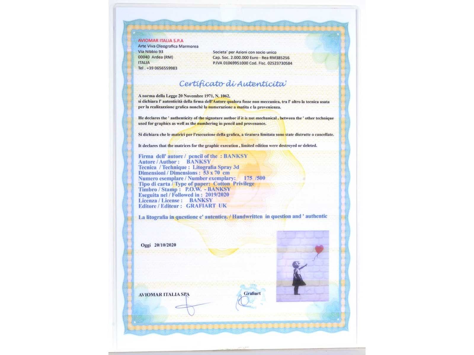 Getekend in druk - met certificaat Nee Kunstenaar: Banksy (naar) Titel van werk: Girl with baloon Techniek: offset Oplage: 175/500 Hoogte: 69cm Breedte: 50cm