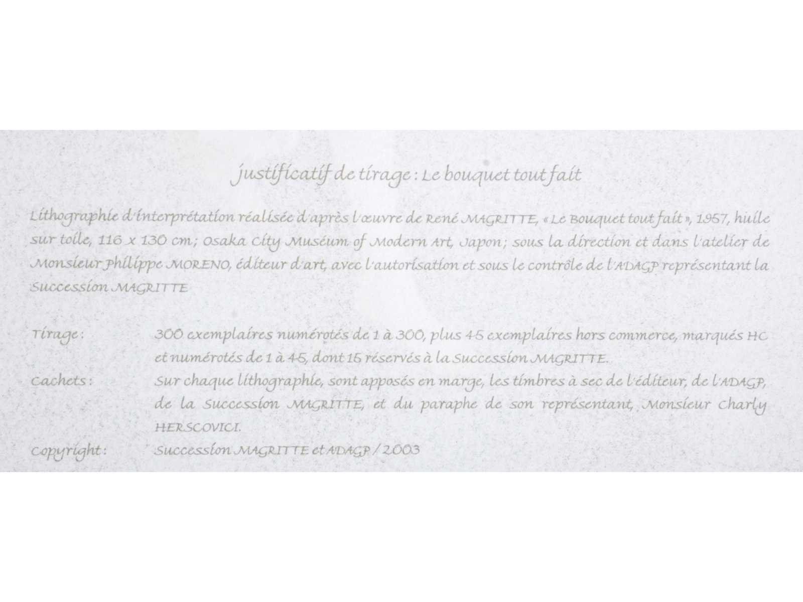 Lithografie naar het werk van René Magritte 'Le bouquet tout fait’ uit 1957 - Voorzien van de droogsptempel van ADAGP en van de Succession Magritte alsook de paraf van Charly Herscovice - Betreft het grootste uitgegeven formaat van de reeks naar Magritte Nee Kunstenaar: (naar) René Magritte (1898 - 1967) Titel van werk: Le bouquet tout fait Techniek: Lithografie Handtekening/oplage: false Oplage: 123/300 Hoogte: 77,5cm Breedte: 57,5cm Frame: false