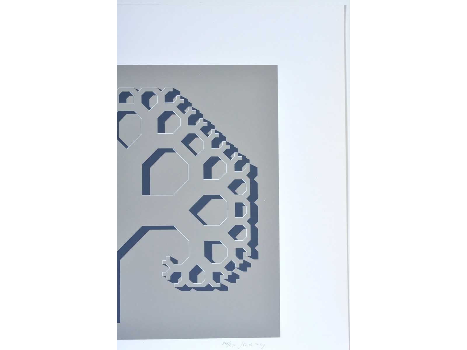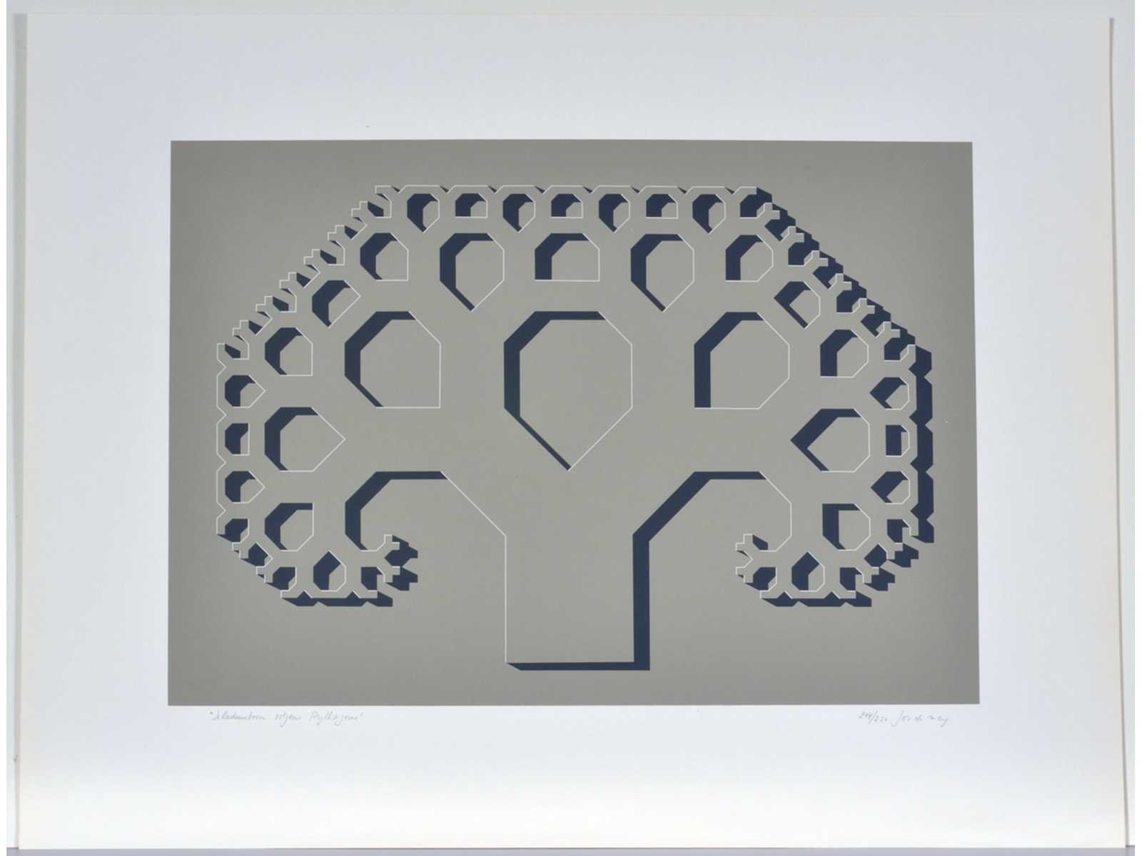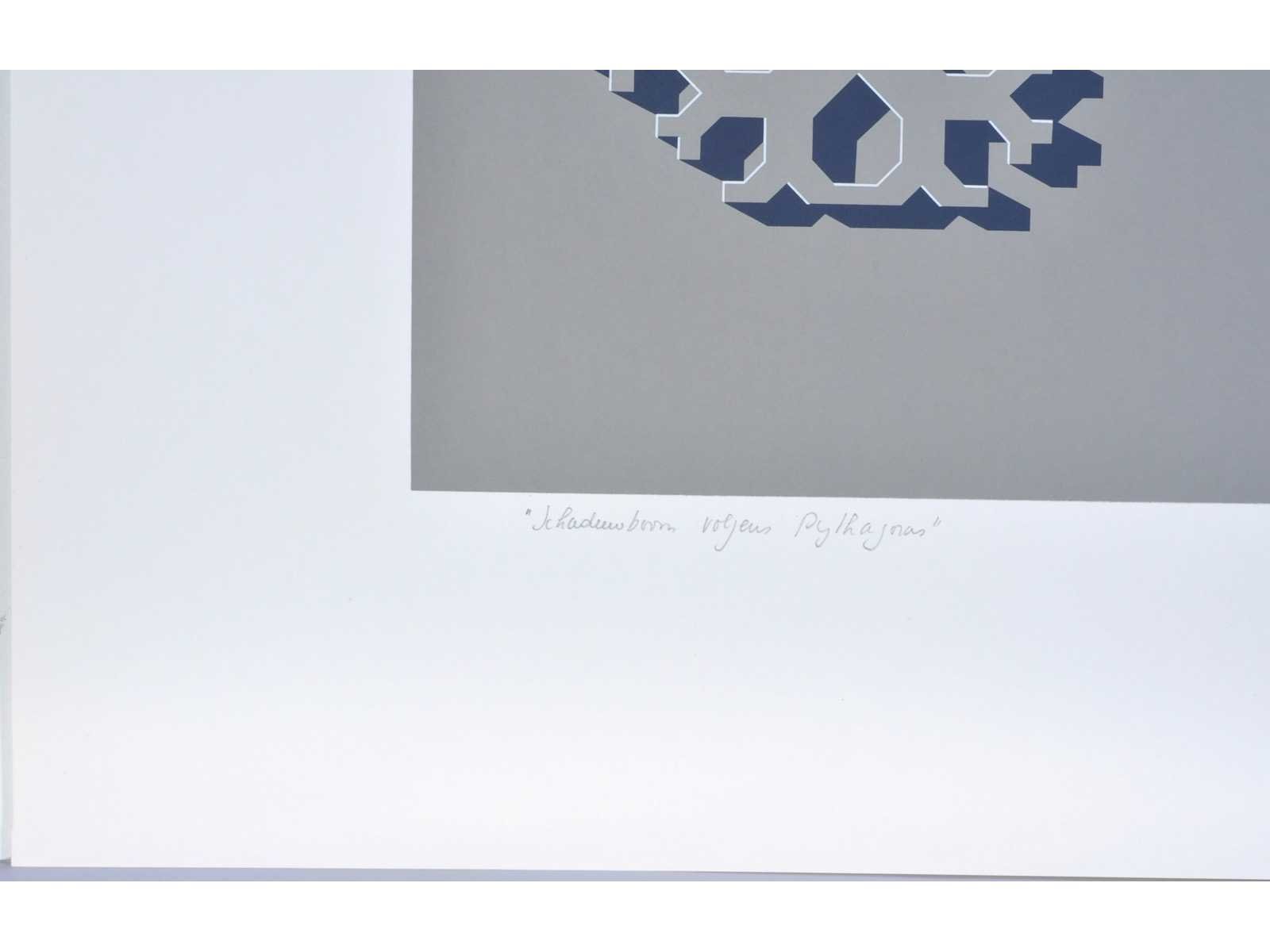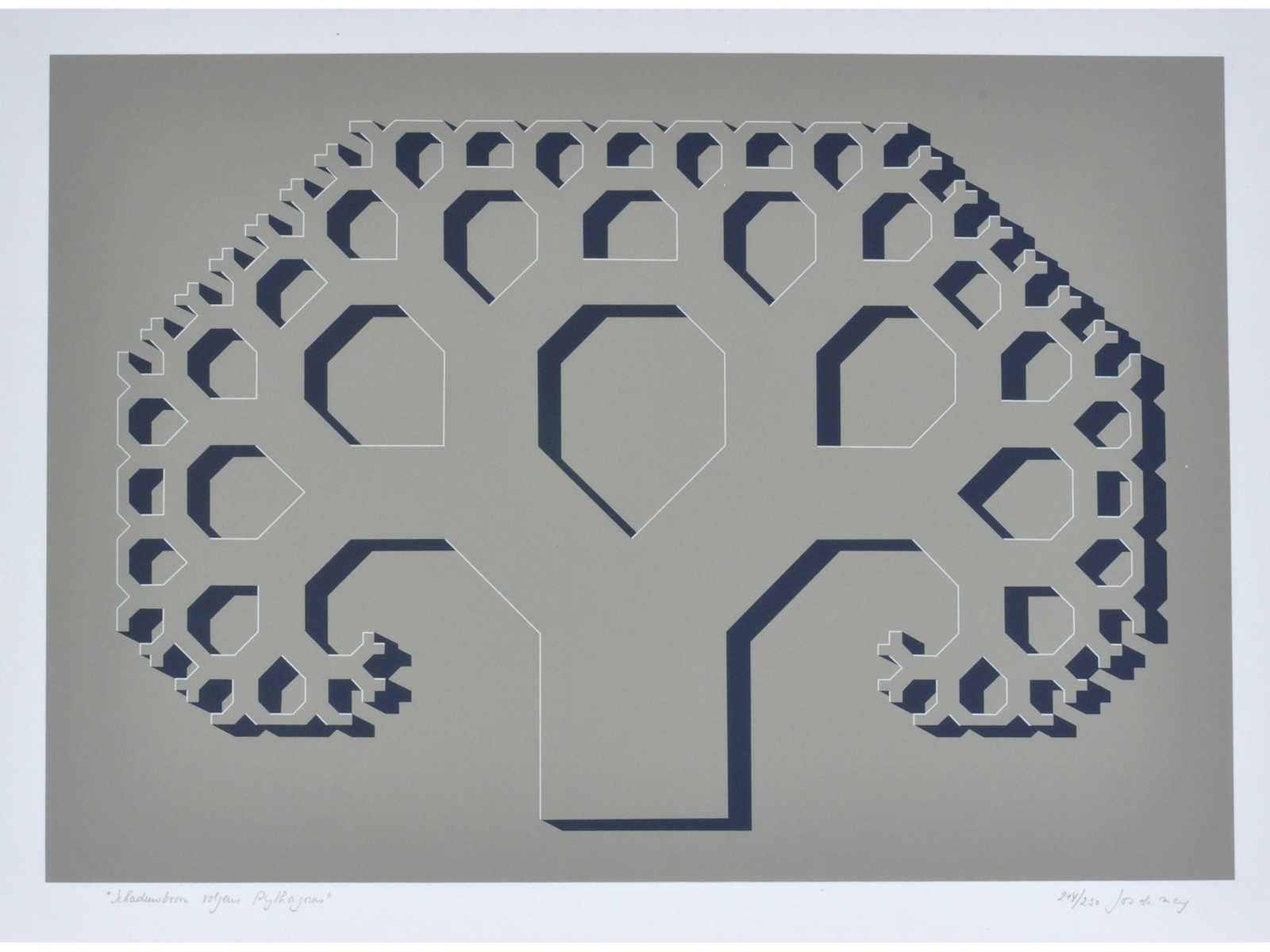 Drukatelier: Beca-Screen, Ekeren - Uitgever: Peter Bekaert, 1977 - In puntgave staat, nooit voorheen ingelijst, steeds in de grafiekmap bewaard - Bijgevoegd: bijhorende tekst op een afzonderlijk blad Nee Kunstenaar: Jos De Mey (1928-2007) Titel van werk: Schaduwboom volgens Pythagoras Periode: 1977 Datering: 1977 Techniek: Zeefdruk Handtekening/oplage: true Oplage: 214/250 Gesigneerd: Gesigneerd en genummerd Hoogte: 55cm Breedte: 42cm