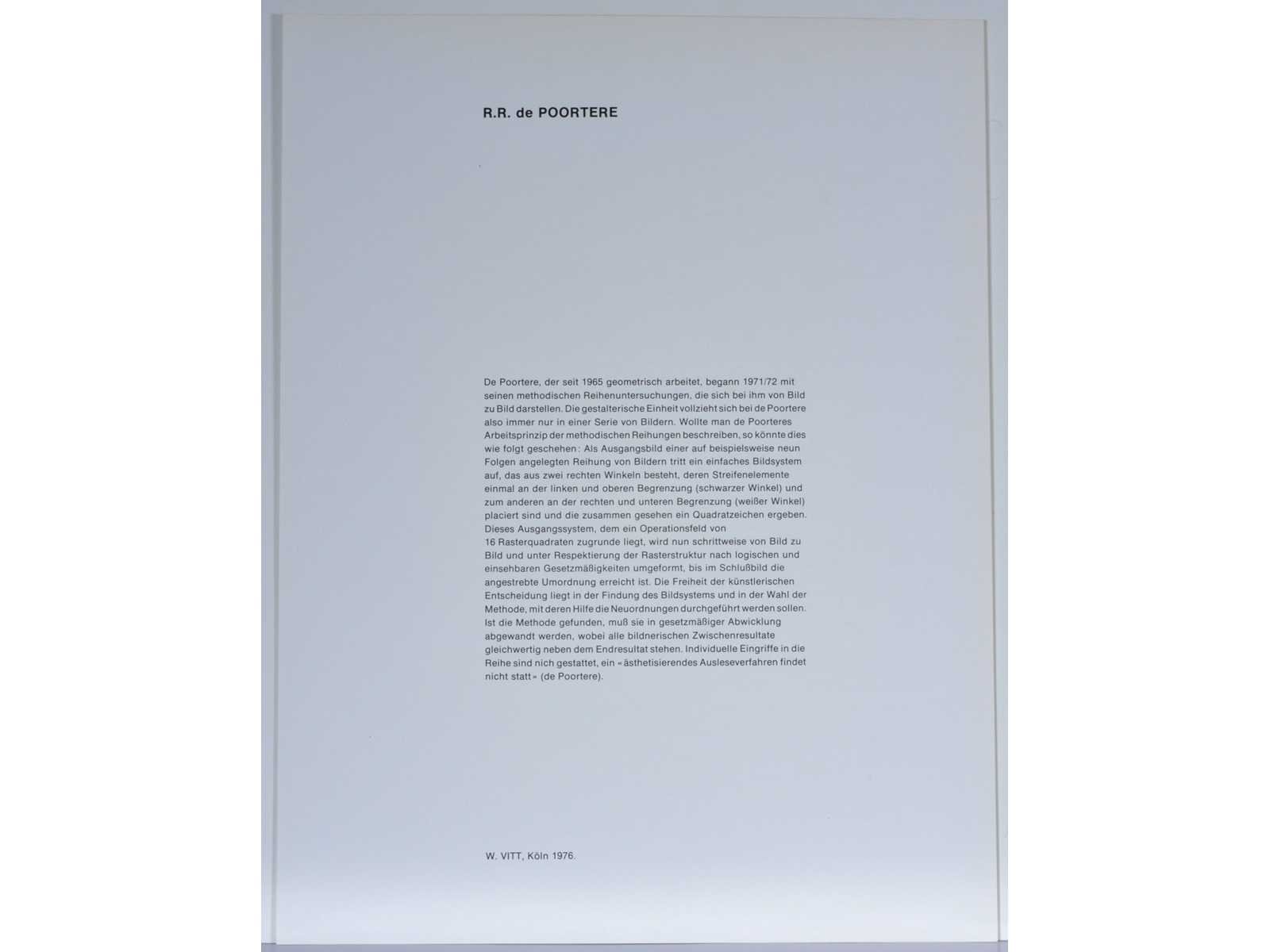 Drukatelier: Beca-Screen, Ekeren - Uitgever: Peter Bekaert, 1977 - In puntgave staat, nooit voorheen ingelijst, steeds in de grafiekmap bewaard - Bijgevoegd: bijhorende tekst op een afzonderlijk blad Nee Kunstenaar: R.R. de Poortere Periode: 1977 Datering: 1977 Techniek: Zeefdruk Handtekening/oplage: true Oplage: 214/250 Gesigneerd: Gesigneerd en genummerd Hoogte: 55cm Breedte: 42cm