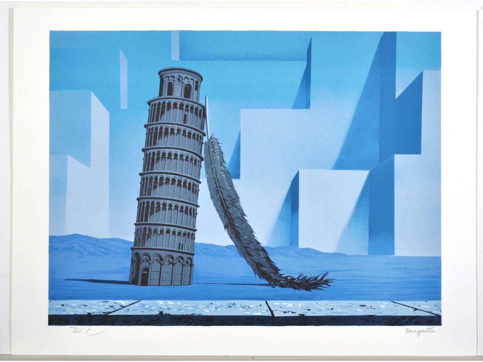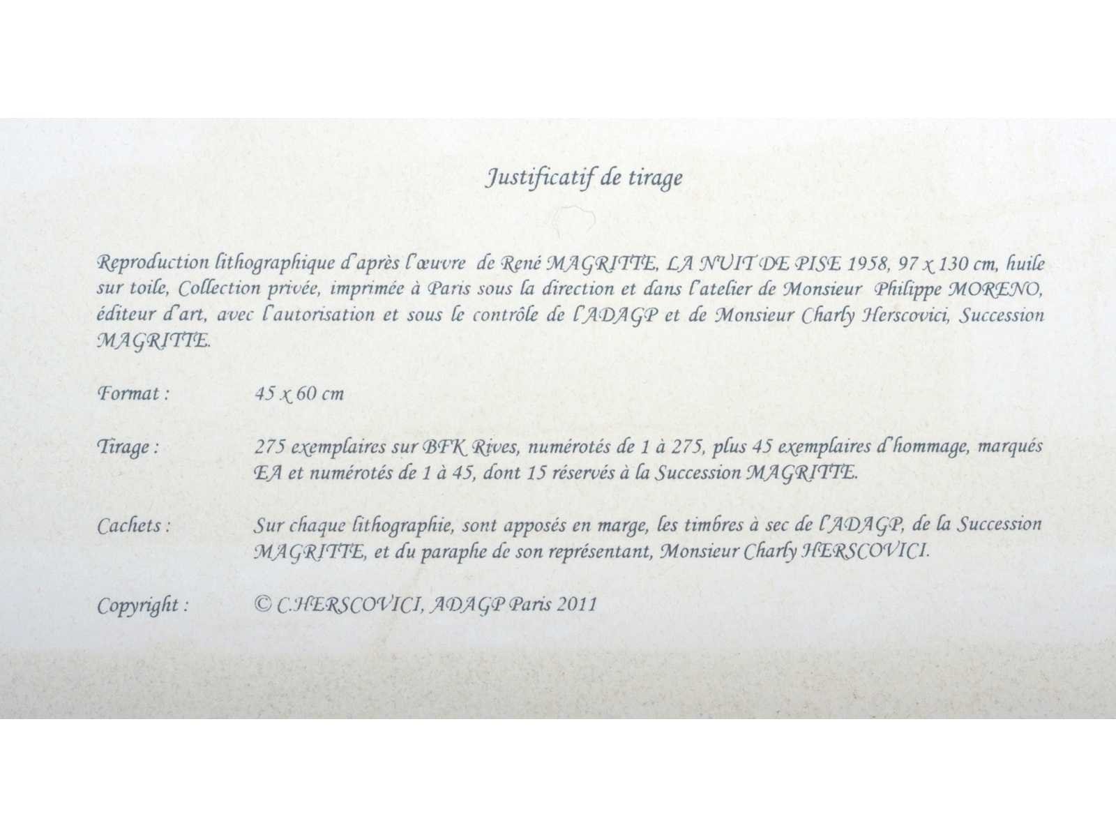 Lithografie naar het werk van René Magritte 'La nuit de Pise’ uit 1939 - Voorzien van de droogsptempel van ADAGP en van de Succession Magritte alsook de paraf van Charly Herscovice Nee Kunstenaar: (naar) René Magritte (1898 - 1967) Titel van werk: La nuit de Pise Techniek: Lithografie Handtekening/oplage: false Oplage: 114/275 Hoogte: 45cm Breedte: 60cm Frame: false