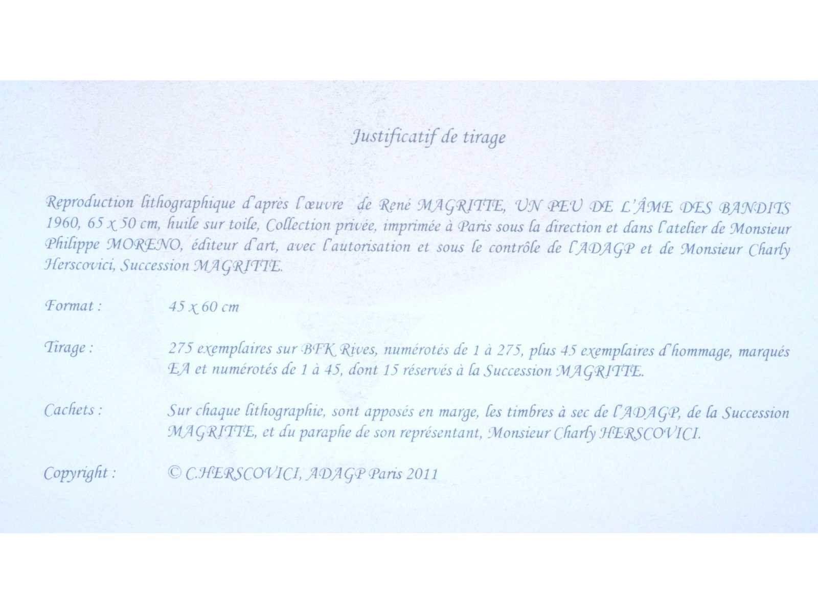 Lithografie naar het werk van René Magritte 'Un peu de l'âme des bandits’ uit 1960 - Voorzien van de droogsptempel van ADAGP en van de Succession Magritte alsook de paraf van Charly Herscovice Nee Kunstenaar: (naar) René Magritte (1898 - 1967) Titel van werk: Un peu de l'âme des bandits Techniek: Lithografie Handtekening/oplage: false Oplage: 178/275 Hoogte: 60cm Breedte: 45cm Frame: false