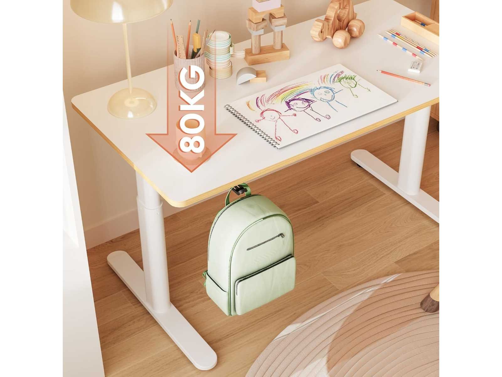 Hoogte verstelbaar: Ergonomisch ontworpen, biedt dit bureau een verstelbare hoogte van 55-81 cm om kinderen van alle leeftijden en maten te accommoderen en rug- en nekbelasting te minimaliseren. Deze functie stelt het kantoor in staat om met uw kind mee te groeien en bevordert hun zelfstandigheid. Stevige constructie: Dit bureau is gemaakt van duurzaam materiaal en heeft slipvaste voeten die bestand zijn tegen regelmatig gebruik. Het kan tot 80 kg dragen, wat het gewicht van boeken, een laptop en andere schoolspullen kan dragen. De grote tray van 120 x 60 cm biedt uw kind een georganiseerde en betrouwbare werkplek. Afgeronde hoeken: tafelblad zonder ruwheid. De afgeronde hoeken minimaliseren het risico op snijwonden en verminderen daardoor het risico op ongelukken of letsels. Kabelbinders worden geleverd en kunnen onder het bureau worden bevestigd om kabelklitten te voorkomen en de veiligheid van kinderen te waarborgen. Lage geluidsniveau: zeer stille werking. Rustig functioneren is vooral belangrijk op scholen of thuis om storing te voorkomen en het sensorische comfort voor kinderen en huisdieren te optimaliseren. Non