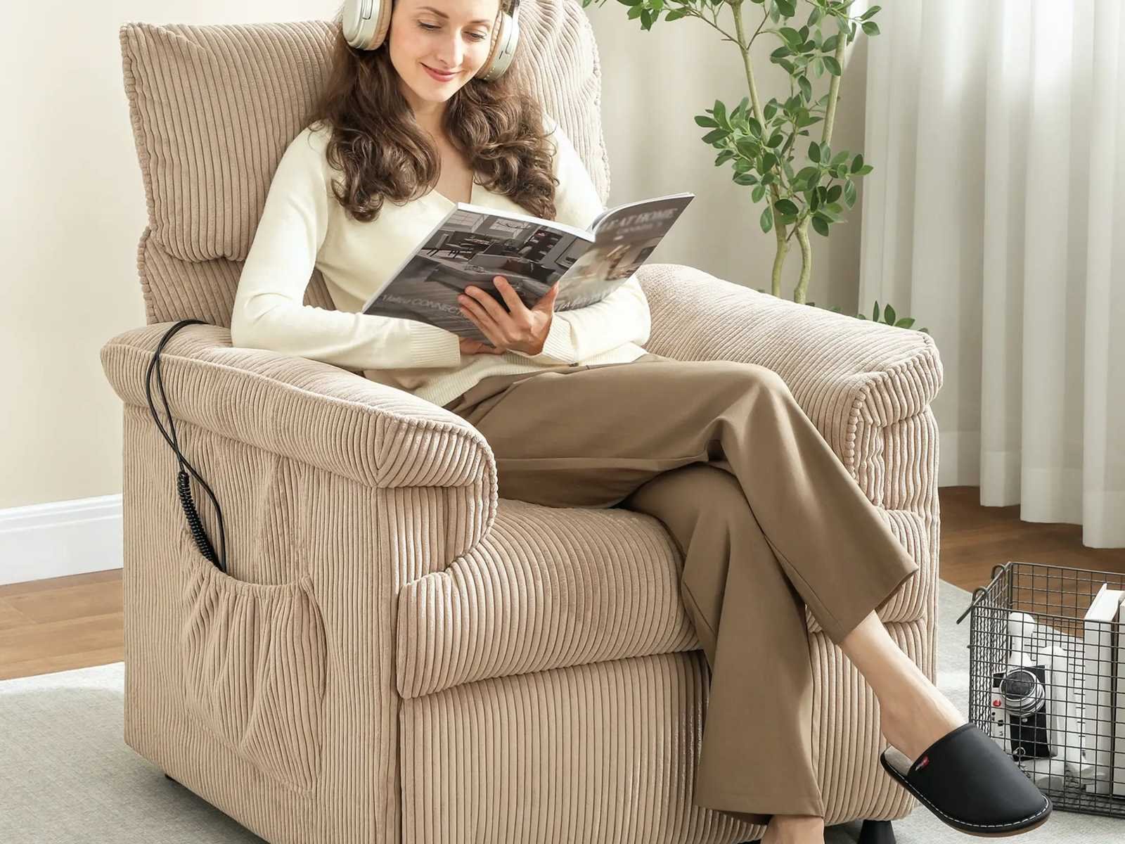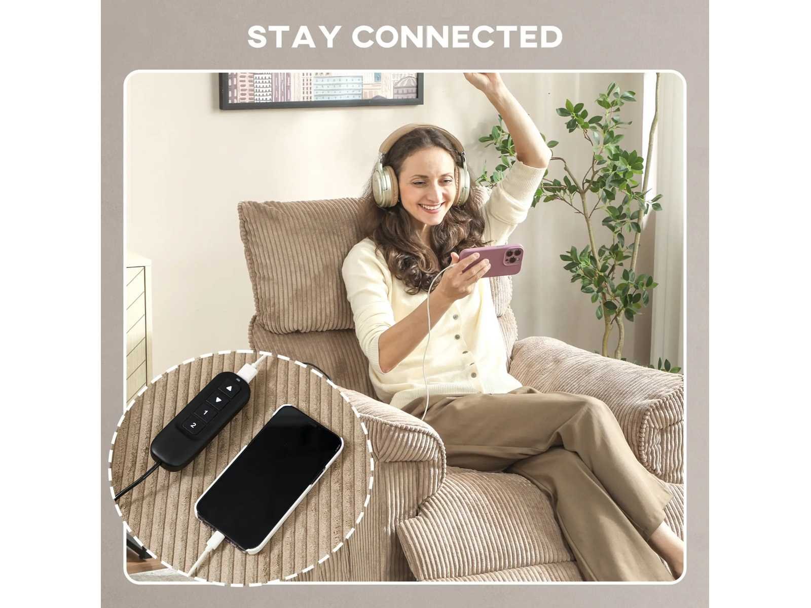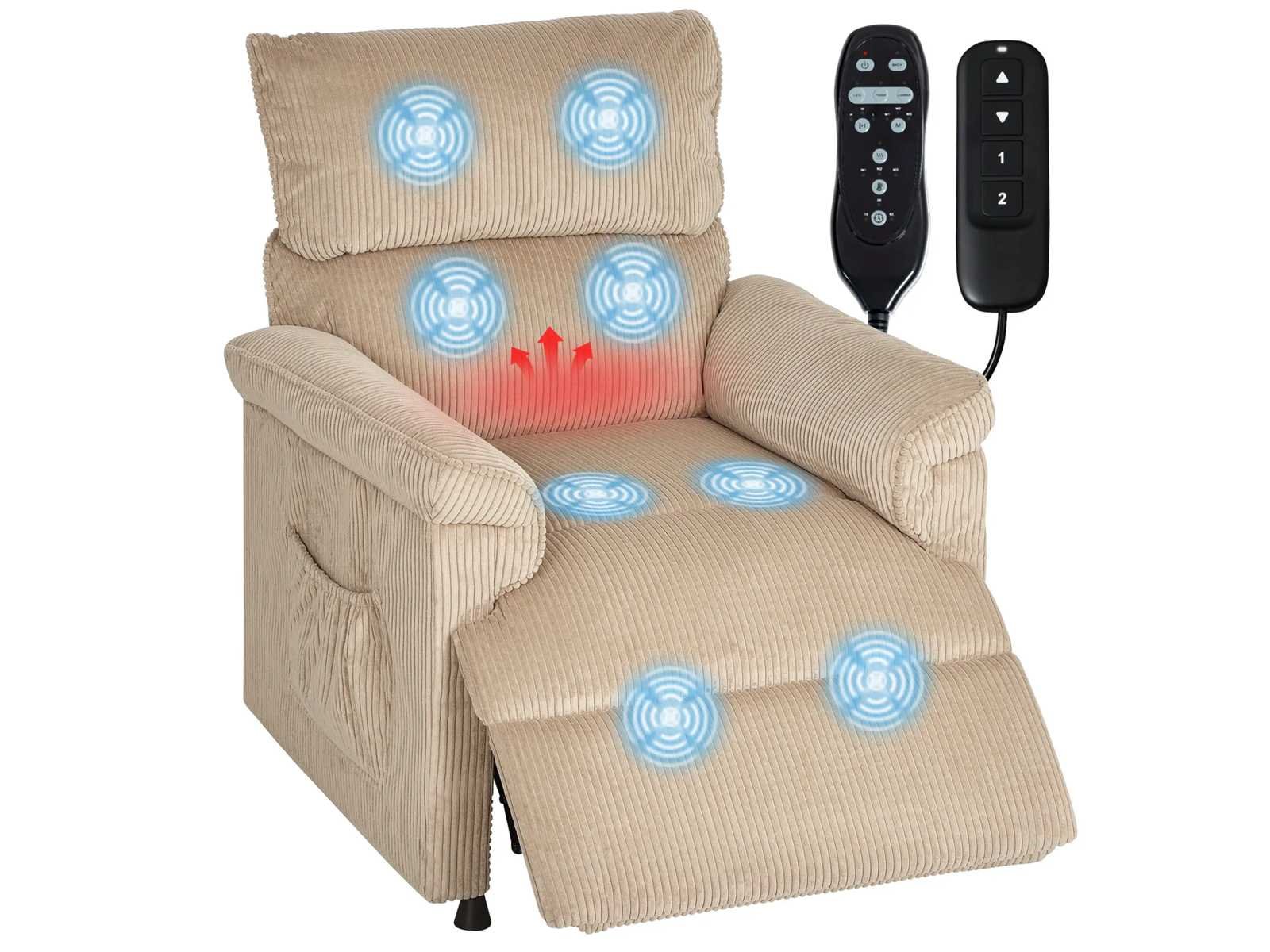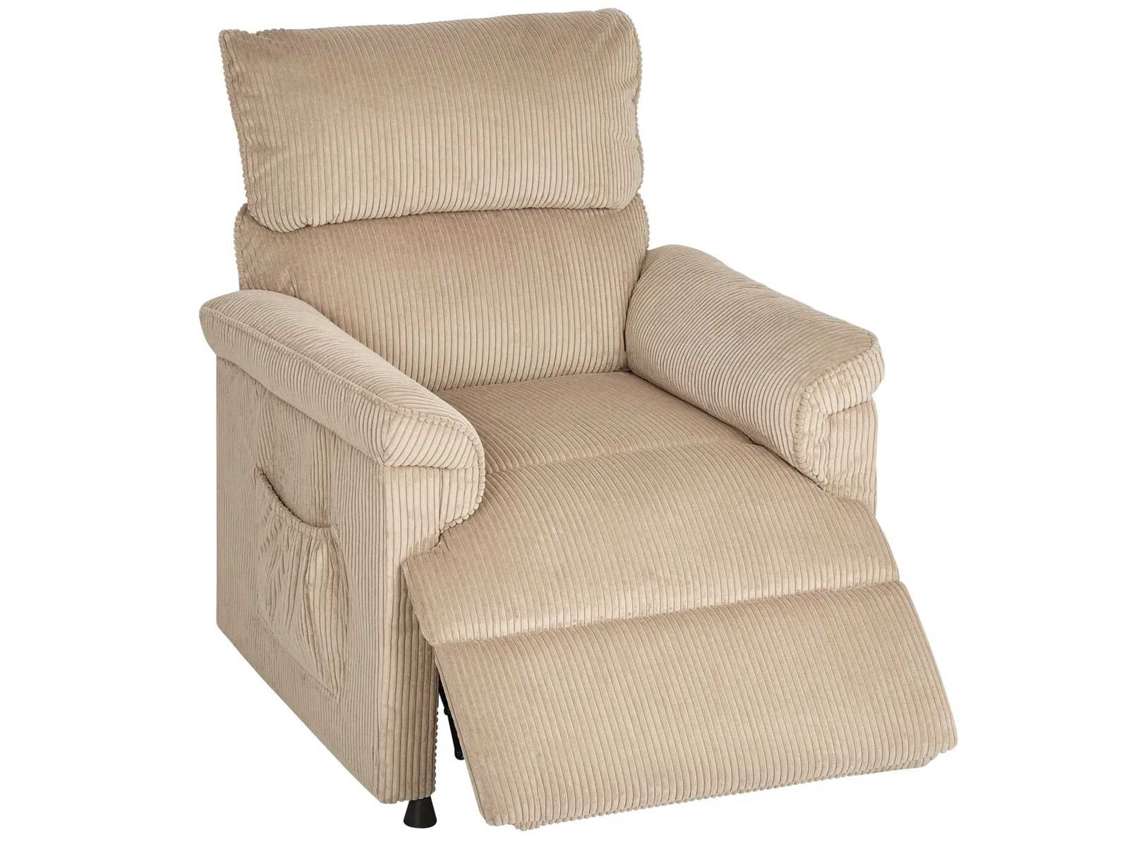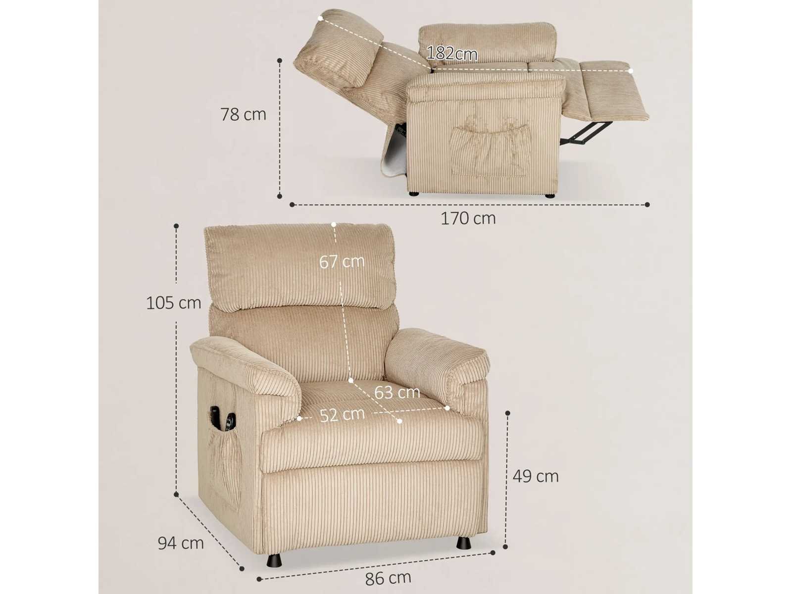 Specificaties: - Kleur: Bruin - Materiaal: Corduroy (100% polyester), schuim, metaal - Totale afmetingen: 86B x 94T x 105H cm (in rechtopstaande positie), 86B x 170T x 78H cm (schuin) - Zitmaat: 52B x 63T cm - Zithoogte: 49 cm - Rugleuningmaat: 68B x 67H x 18T cm - Armleunhoogte (vanaf de vloer): 67 cm - Ingang: AC 100-240V, 50-60Hz - Uitgang: DC 29V/1,0A, 29W (motor) DC 12V/1.0A, 12W (massage) - Kabellengte: 170 cm (relaxstoel), 180 cm (massage) - Laadvermogen: 120 kg Non