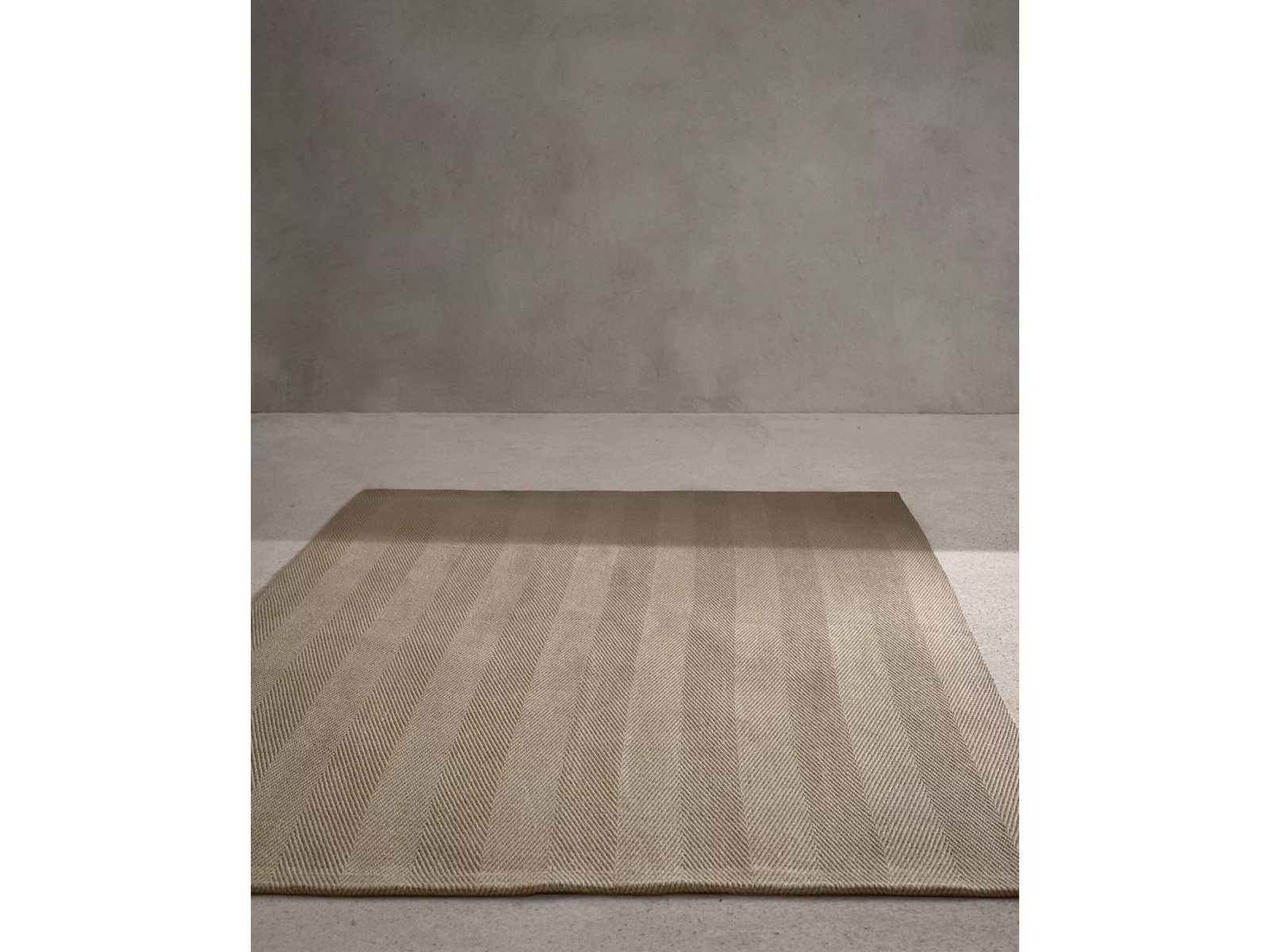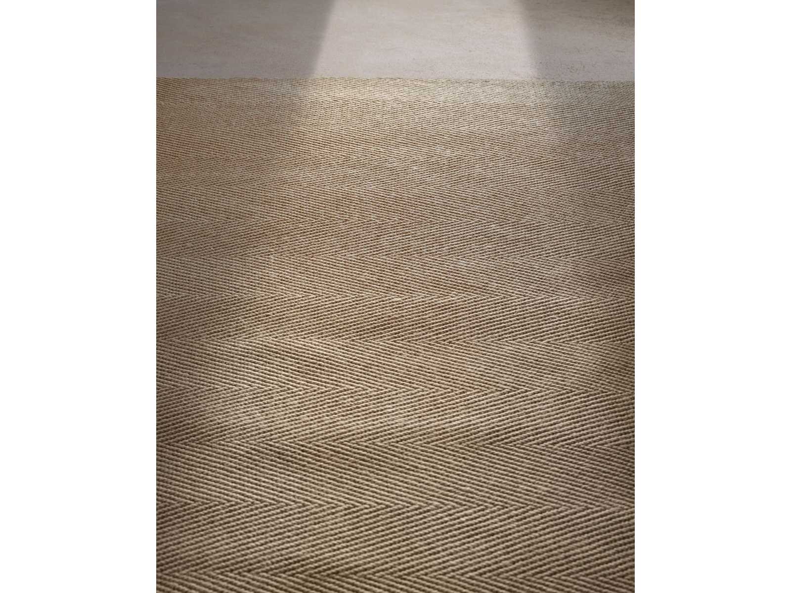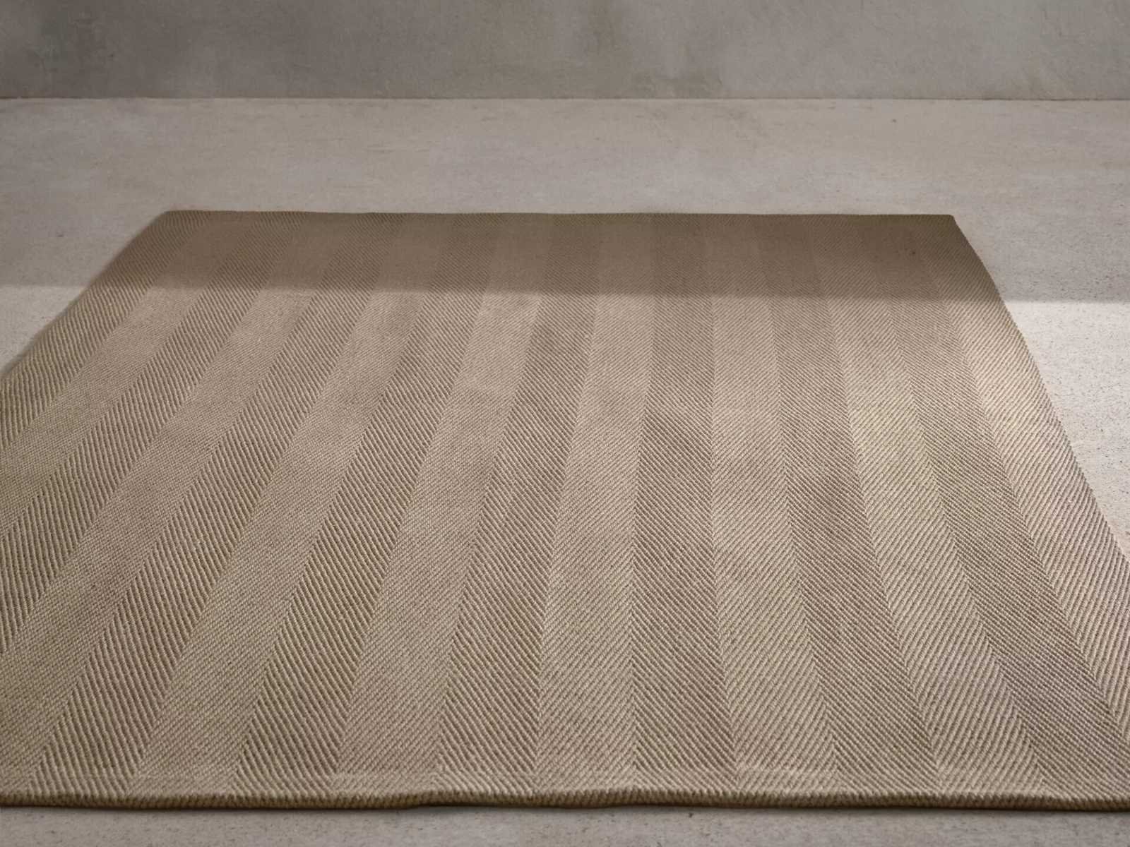 Een tijdloos tapijt met visgraatprint, zeer terugkerend in de ontwerpen van Vincent Van Duysen. Gemaakt van jute, tekent de toon-op-toon print visgraatblokken met een klein reliëf en speelt met vormen. Gemaakt in India. Non