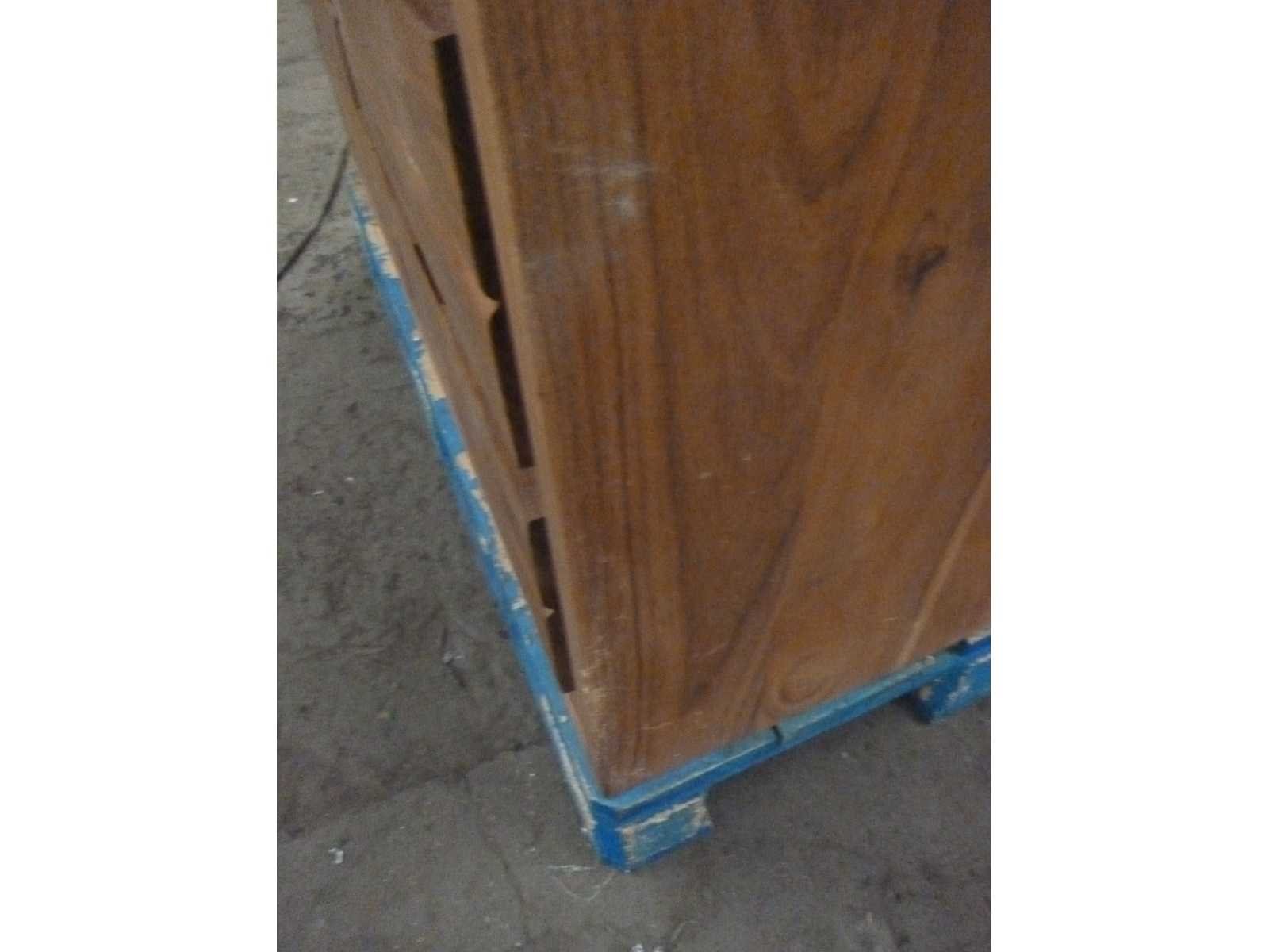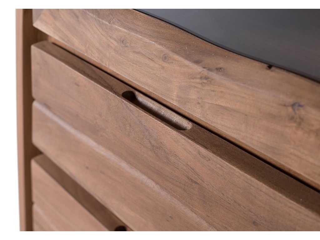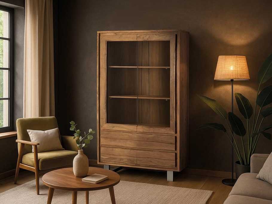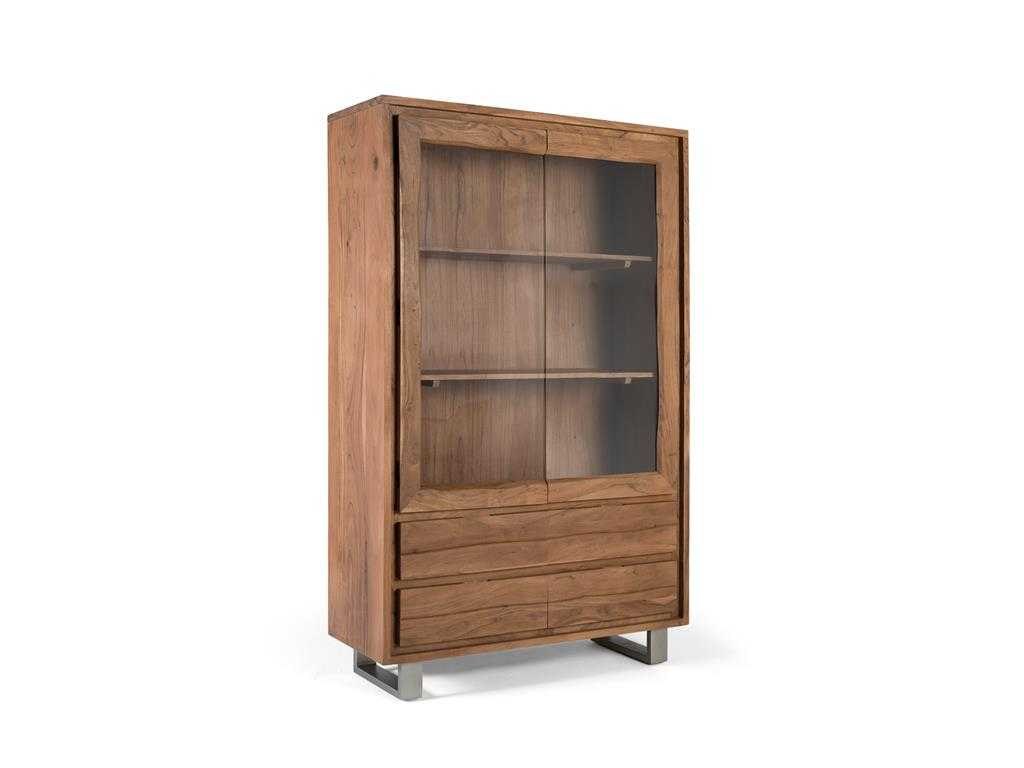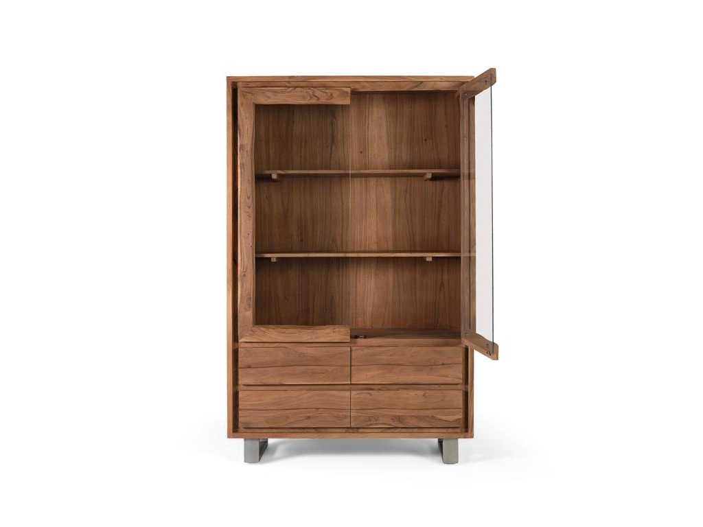 Een vitrinekas van massief acaciahout met een sobere en moderne stijl. Het is uitgerust met twee glazen deuren met frames, waardoor het interieur, dat bestaat uit twee ruime planken, kan worden tentoongesteld. Eronder zitten vier grote lades met gladde houten fronten en zonder zichtbare handgrepen. Hij staat op rechte metalen poten, wat hem een lichte en industriële uitstraling geeft, in contrast met de natuurlijke warmte van de acacia. Ideaal voor ruimtes die functionele opslag met een stijlvol ontwerp vereisen, zoals eetkamers, woonkamers of kantoren. ? Hoogte: 190 cm. ? Breedte: 120 cm. ? Lengte: 45 cm. ? Materiaal: Acaciahout ? Kleur: Natuurlijk. ? Gewicht: 115 kg. ? Doosafmetingen: 182x126x51cm. ? Assemblage vereist. Non