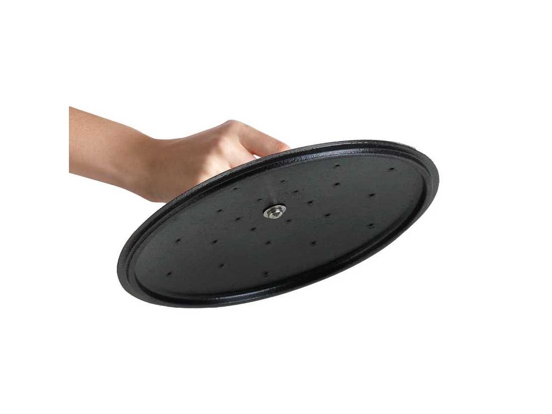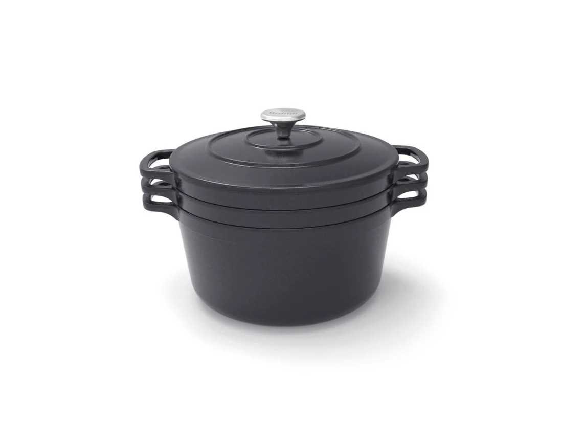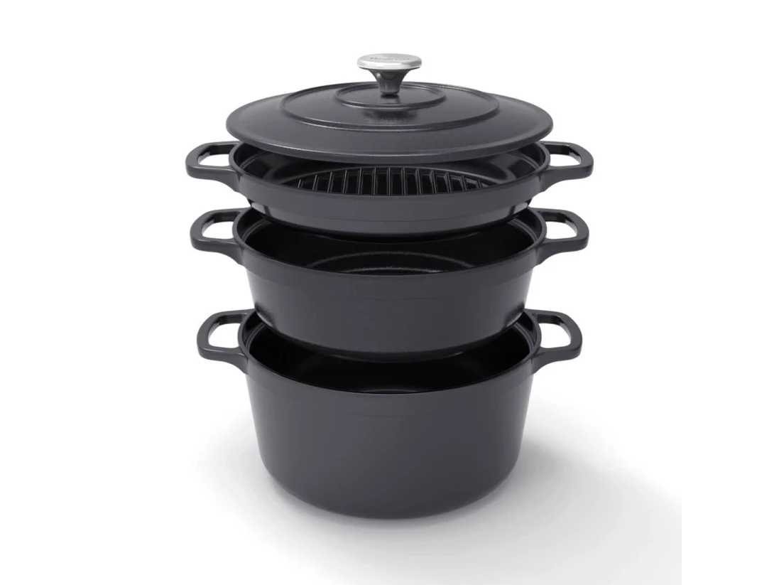 - Een 25 cm gietijzeren ovenschaal - Een 25 cm gietijzeren koekenpan - Een 25 cm gietijzeren grillpan - Een 25 cm gietijzeren deksel Non