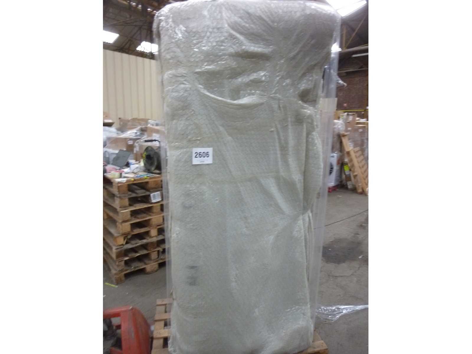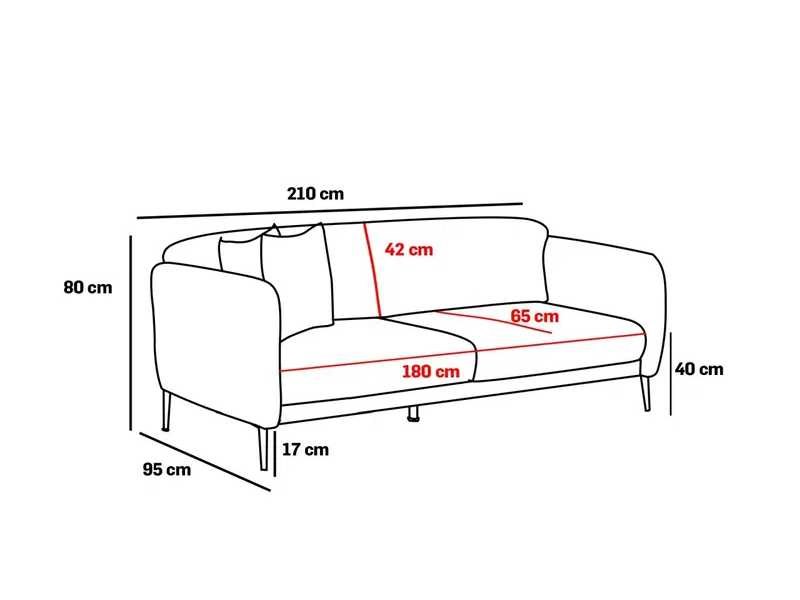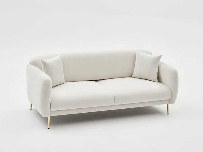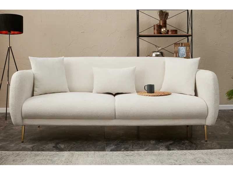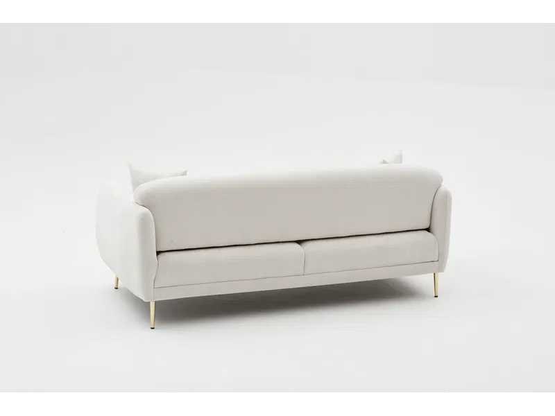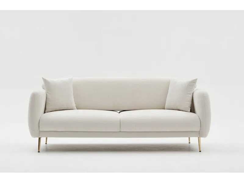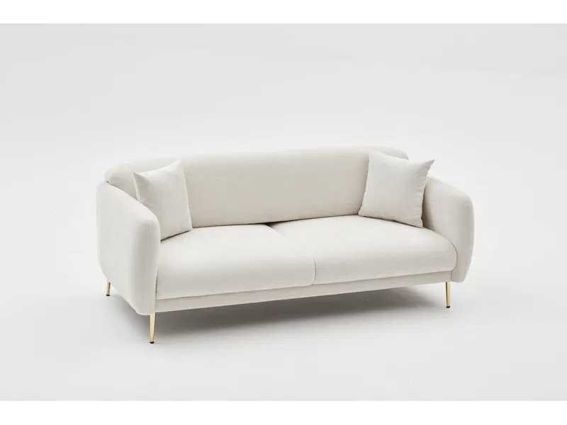 Sofa met 28 DNS schuimvulling in de zitting en deeltjesschuim in de rugleuning. Metalen benen, 17 cm hoog. Gouden benen. Beukenhouten constructie. Polyester bekleding. Crèmekleur. 3-zits bank. Afmetingen: 210 cm breed x 80 cm hoog x 95 cm diep. Afmetingen, eenmaal omgezet in een bed: 90 cm breed x 180 cm diep. Non