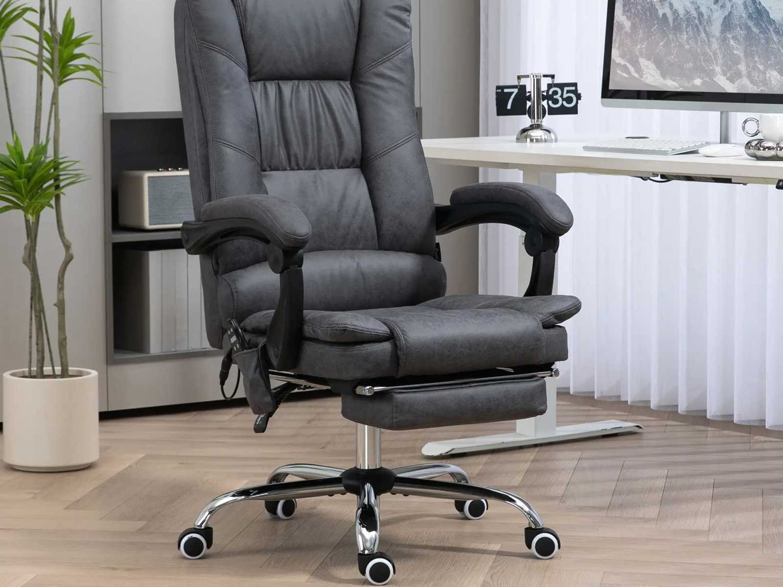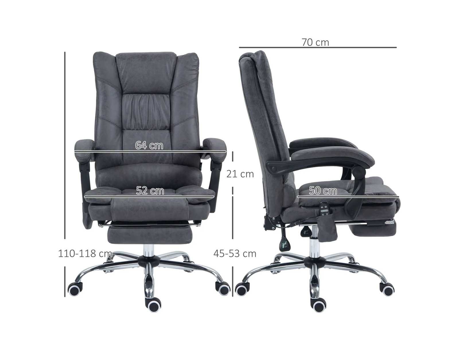 - Kleur: Donkergrijs - Materiaal: Microvezel (100% polyester), schuim, metaal, plastic - Totale afmetingen: 64L x 70B x 110-118H cm - Langgerekte oppervlakte: 64L x 146B x 94-102H cm - Zitmaat: 52B x 50D cm - Zithoogte: 45-53 cm - Hoogte van armleuning tot zitplaats: 21 cm - Rugsteunmaat maat: 50L x 71B cm - Zitdikte: 13 cm - Rugleuningdikte: 13 cm - Kabellengte: 1,8 m - Draagvermogen: 120 kg - Ingang: 100-240 V, 50/60 Hz - Uitgang: 12 V/1 A, 12 W Non