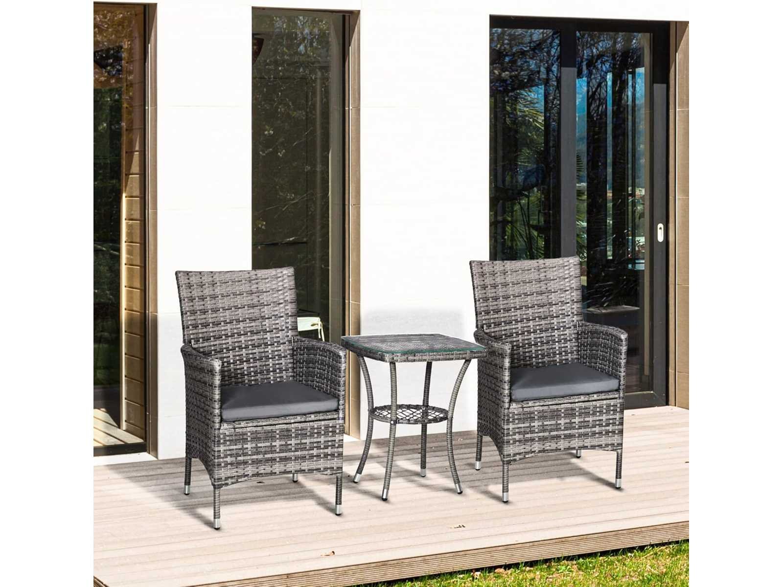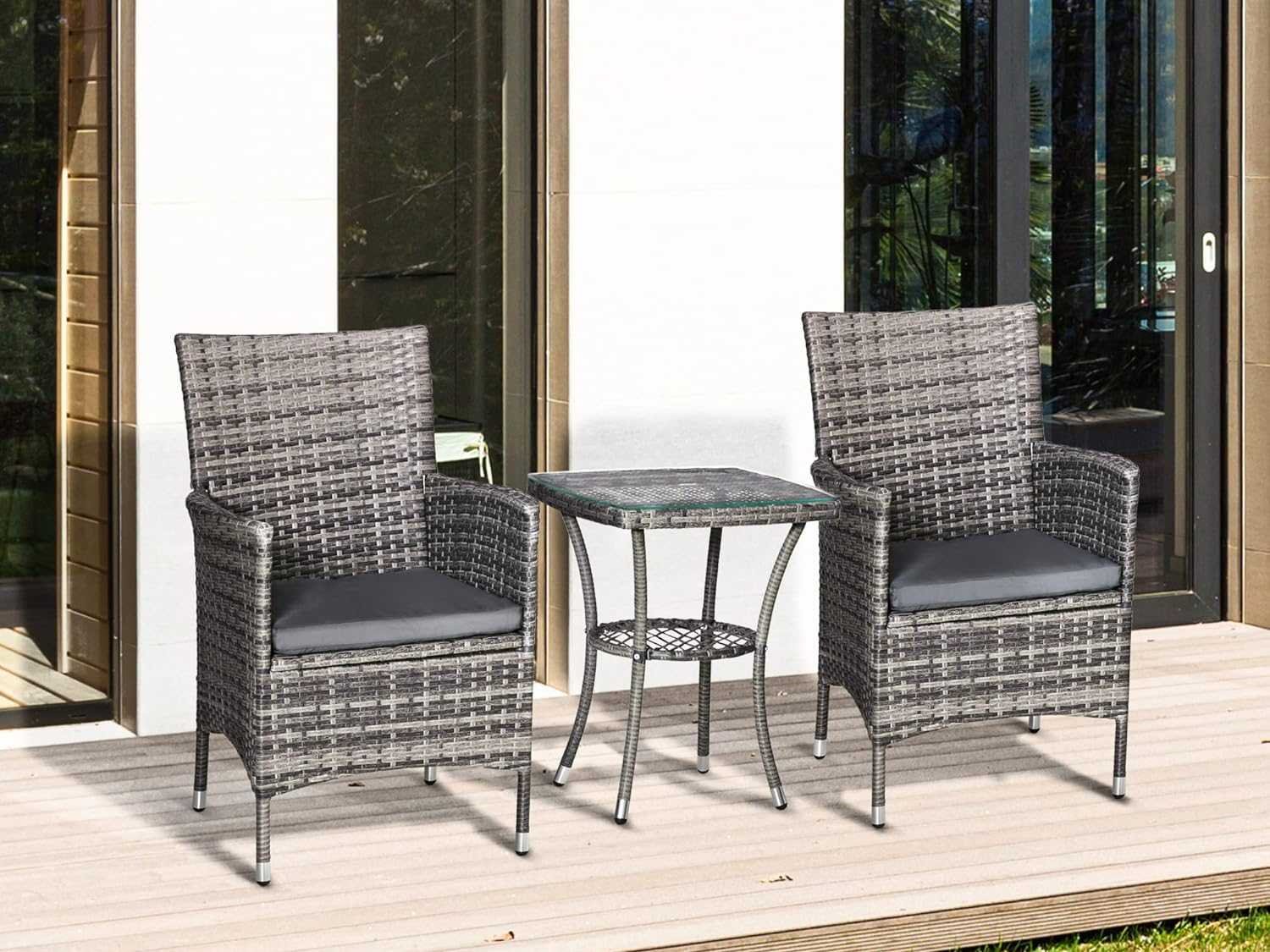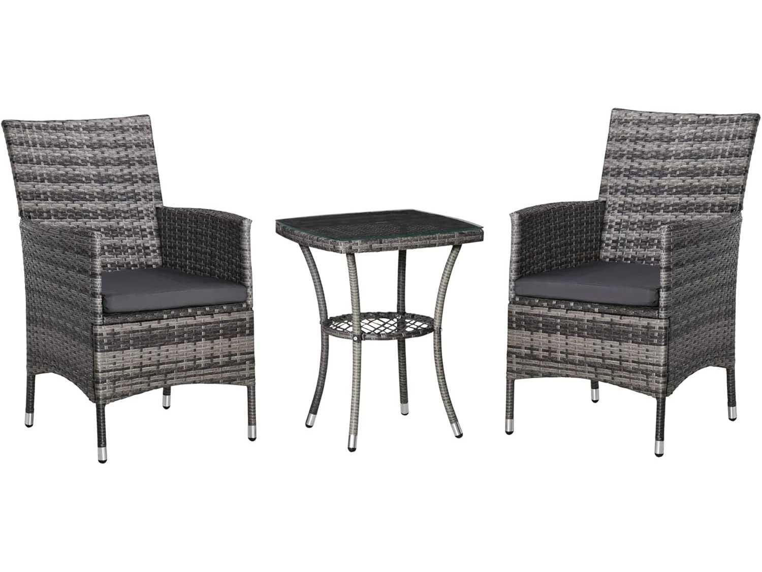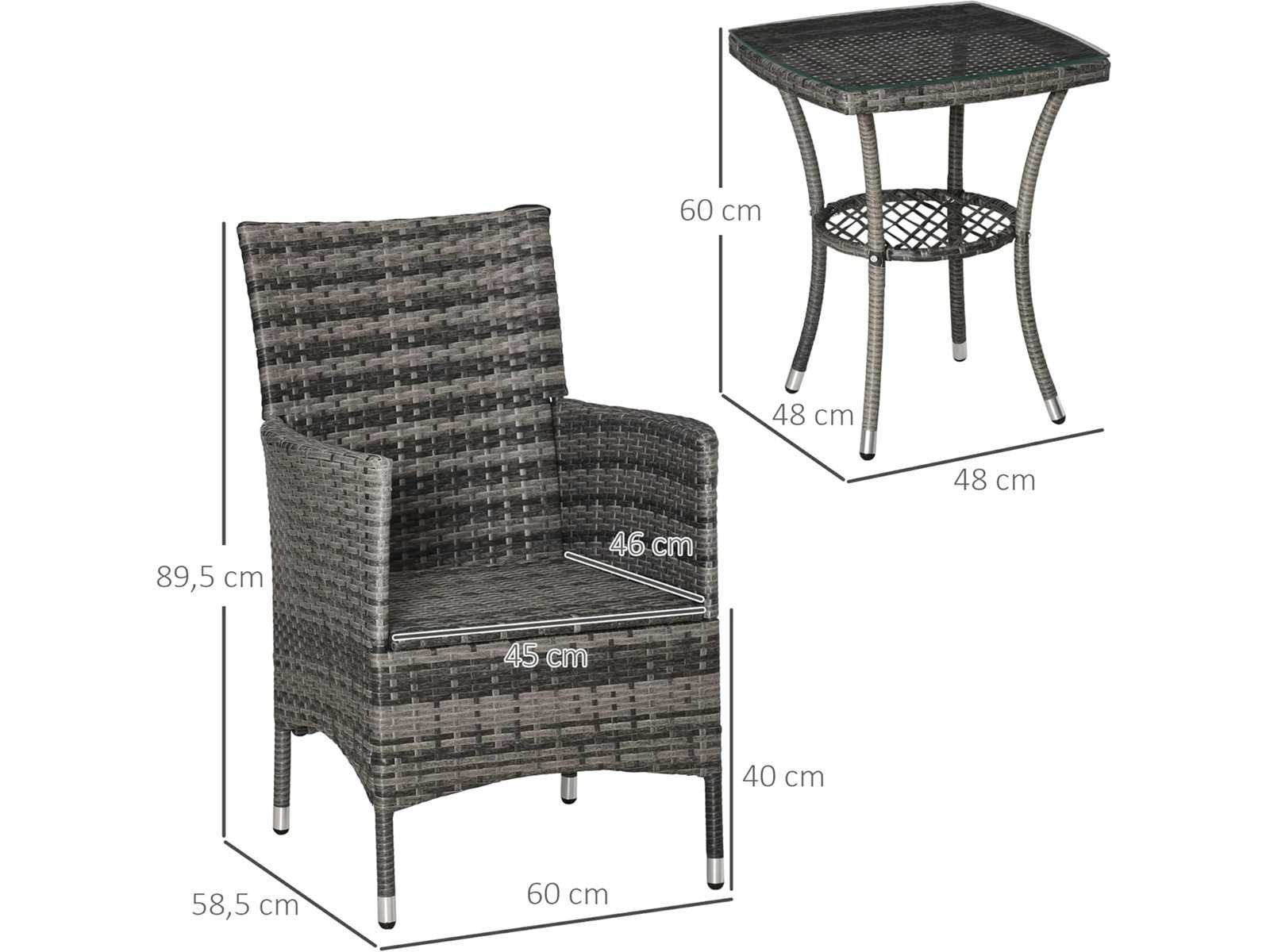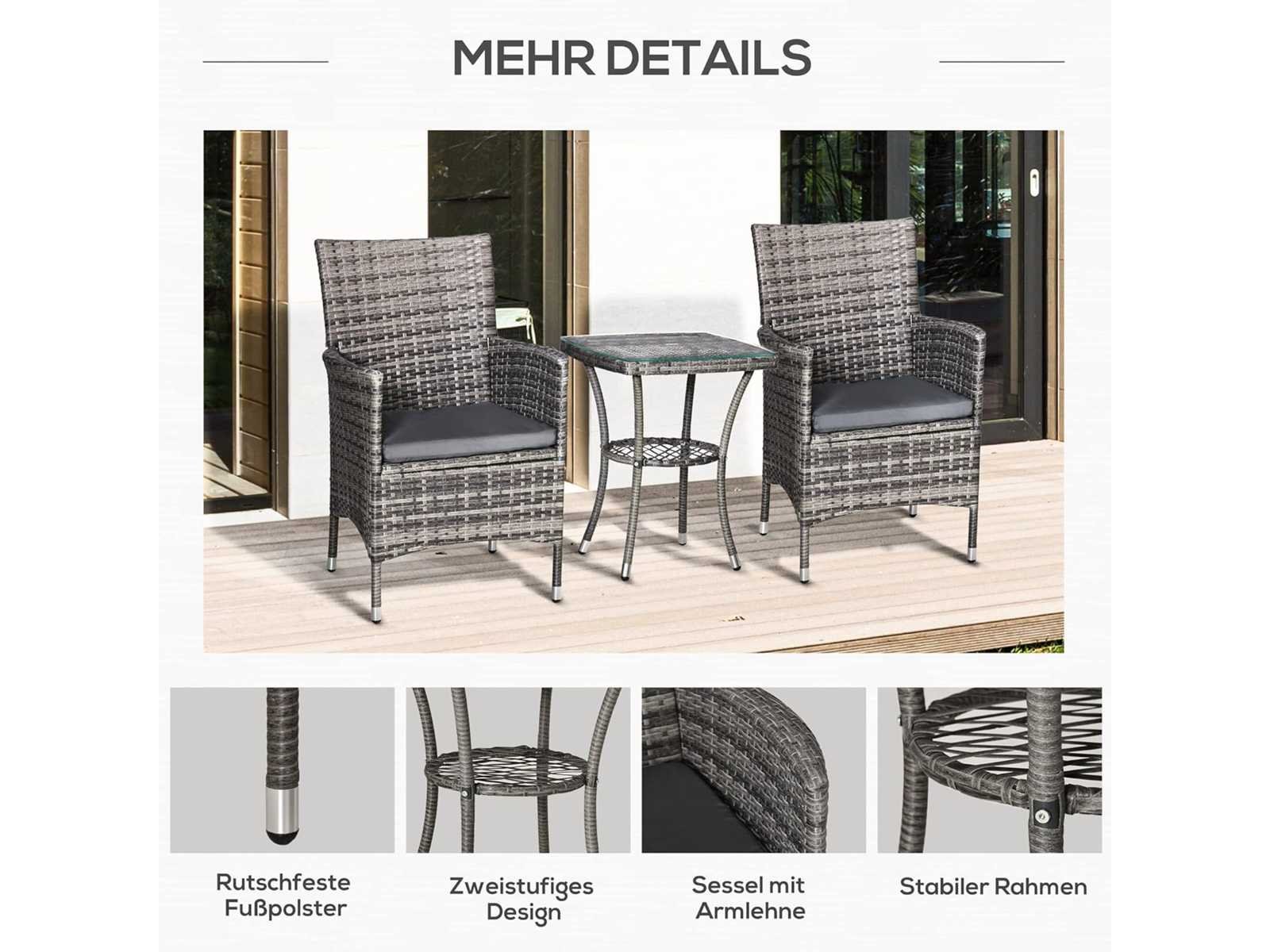 3-delige set: De balkonmeubelset voor binnen en buiten bestaat uit een tafel en twee stoelen. Robuust: De tafel en stoelen zijn gemaakt van stevige metalen frames, bekleed met water- en UV-bestendig PE-plastic met een rotan-uitstraling. De poten zijn gemaakt van roestvrij aluminium. Comfortabel: Twee dikke zitkussens zijn inbegrepen bij de levering. De wasbare hoezen kunnen met een rits worden geopend en verwijderd. Kluis: Het tafelblad van de Lounge tuinmeubelset is gemaakt van dik gehard glas. Productdetails: Totale afmetingen (B x D x H): 60 x 58,5 x 89,5 cm (stoel), 48 x 48 x 60 cm (tafel). Non