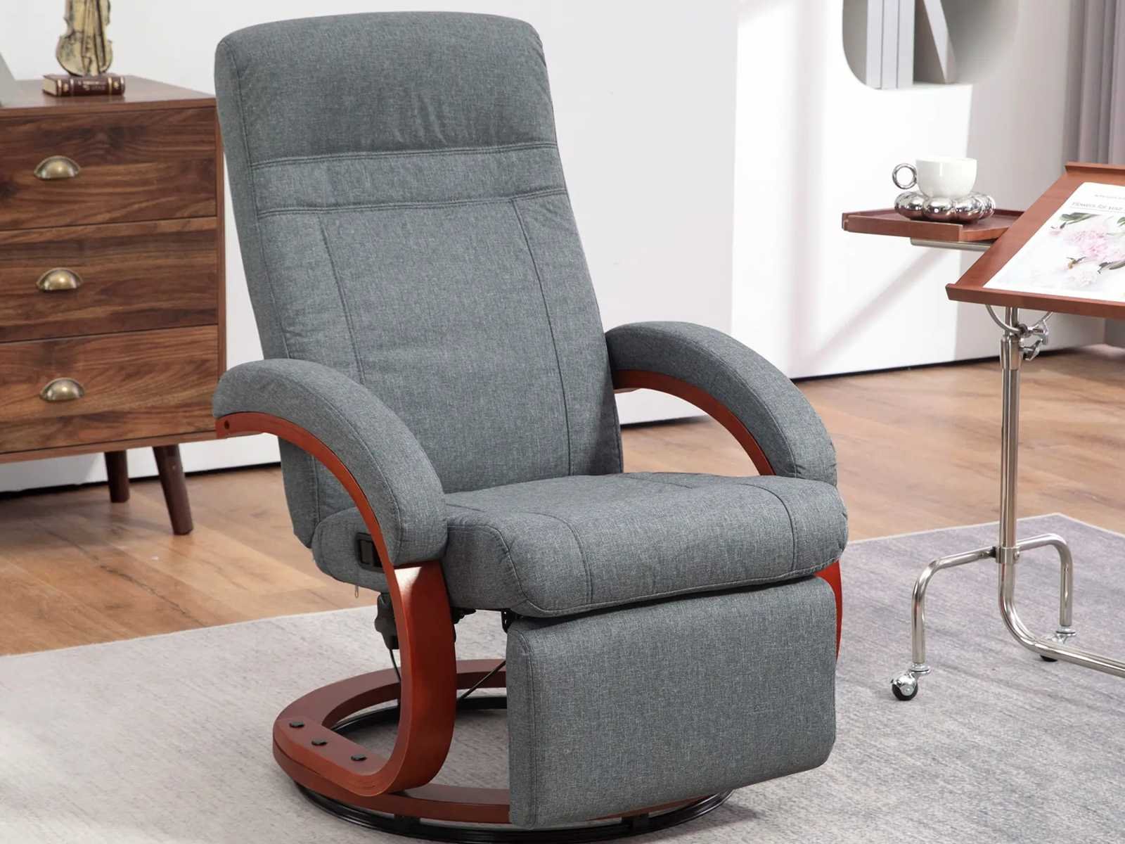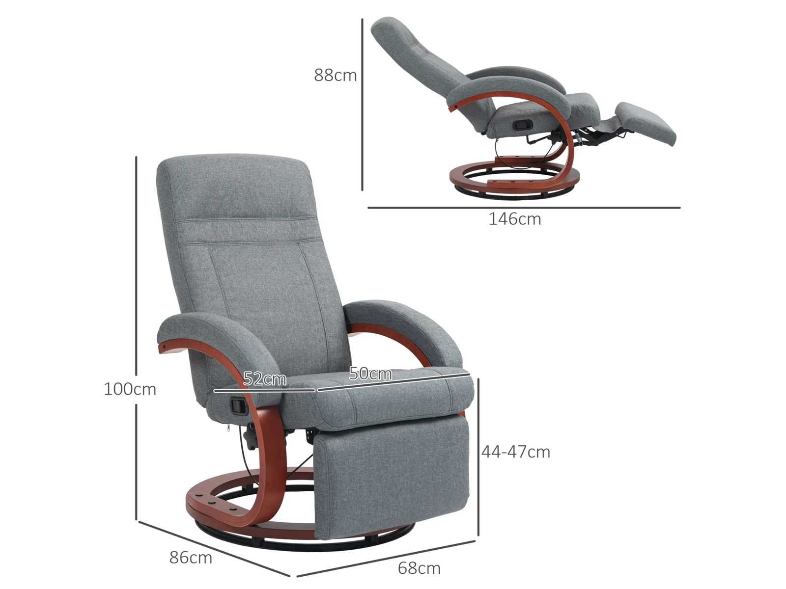Specificatie: Kleur: Grijs Materialen: Linnen (100% polyester), spons, meerlaagse plank, eucalyptushout Afmetingen in rechtopstaande positie: 68 cm (breedte) x 86 cm (diepte) x 100 cm (hoogte) Afmetingen in volledig achteroverliggende positie: 68 cm (B) x 146 cm (D) x 88 cm (H) Zitafmetingen: 50 cm (breedte) x 52 cm (diepte) x 44-47 cm (hoogte) Zitdikte: 10 cm Achterafmetingen: 75 cm (L) x 51 cm (B) x 65 cm (H) Rugdikte: 8 cm Armleuningafmetingen: 49 cm (L) x 8 cm (B) x 20 cm (H) Minimale afstand vanaf de muur: 0,8 m Laadvermogen: 140 kg Non