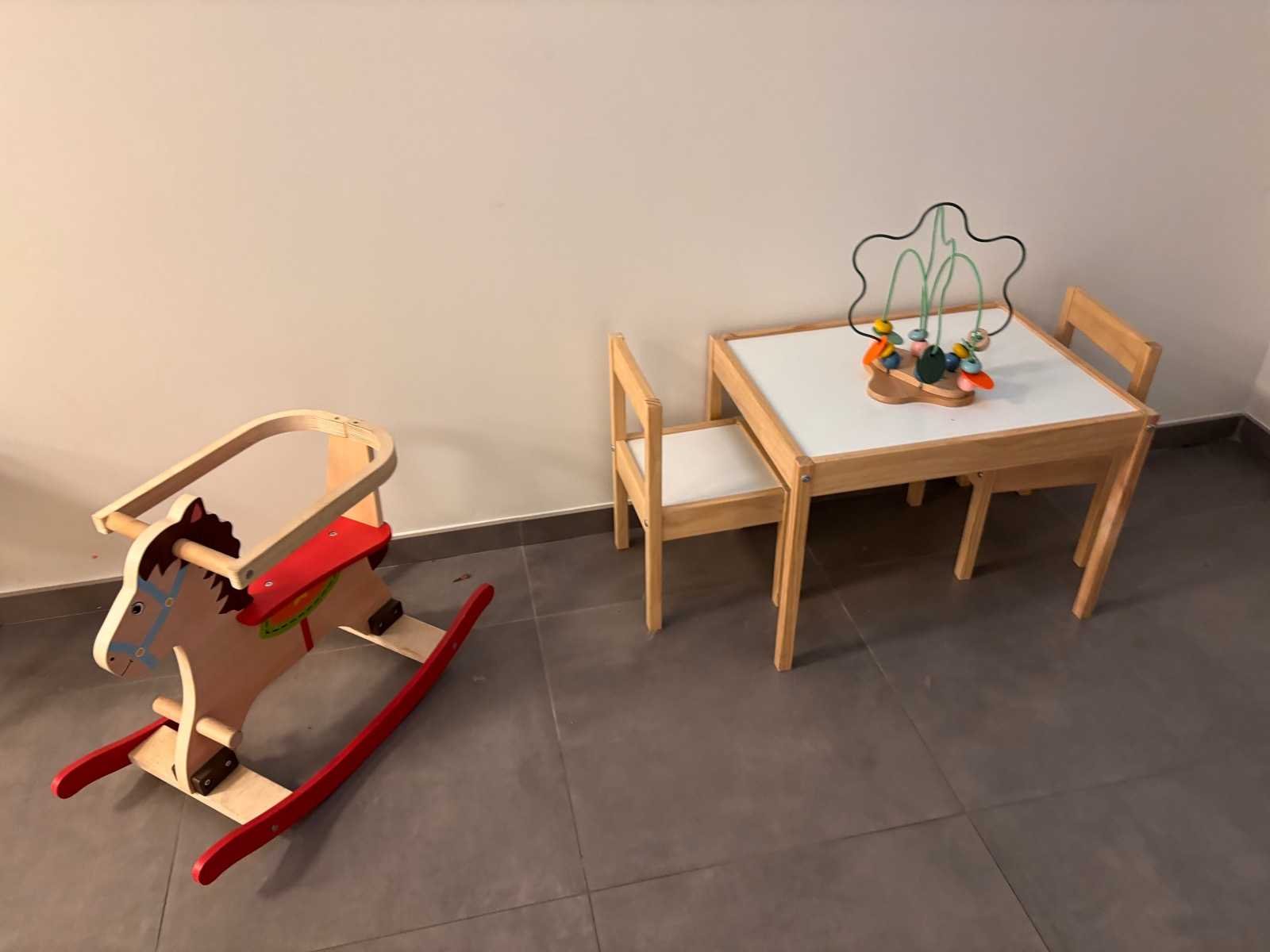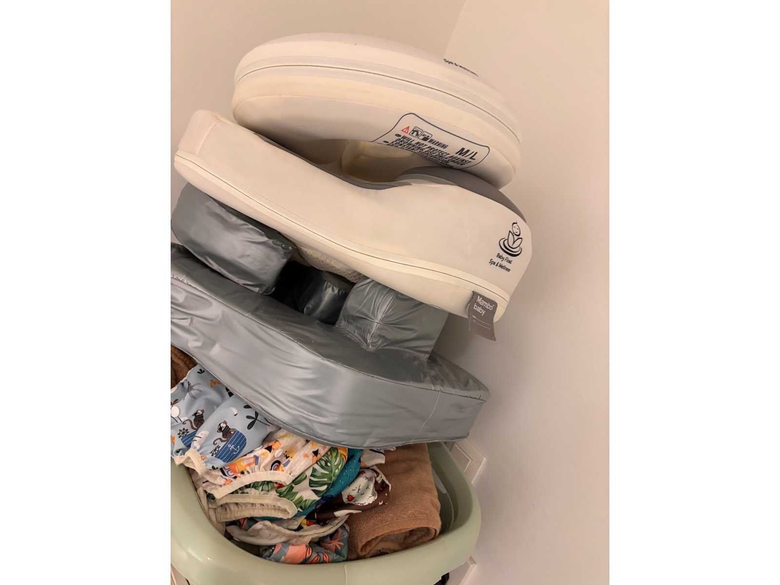 2 babyjacuzzi’s, 2 spiegels, 2 baby verzorgingstafels Ikea compleet met babykussen en accessoires, 2 stoelen met handdoekenrek Ikea Ragrund, 2 ronde bijzettafeltjes, 4 houten krukjes, 2 opvouwbare houten stoelen met geweven zitting, staande lamp met ronde, spiegelende lamp, 2 sfeerlampen/sterrenprojectoren, houten babypaard, houten kindertafel en 2 kinderstoeltjes, 2 kledingkasten Ikea Nordkisa in bamboe, partij van ca. 8 baby float drijfbanden waaronder 4 nekvlotters, partij decoratie waaronder wereldbol, 2 diffusers, zoutlamp en plant in pot, mobiele presenteermolen met ca. 20 baby speenclips, houten kapstok , 2 cadeauverpakkingen babyaccessoires, wasmachine Beko, droogkast AEG 55840, koffiezetapparaat Domo, draadloze steelstofzuiger Tristar, flessenverwarmer Philips Avent, ... No