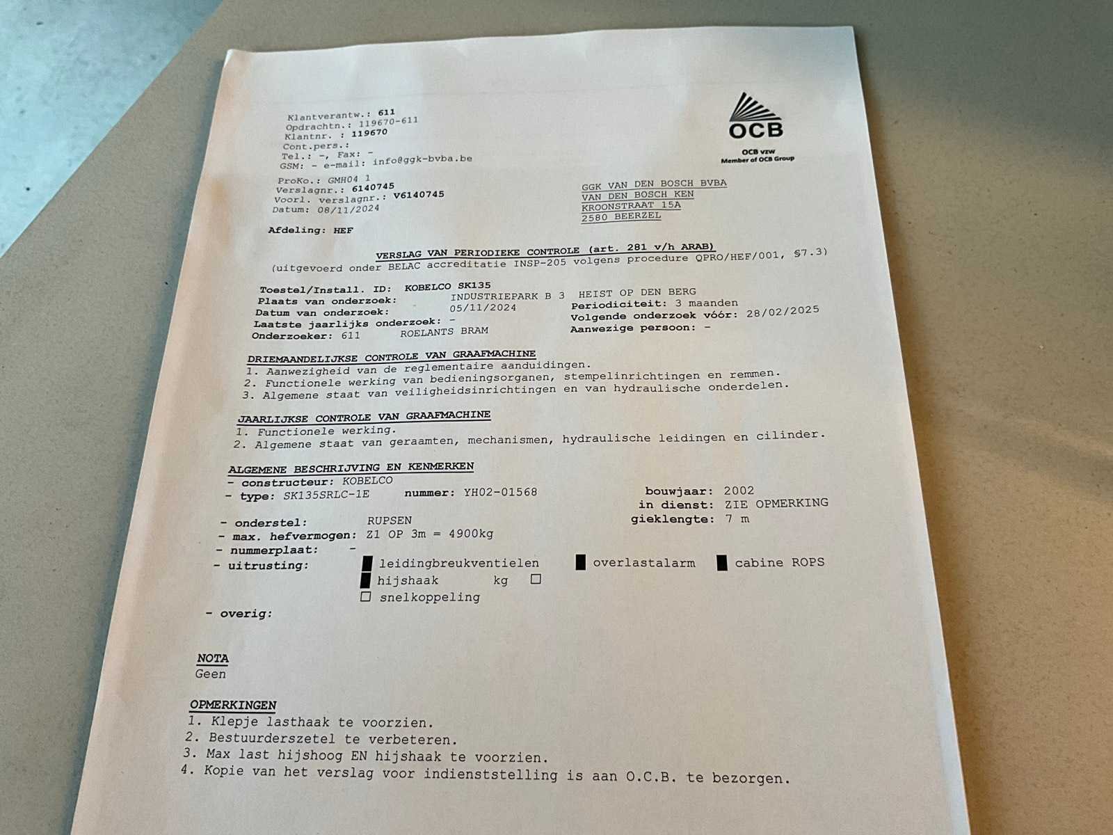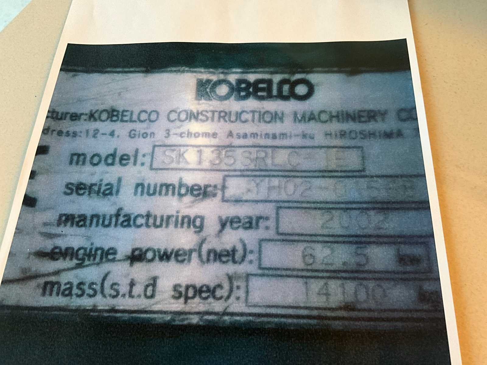 Verslag periodieke controle in bijlage. Maximaal hefvermogen : 4900 kg. Nee Merk: KOBELCO Type: SK135SRLC Bouwjaar: 2002 Gieklengte: 7000mm Max. werkbereik: 3000mm Met graafbak: true Graafbak afm. l: 650mm Graafbak afm. b: 1780mm Graafbak afm. h: 950mm Rups breedte: 700mm Cabine: true Afgelezen urenstand: 9709 Totale afmeting L: 3750mm Totale afmeting Breedte: 2750mm