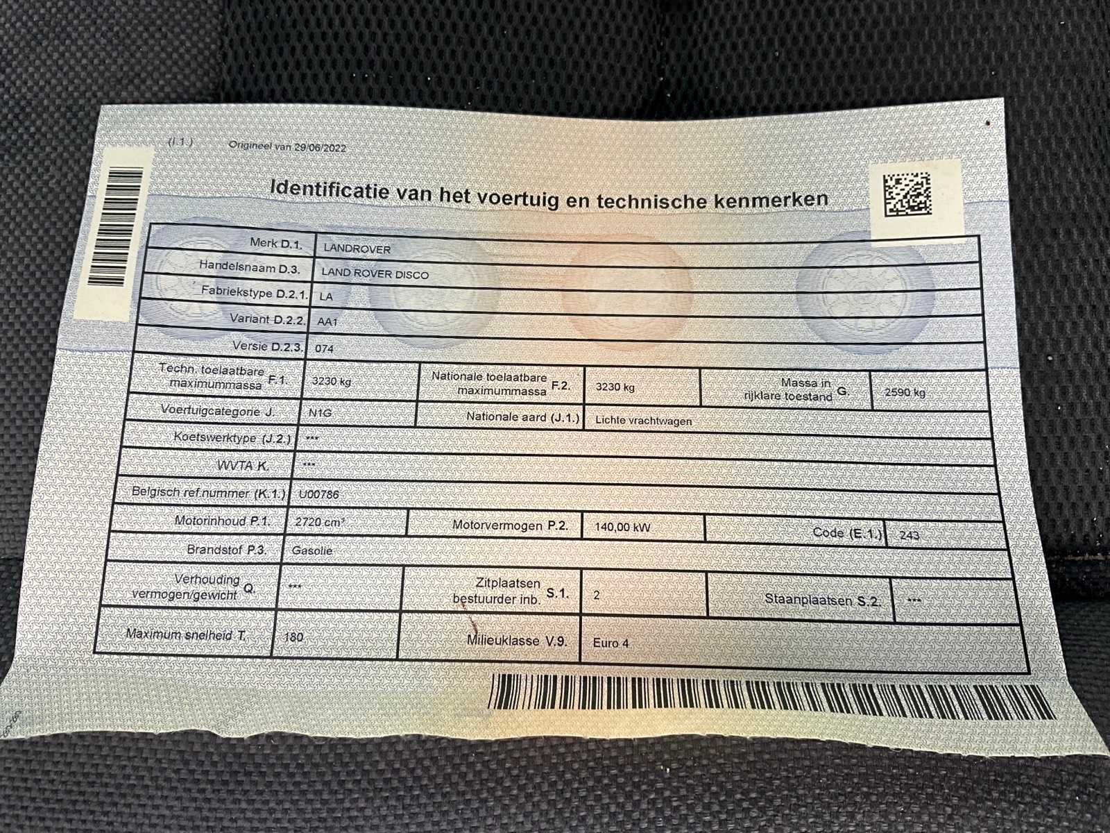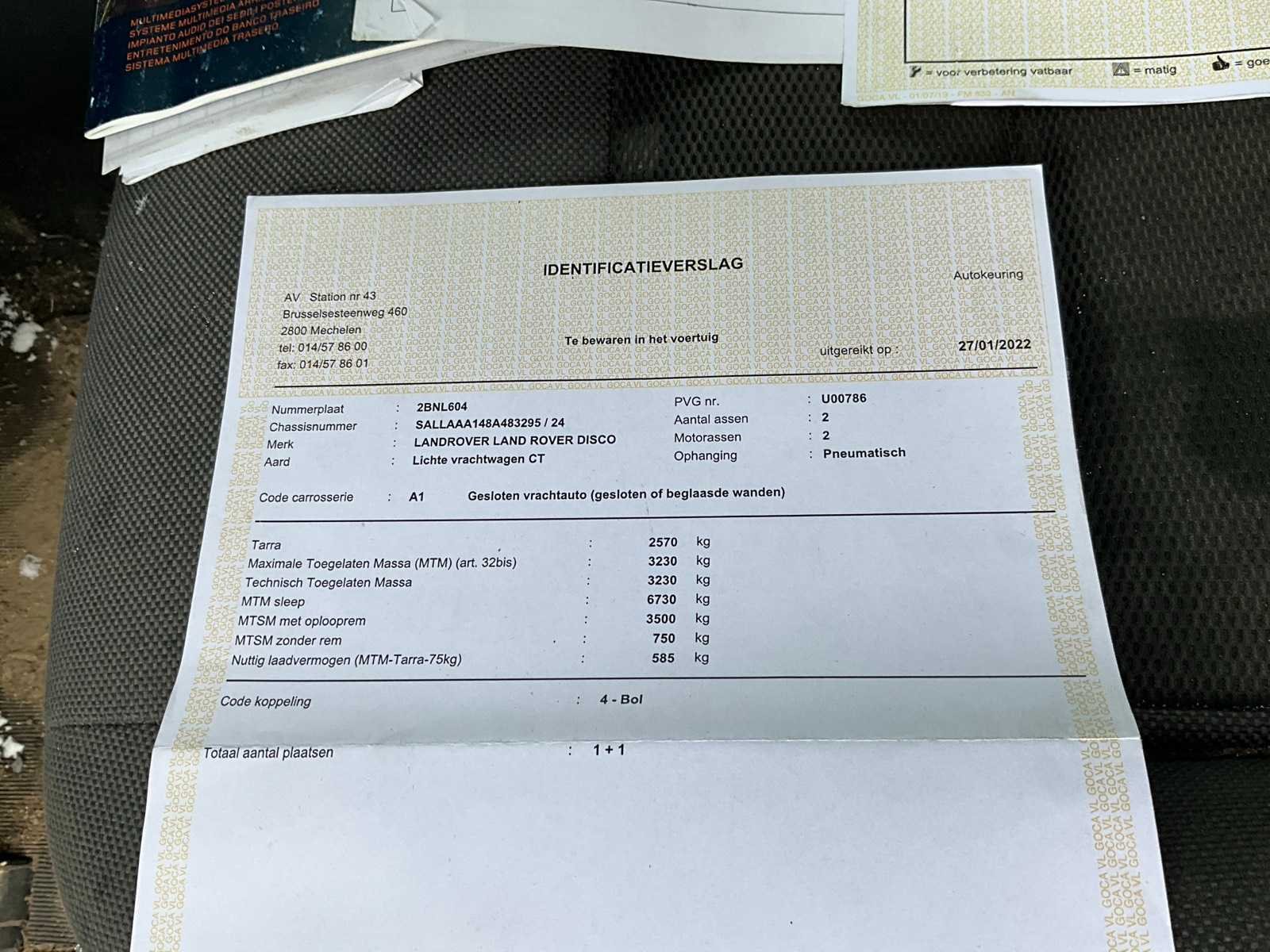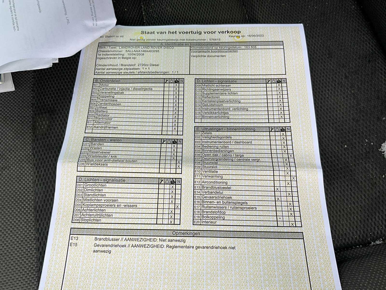 Kentekenbewijs Discovery 3 - deel I en II aanwezig, alsook gelijkvormigheidsattest, identificatieverslag en keuringsbewijs tot 16/06/2023. Opgelet km-stand werd genoteerd op 16/06/2022 bij technische controle. Voorzien van trekhaak. Nee Kenteken: 2CEZ472 Type: Landrover Disco LA Model: TDV6 SE Bouwjaar: 2008 Chassisnummer: SALLAAA148A483295 Afgelezen kilometerstand: 163505km Cilinderinhoud: 2720cc Vermogen (kW): 140kW Brandstof: diesel Datum eerste inschrijving: 10/04/2008 Aantal zitplaatsen: 2 Nationaliteit documenten: Belgisch Aantal deuren: 5 Laadvermogen: 3230kg Vermogen (pk): 140 Aantal cilinders: 2720 Emissieklasse: Euro 4 Kentekenpapieren compleet?: true Boorddocumenten aanwezig?: true Startinformatie: Batterij plat !
