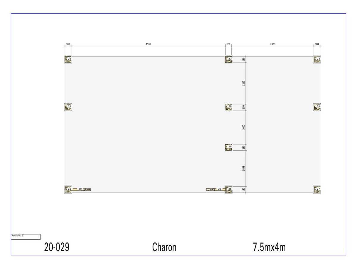 <li>Totaal afmeting pakket (transport): circa 5500x1200x800 mm </li><li>Kopmaat liggers: 180x60 mm, 130x130 mm, 80x70 mm en 89x38 mm </li><li>Aantal draagsteunen: 10 stuks </li><li>Kopmaat staanders: 180x180 mm </li><li>Referentie: Charon </li><li>Handleiding opbouw: aanwezig met QR code </li><li>Staat: ongebruikt, bouwpakket</li> Nee Model: 20-029 Gewicht: 1200kg Lengte: 750cm Breedte: 400cm Hoogte: 346cm Materiaal: Fijnspar