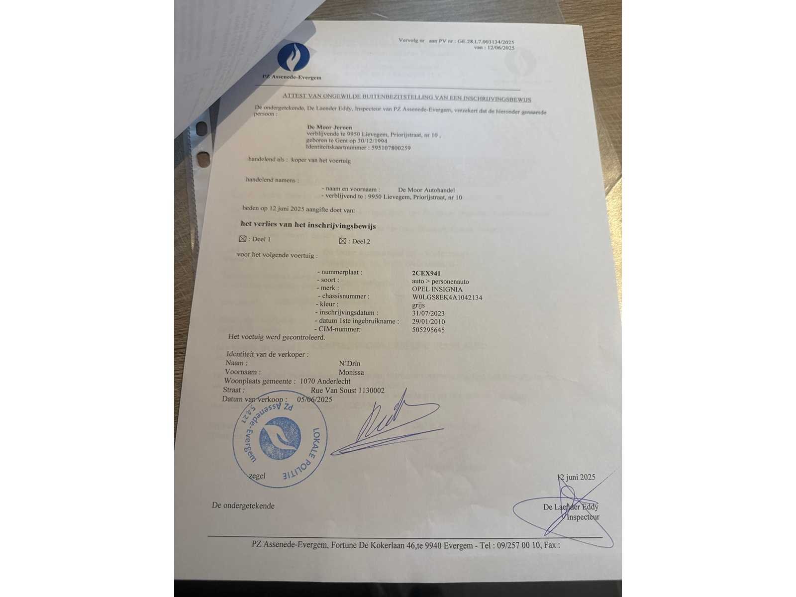 START EN RIJD GOED BOORDDOCUMENTEN ATTESTEN VERLIES POLITIE Nee Merk: OPEL Model: INSIGNIA Type: BREAK Bouwjaar: 2010 Afgelezen kilometerstand: 158000km Cilinderinhoud: 1998cc Chassisnummer: W0LGS8EK4A1042134 Datum eerste toelating: 29-01-2010 Kleur: GRIJS Transmissie: MANUEEL Emissieklasse: 5 Aantal deuren: 5 Aantal sleutels: 1 Nationaliteit documenten: BELGIE Carpass: true Start en rijdt: JA Andere boorddocumenten: ATTEST VERLIES POLITIE startinformatie : JA Inschrijvingsbewijs - deel 1 : ATTEST VERLIES POLITIE Inschrijvingsbewijs - deel 2: ATTEST VERLIES POLITIE